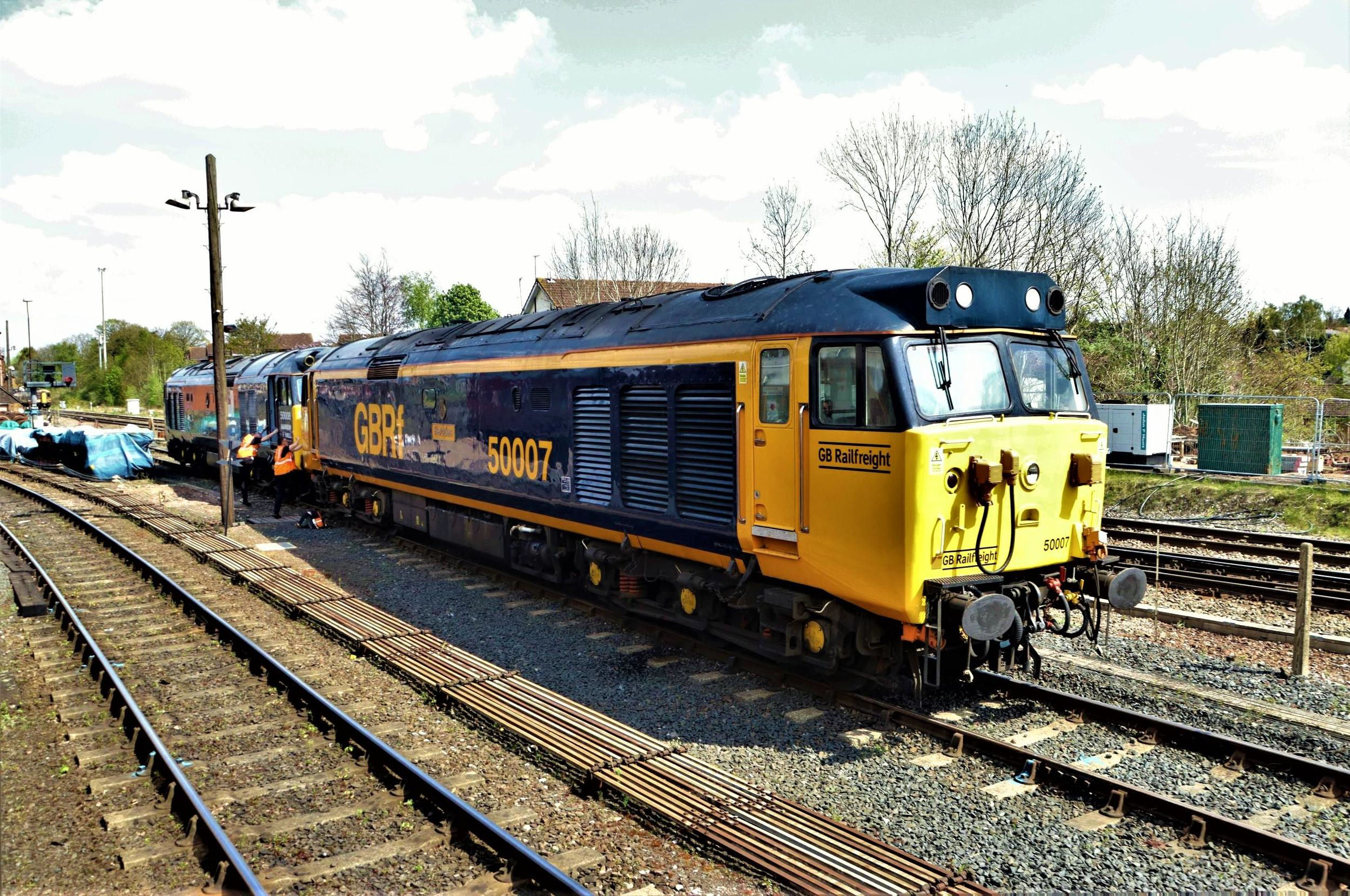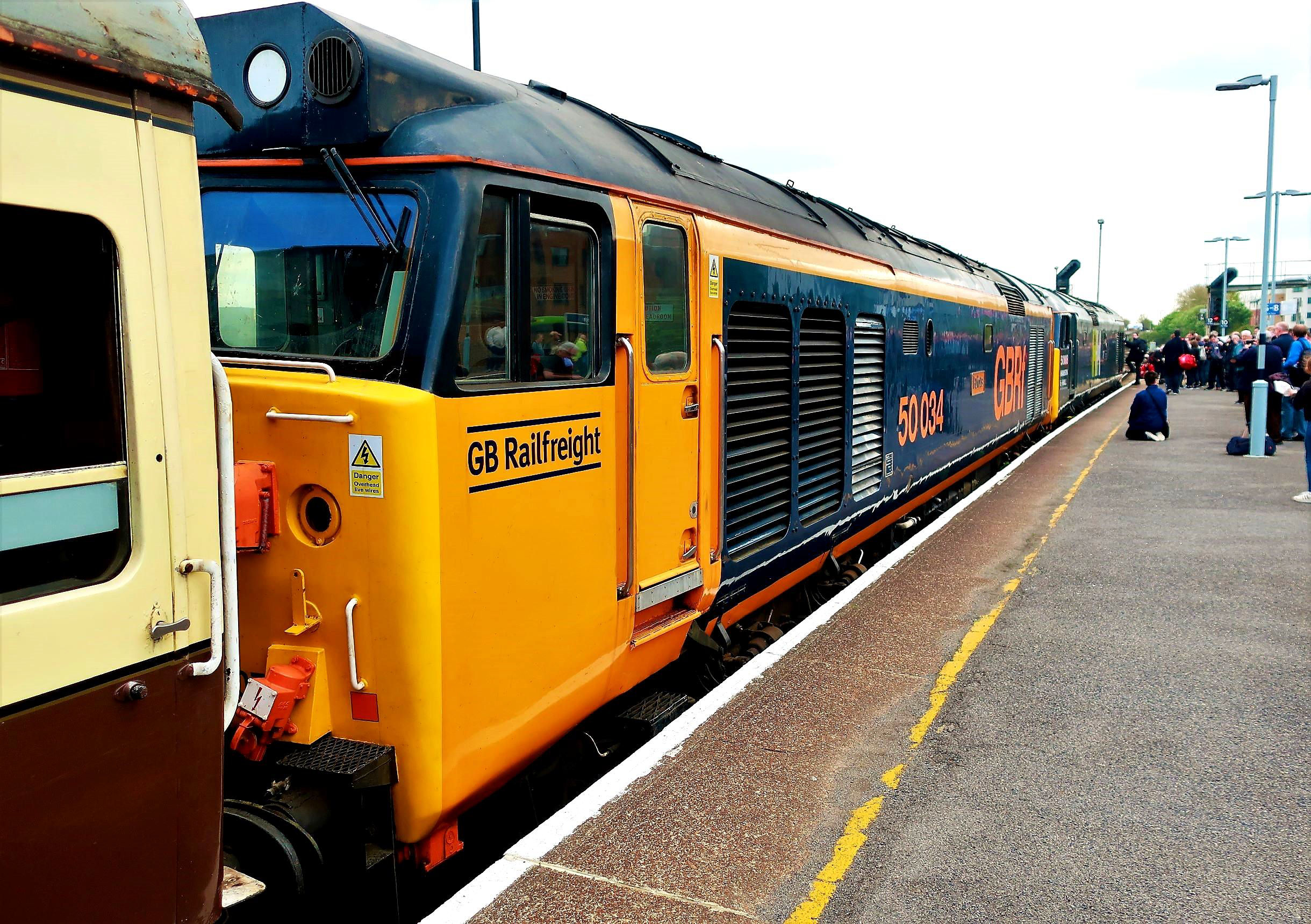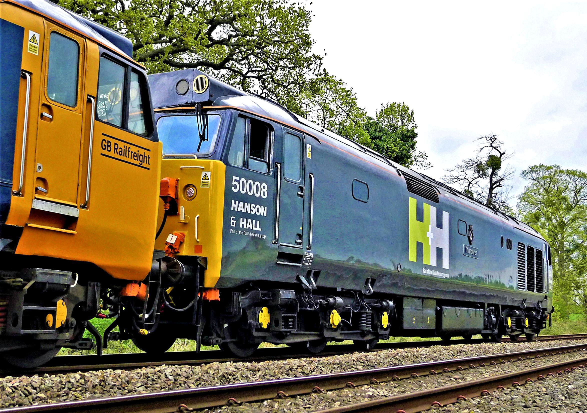 50007 (renumbered 50034)+50008 on 1Z50, the 11.02 Burton-on-Trent to Eastleigh 'The Honeybourne Hoover' at Eastleigh.
