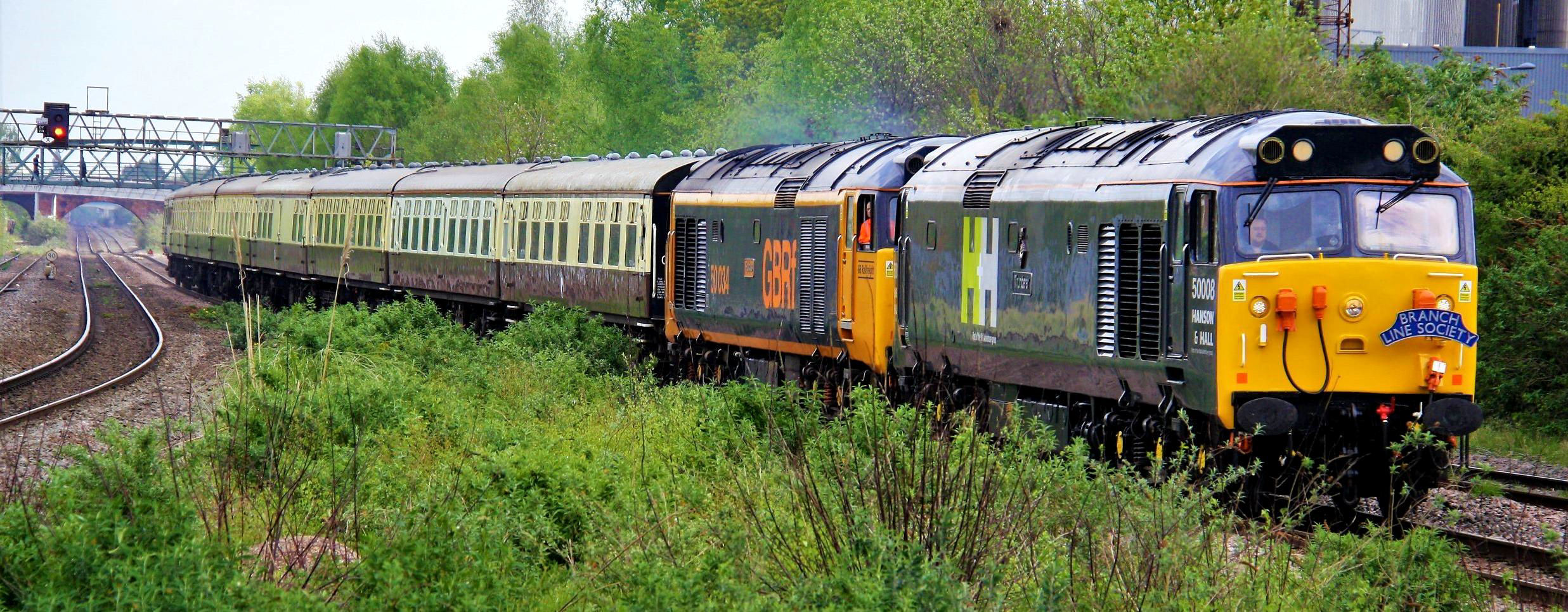 Bang on time 50008 in Hanson & Hall livery (complete with full sized BLS headboard) heading 50007 (masquerading as 50034, was anyone furious?) in GBRf livery rolled in with eight Mk1 coaches in chocolate and cream. This was the first of the day's bonuses, as the tour advertising had suggested the locos would be 'top & tail' (they were all day Saturday), so with both on the front and multied up both would count for haulage. With everyone efficiently loaded departure was on time, running as 1Z50.