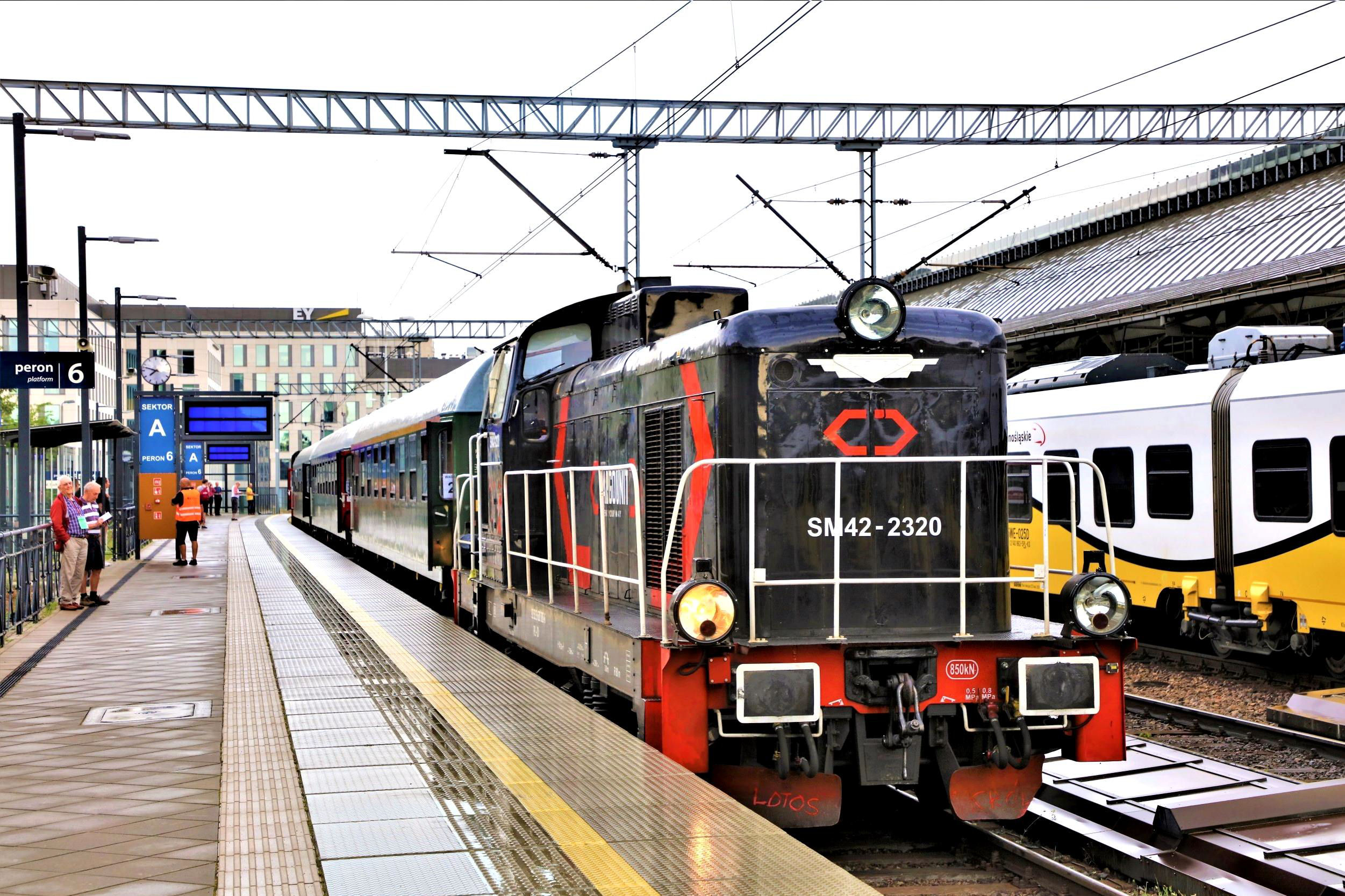 Day 2, a wet morning at Wrocław Główny P6 as our tour waits to leave.
