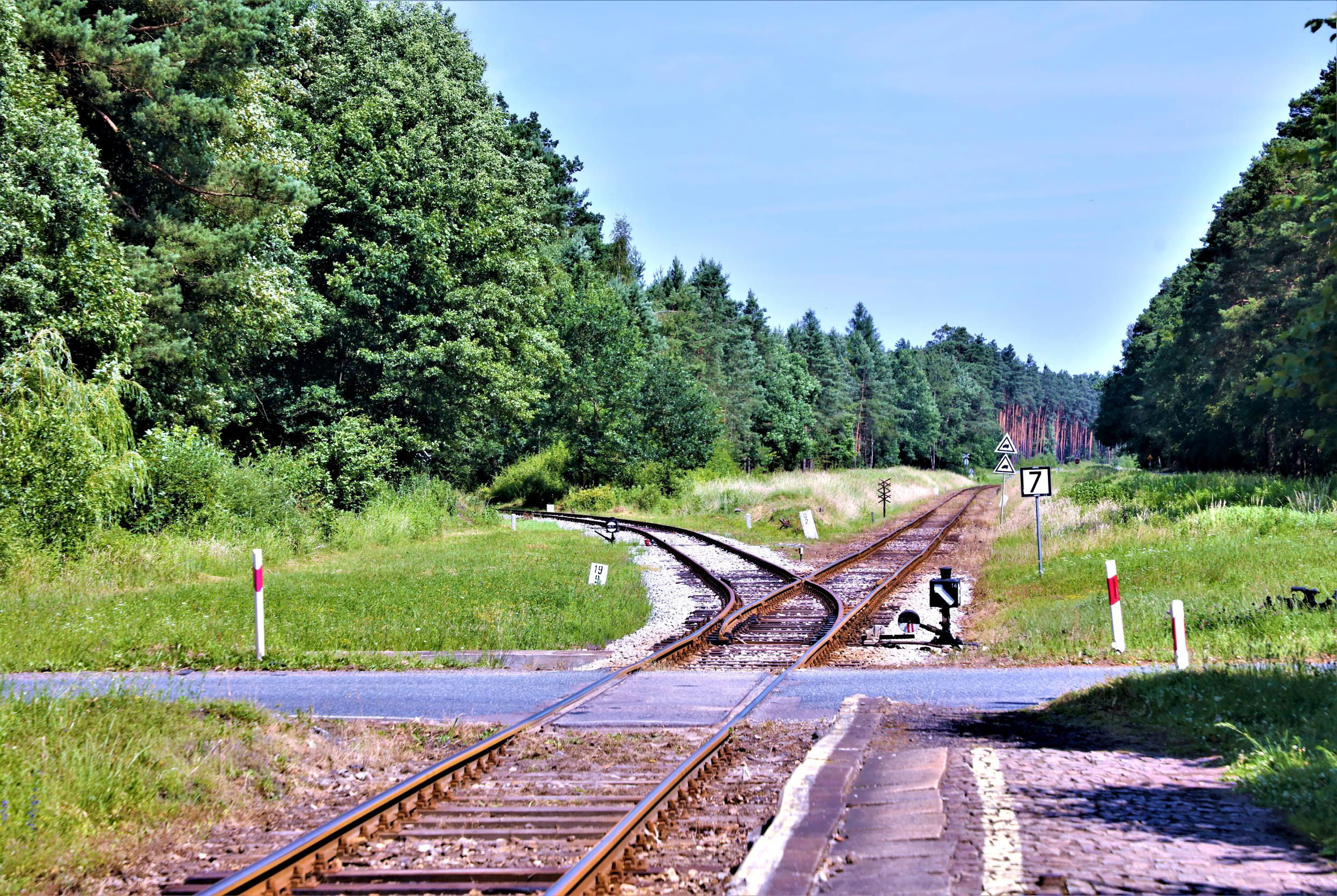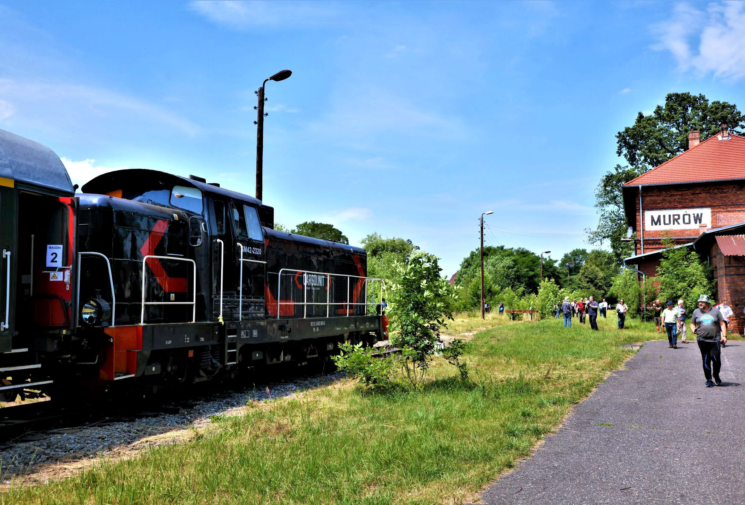 However, we were not destined to cover all of this line but went much rarer by turning left at the country junction of Jełowa. In fact, historically we were staying on the main line (still Line 301) - the passenger line onwards is a subsidiary route (293). As soon as we had the points changed and a frantic few photos done, we did in fact go onto some billiard table smooth continuously welded rail across beautifully fettled culverts as this line ROG in 2017 for new sawmill traffic after several million Złoty had been spent. [The Złoty, worth about 20p and rising - not the Euro - is the official currency and legal tender of Poland, the most traded currency in Central and Eastern Europe; it ranks 22nd in the foreign exchange market.] The only snag on this line is that the timber transhipment facilities were never built, not even a run round loop, hence our 'top & tail'. We did however collect a lot of arboreal products proceeding at a very leisurely pace along the branch as the trees entered and departed the compos leaving twigs and many leaves! After this trundle through the woods, we eventually glided to a halt near the buffers just short of the still extant Murów station. The station buildings are all intact and occupied; after a while the inhabitants probably wondered why so many people were walking up and down their lawn - the station platform! The tracks beyond were briefly traced to the level crossing north of the station buildings and could be seen disappearing into the trees beyond. This once main line ran to Namyslów some 29km distant and 9km were allegedly opened at the other end for military traffic but, like the timber traffic here, it does not seem to have materialised. The line in between has been subject to those mobile freelance metal appropriation and recycling specialists and, as this is the largest village in the area with about 5,000 people, reopening to passengers does not look at all likely.