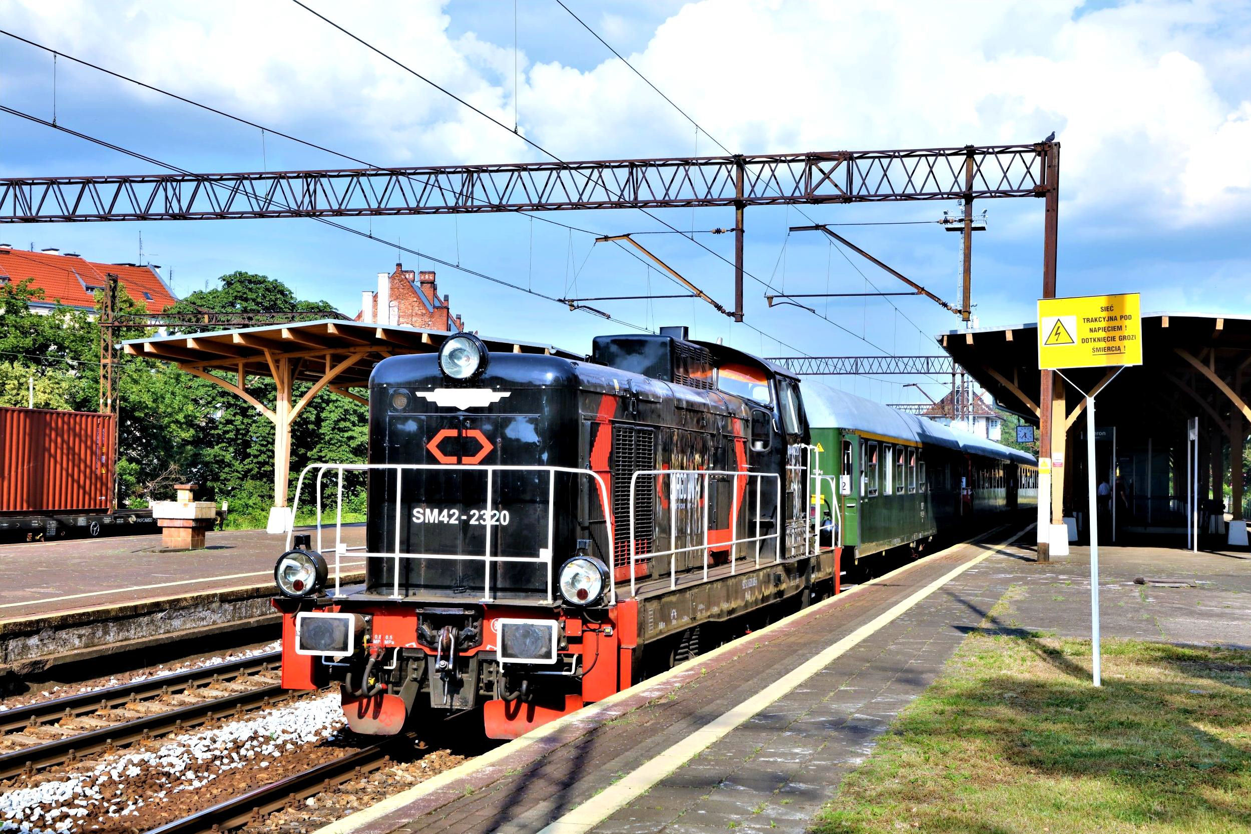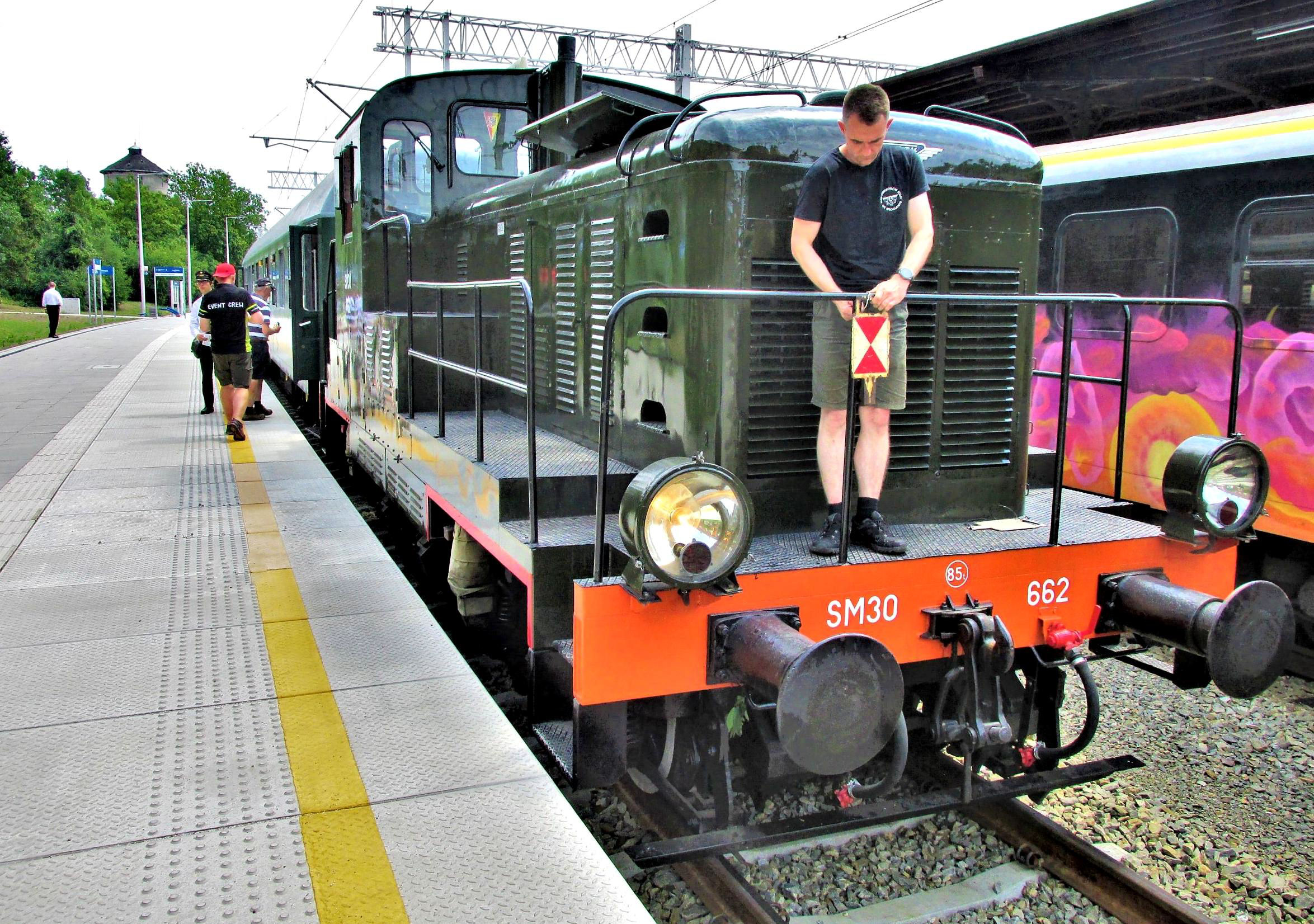Today was unique among the five days in that we would be 'top & tailed', in addition to the SM 42... today Cargo Unit 2320, we had a diminutive SM30 662, mainly to operate on the Murów branch of which more later. The SM30 once numbered over 900 and have a 300hp engine with a top speed of about 37mph (60kph) so a sort of Class 08 on steroids which must have been fun pathing although, as it turned out, even when it was leading the SM42 provided most of the power! Interestingly the little rectangular 'last vehicle' plates were wired onto the end rails of the tail loco before we left. This is the Polish equivalent of our tail lamps and has two equilateral red triangles, their bases along the top and bottom (narrow sides of the rectangle) with their apexes meeting at the centre. The rest of the plate is two larger isosceles white triangles, their longer bases each side, apexes at centre.