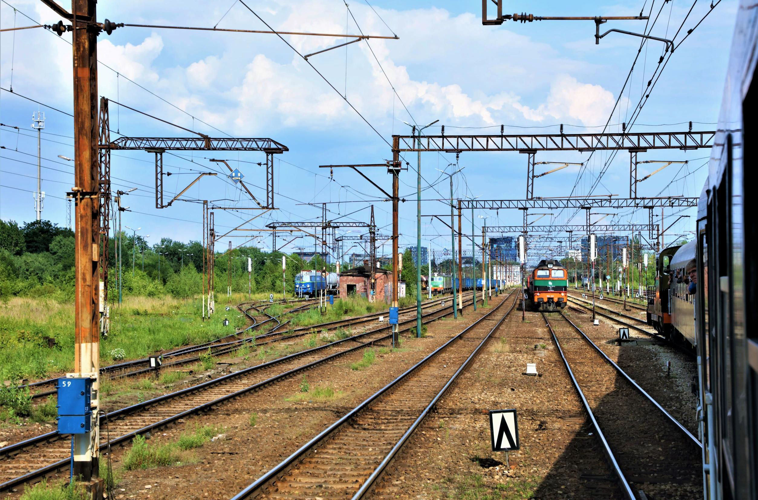 Then it was all back aboard, lunch, and the same route back to Wrocław that we had come down the day before via Jelcz-Laskowice. We deviated from this beyond Wrocław Nadodrze where we went straight on and dived under the Poznań main line 750 on Line 752 obtaining the radial freight route towards Legnica at Wrocław Gądów and headed for a reversal at Wrocław Lesnica. This tidy but unremarkable suburban station hosted us for about 20 minutes in the heat of the afternoon. Then we headed back to Wrocław Nowy Dwor and swung right onto EGTRE entry Line 758 through Wrocław Muchobór making for the old terminus at Wrocław Swiebodzki (which now doubles as a weekend market and nightclub) except, on reaching the junction, we encountered STOP boards in the 4ft and without a stutter swung right towards Wrocław Główny! Immediately this routing caused some conjecture, various rumours of points failure and the chap responsible for said board placement being a bit too keen to get them in before the Sunday Market? Either way we didn't reach Wrocław Swiebodzki and the boards remained days later. Information after the tour revealed that it was actually due to emergency repair work to one of the main line bridges over the line beyond the junction which caused the line to be blocked to all traffic. At most we could only have gone 500m from the junction so obviously the driver knew but participants didn't, that feedback issue again. Using Line 273, we continued to Wrocław Główny (P6 once more) and reversed towards Wrocław Zachodni, where we reversed again in the loops beyond the station to join route 751, an outer radial route to access Gądów Yard from the Jelenia Góra line. Then it was onwards on Line 752 under the main line towards Wrocław Nadodrze and, after a wait and more photos in low evening sun, we reversed again.