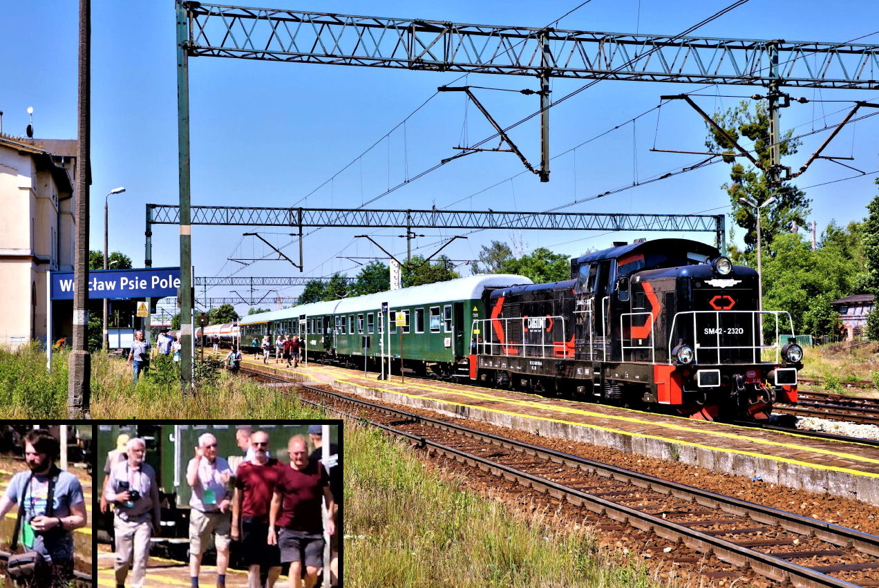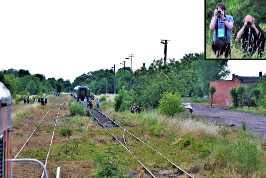 Reversing at Wrocław Psie-Pole station. INSET: An enlargement of some of participants stretching their legs (not everyone needed enlarging).