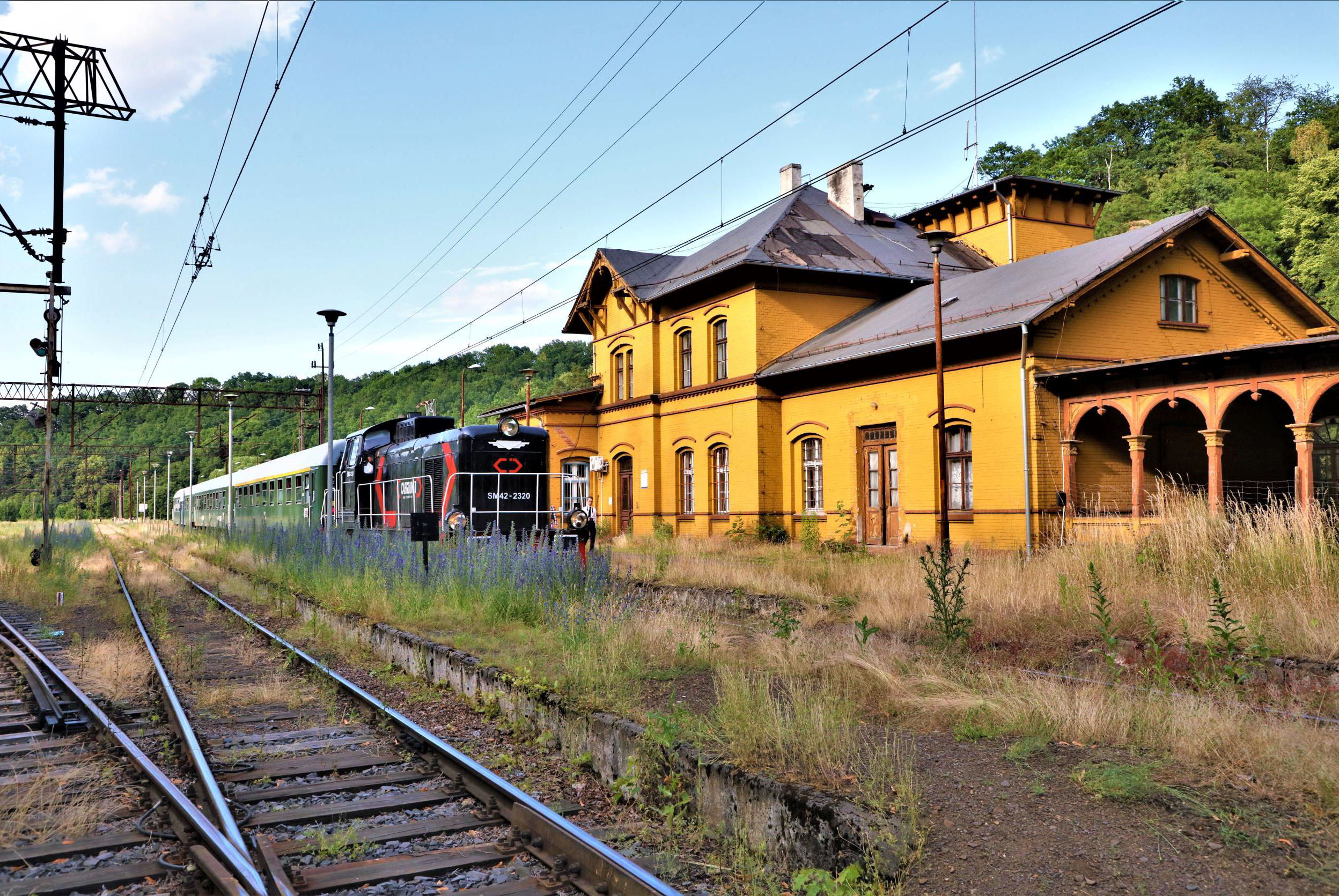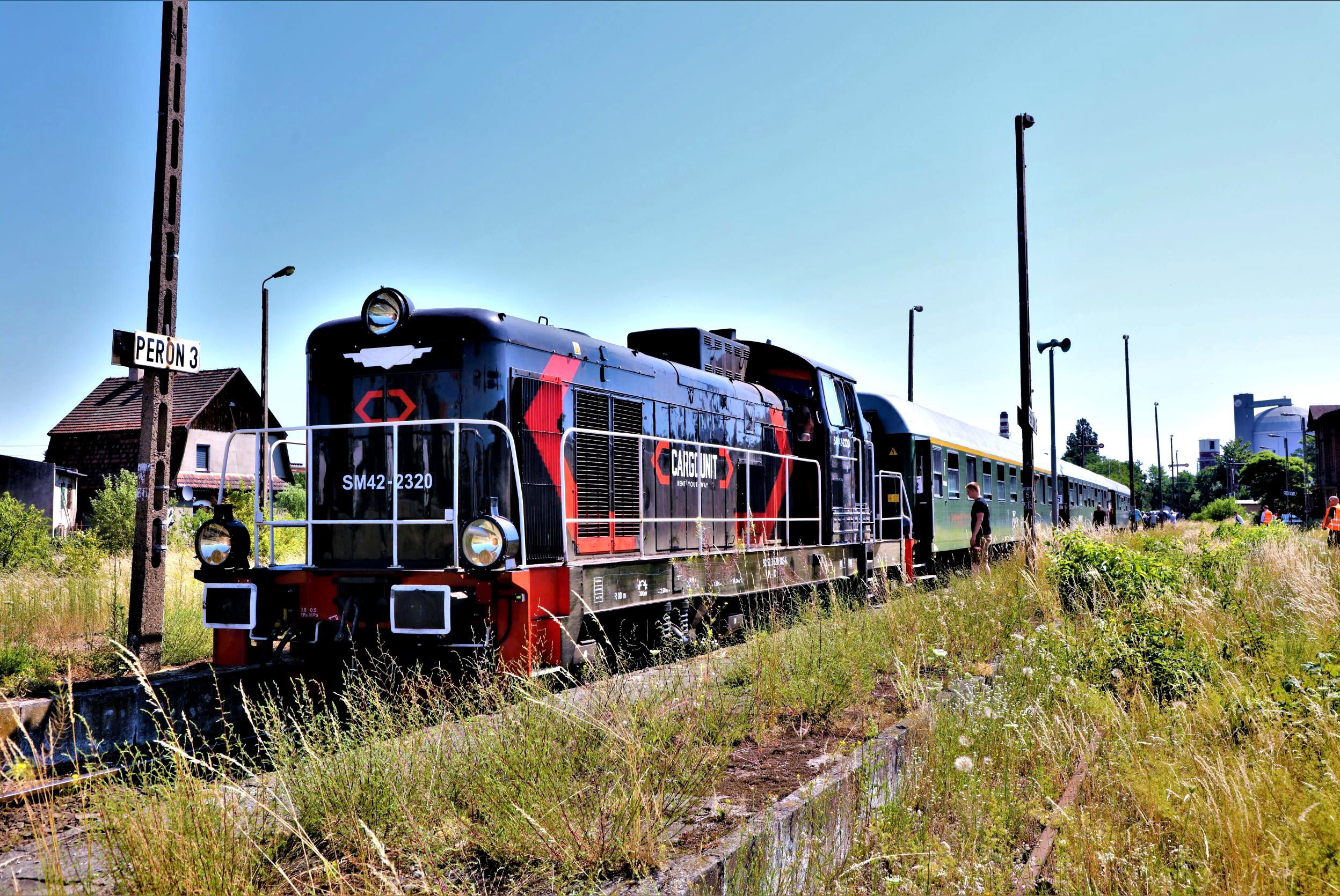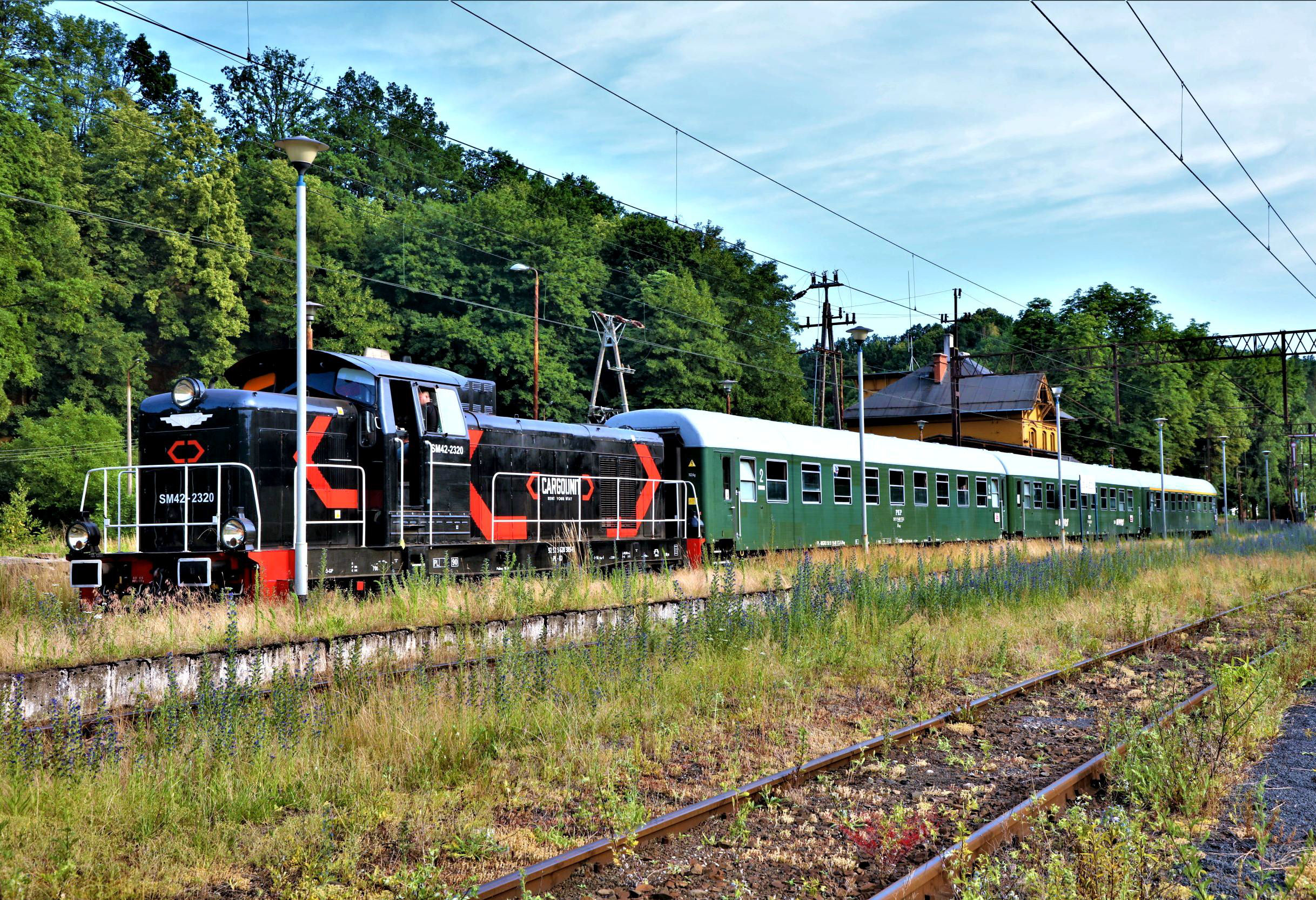 Our tour headed back towards Legnica which, for a large station, was impressively decrepit last time your correspondent passed this way. Now it is undergoing a very comprehensive rebuild (but is still 'work in progress') including the superb overall roof. It has to be said that on several occasions in Poland recently the standard of quite intricate restorations including statues, mouldings and brickwork is evidently to the highest standards. In fact the quality of materials and workmanship in some places might well exceed the original! Reversal here allowed a quick ice cream purchase from the shop in the subway as the day was again sweltering. The formalities over, we set off down the 24km freight line to Jerzmanice Zdrój (Zdrój = Spa) which remains open for sand traffic. It closed as a through route in 1995 and apart from a flicker in 2008-2009 hasn't seen passenger trains since 1996. That experiment failed as the line is, despite being electrified (!), very slow and can't even compete with local buses.