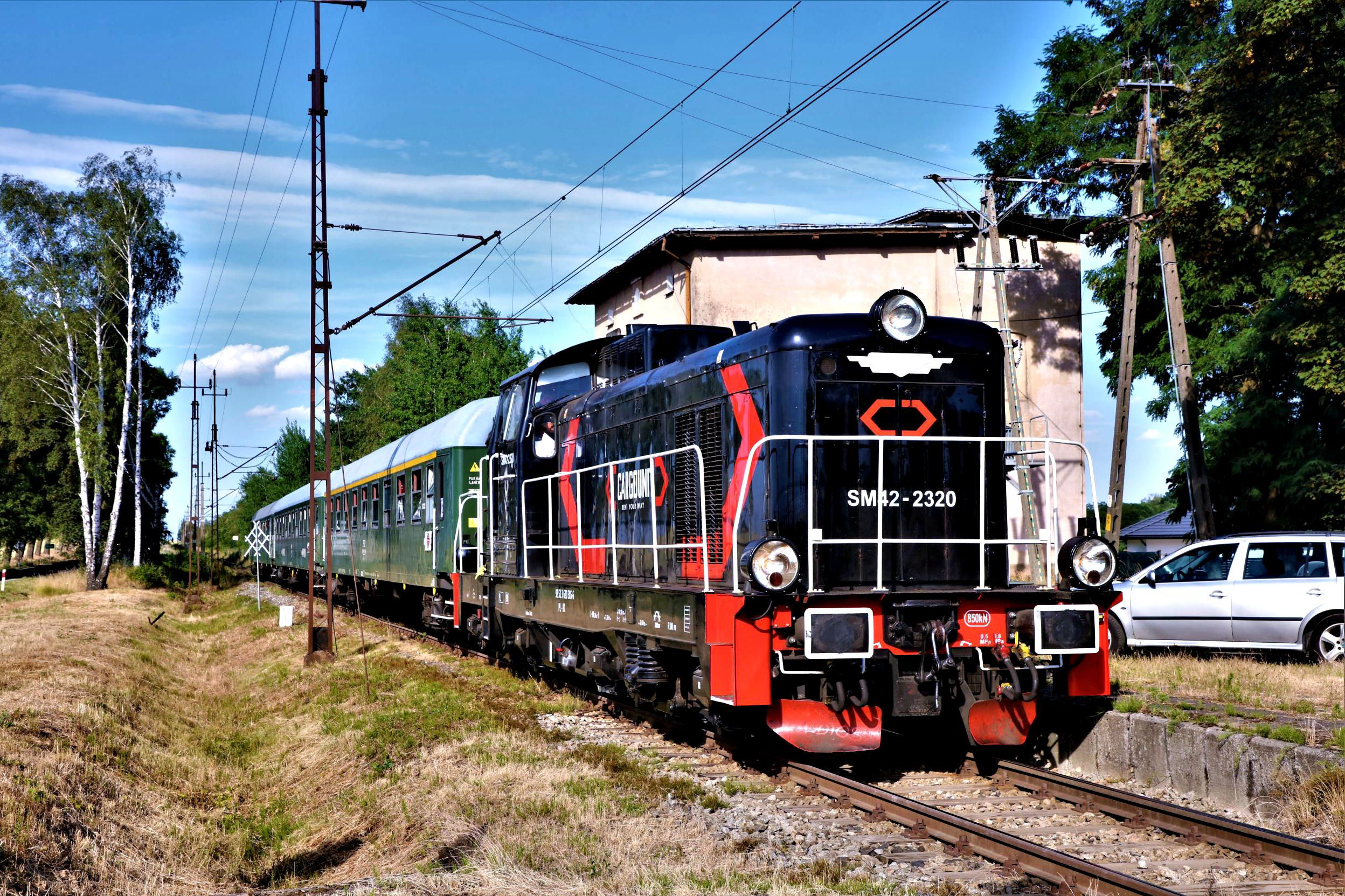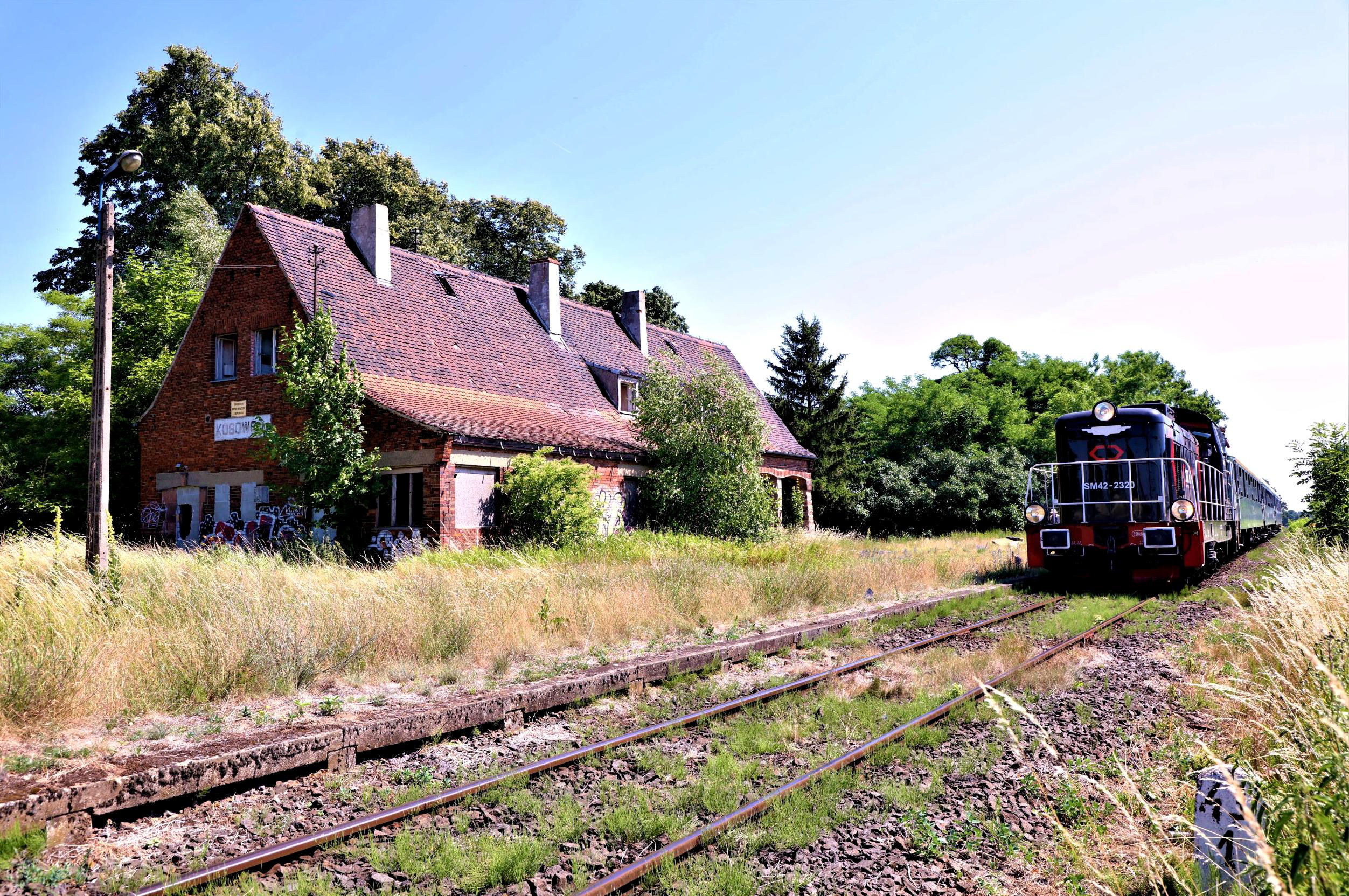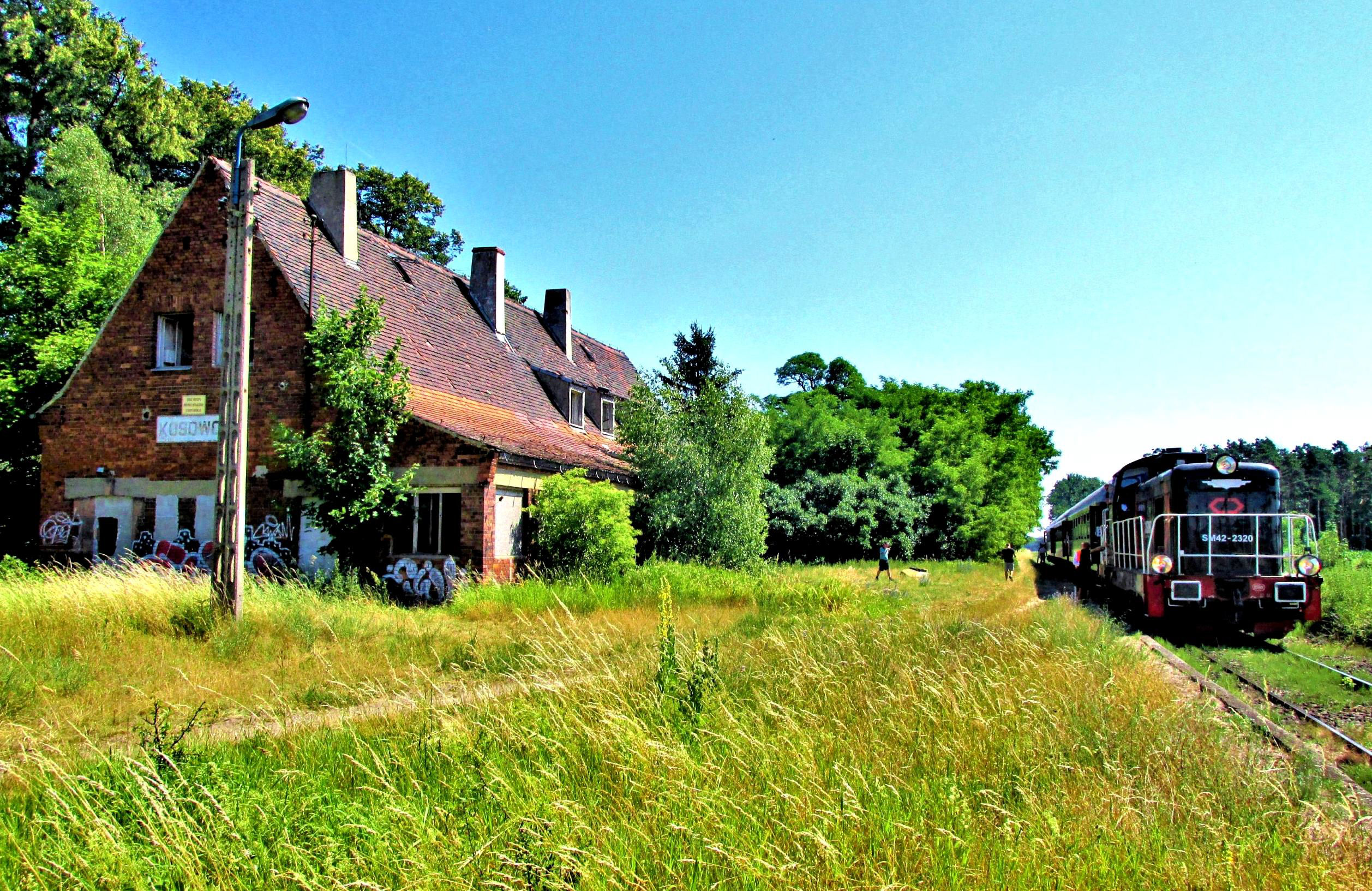 Kosowo Wkp; our Silesian Explorer railtour stands at this remote former station (see report for details) in the middle of a wilderness. Kosowo Wlkp has a population of 490 ... none of whom appear to live anywhere near the station ... how on Earth did it close‽