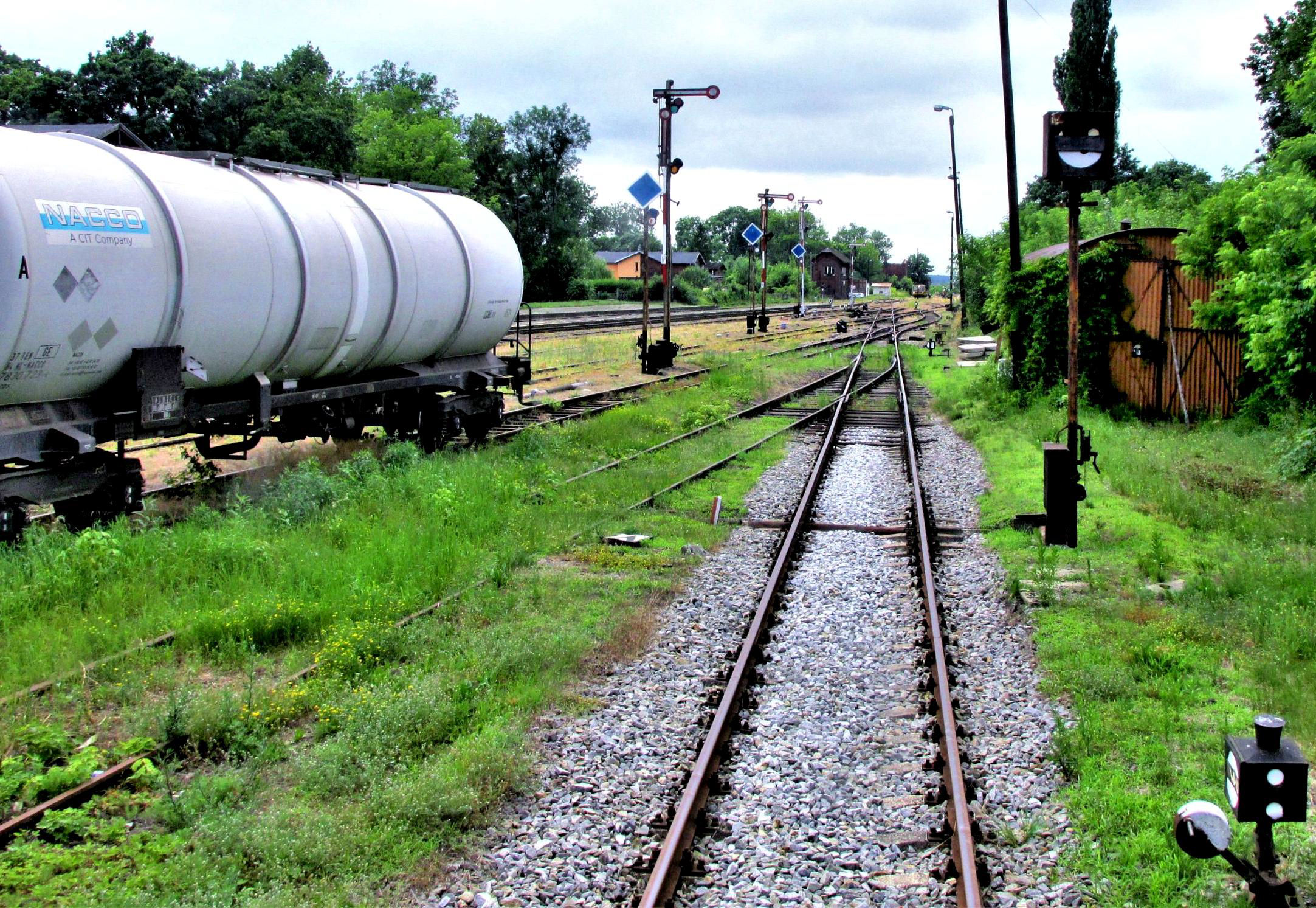 When it had a through passenger service (to Opole), trains terminated on the line with a footbridge across to the station building but all traces of that and any platform had long gone. The route became a 35km branch overnight in 1997 when the line beyond Krapkowice over the River Odra was taken out by massive floods, affecting a great swathe of this and several nearby countries. Your reporter remembers being in the Czech Republic then, not staying overnight anywhere and having no mobile in those days, being perplexed by the sudden absence of overnight trains for some kippage to Slovakia - it was cut off by the floods! So, this line went from a through route to a branch, with all traffic ending.