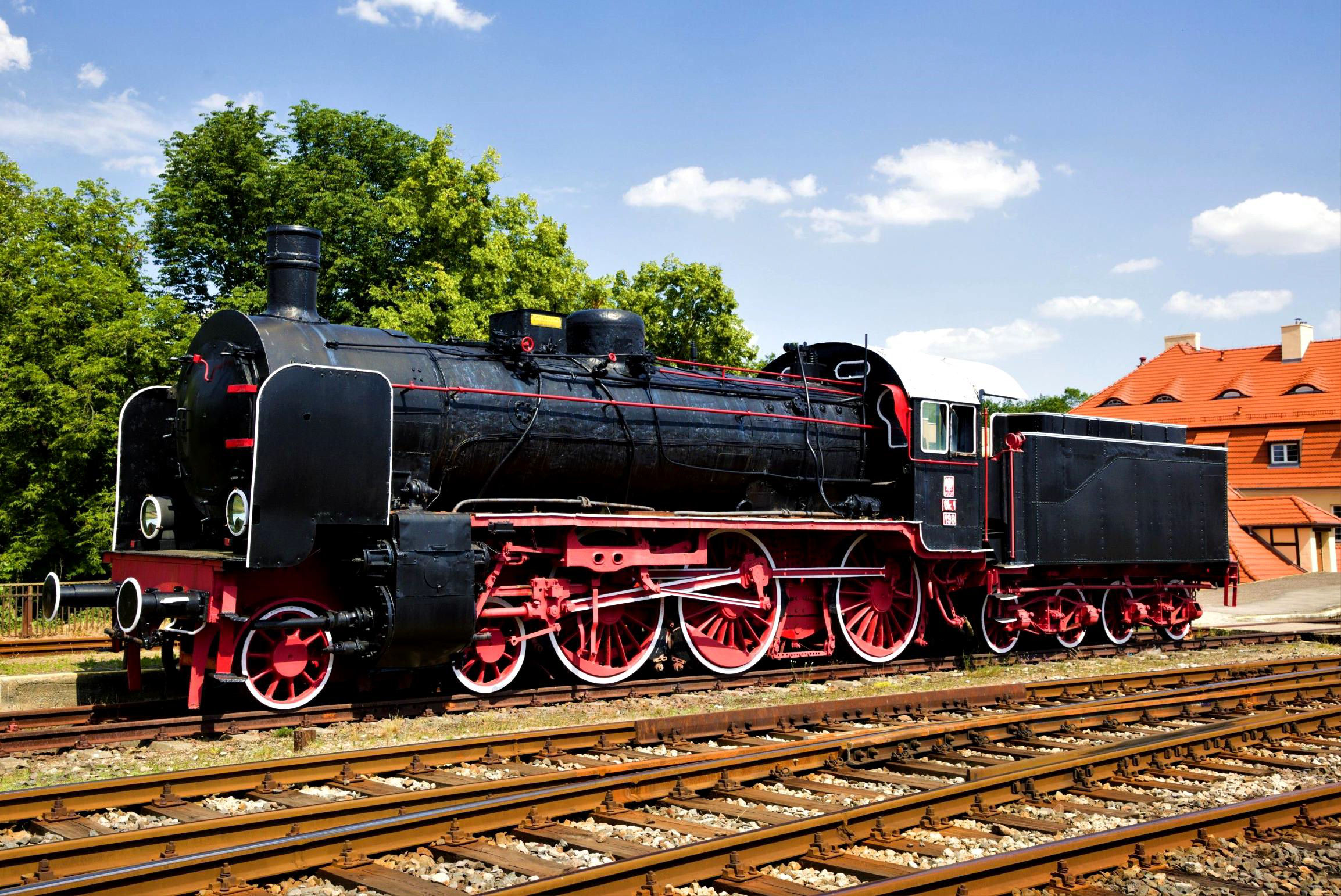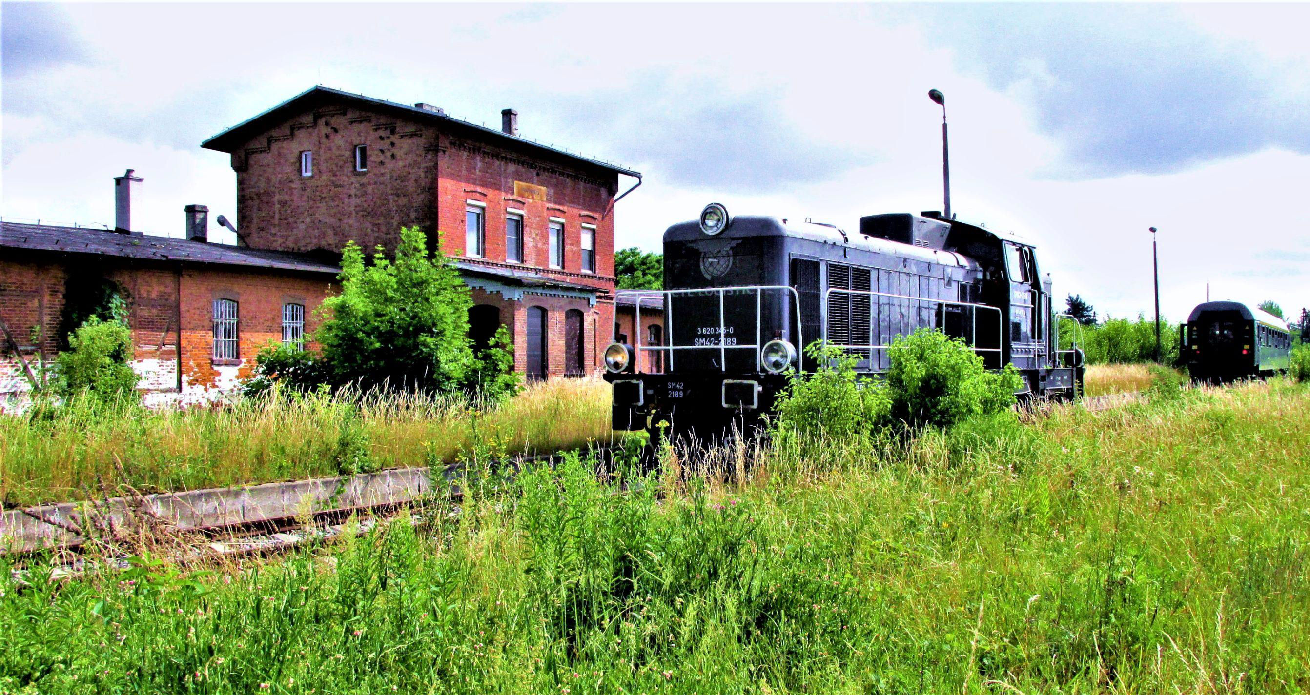 The line clearly continues on from the old station site and there is also a line trailing in before the station probably from that central ammunition depot (but don't tell anyone). The station is engulfed in grass and trees making circling round for photos actually quite a challenge. However, once the SM42 had run round, the organiser managed to persuade them to propel back (for a better photo of course - ahem). So, from just having reached the platform before we ended up well beyond the station buildings, there was probably still a platform somewhere. On investigation the impressive tower we could see from the distance is on the Krappitz Ring (market square), once a centre for leather and paper making but now diminished. The town is famous for the manufacture of a famous brand of durable and fragrance free Polish toilet paper 'Mola' - really! (You couldn't make all this up!)
