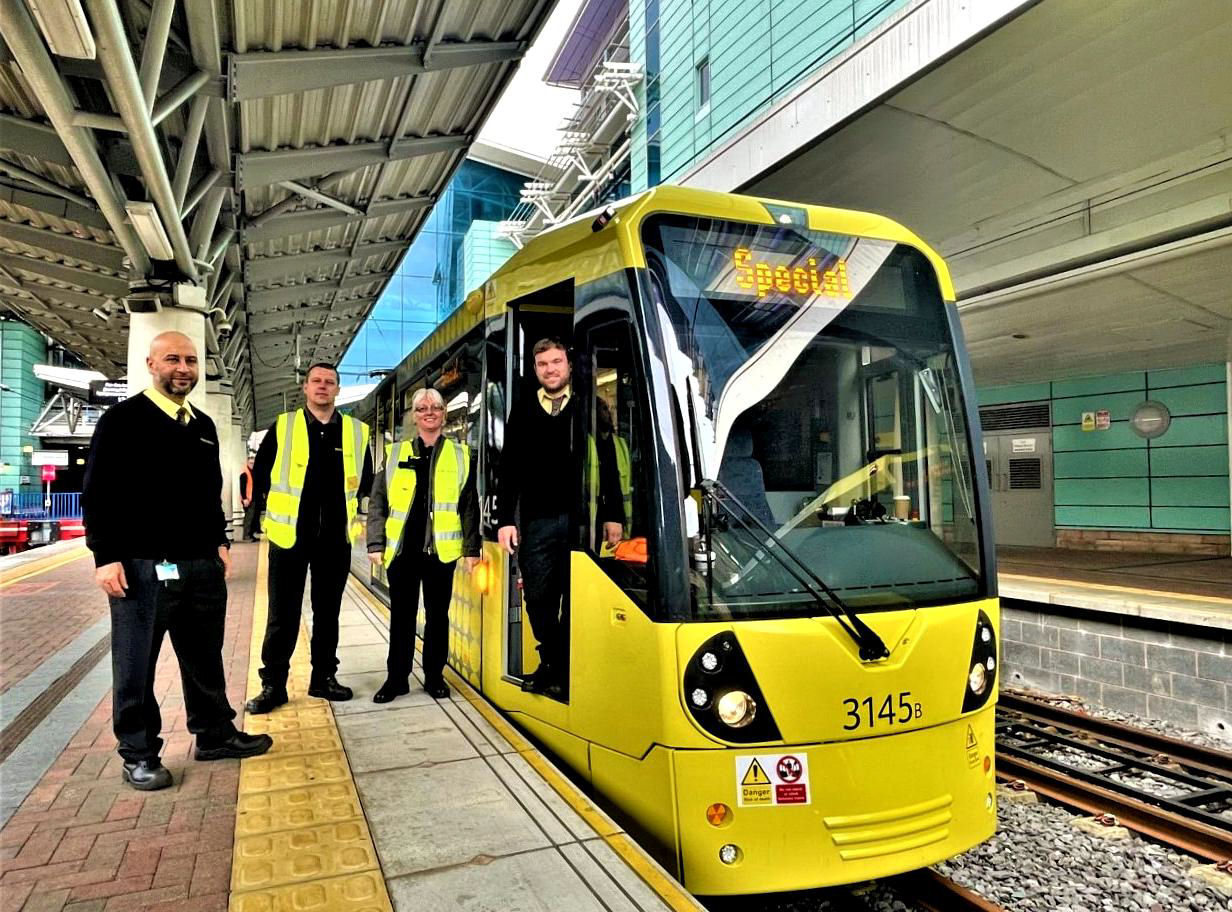 Our Metrolink drivers (far left & right) and on board team at Manchester Airport non-used P5. Metrolink P6 is right; P3 & 4 buffer stops are far left,