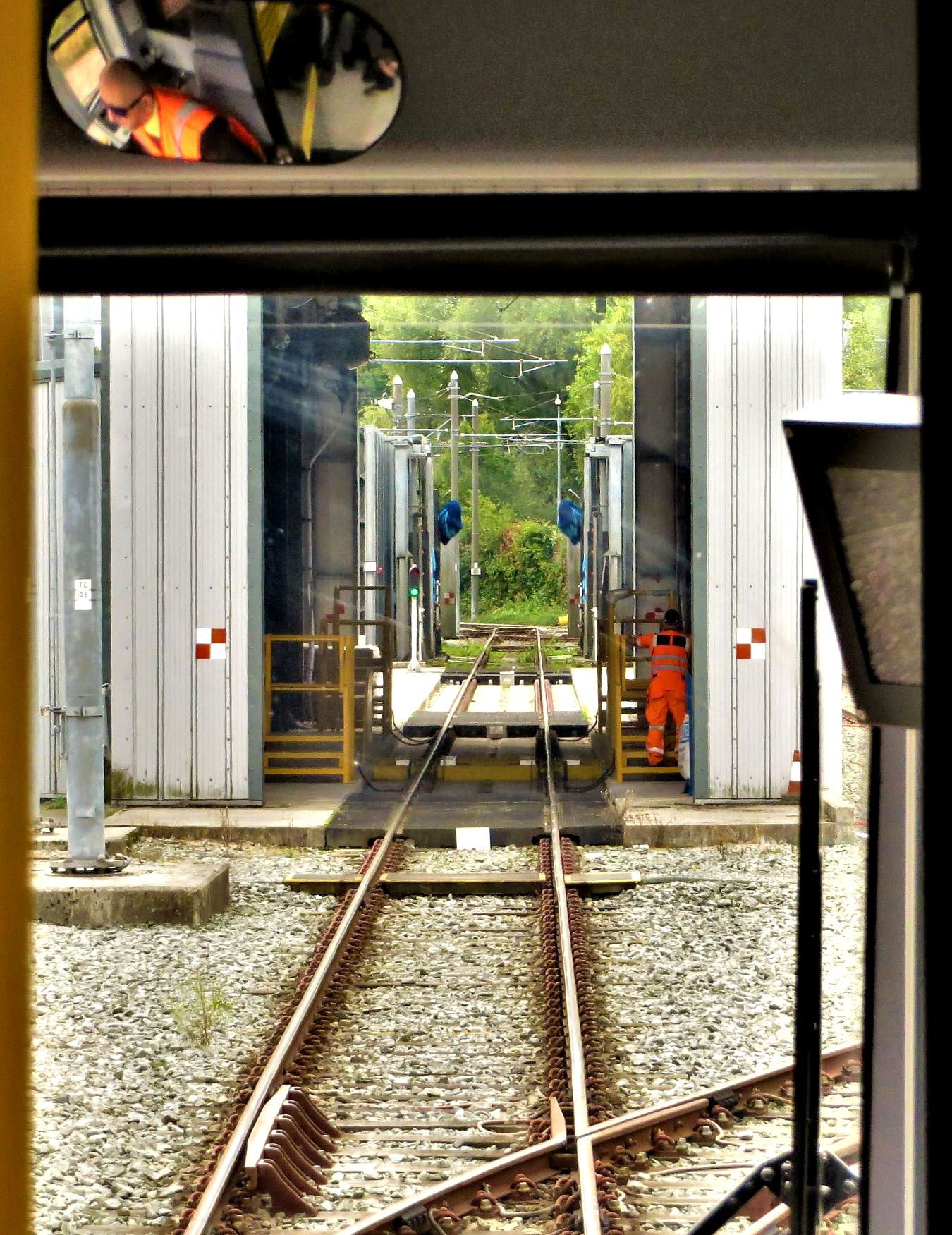 The (working) tram wash at Old Trafford Depot, the driver is seen in the mirror.
