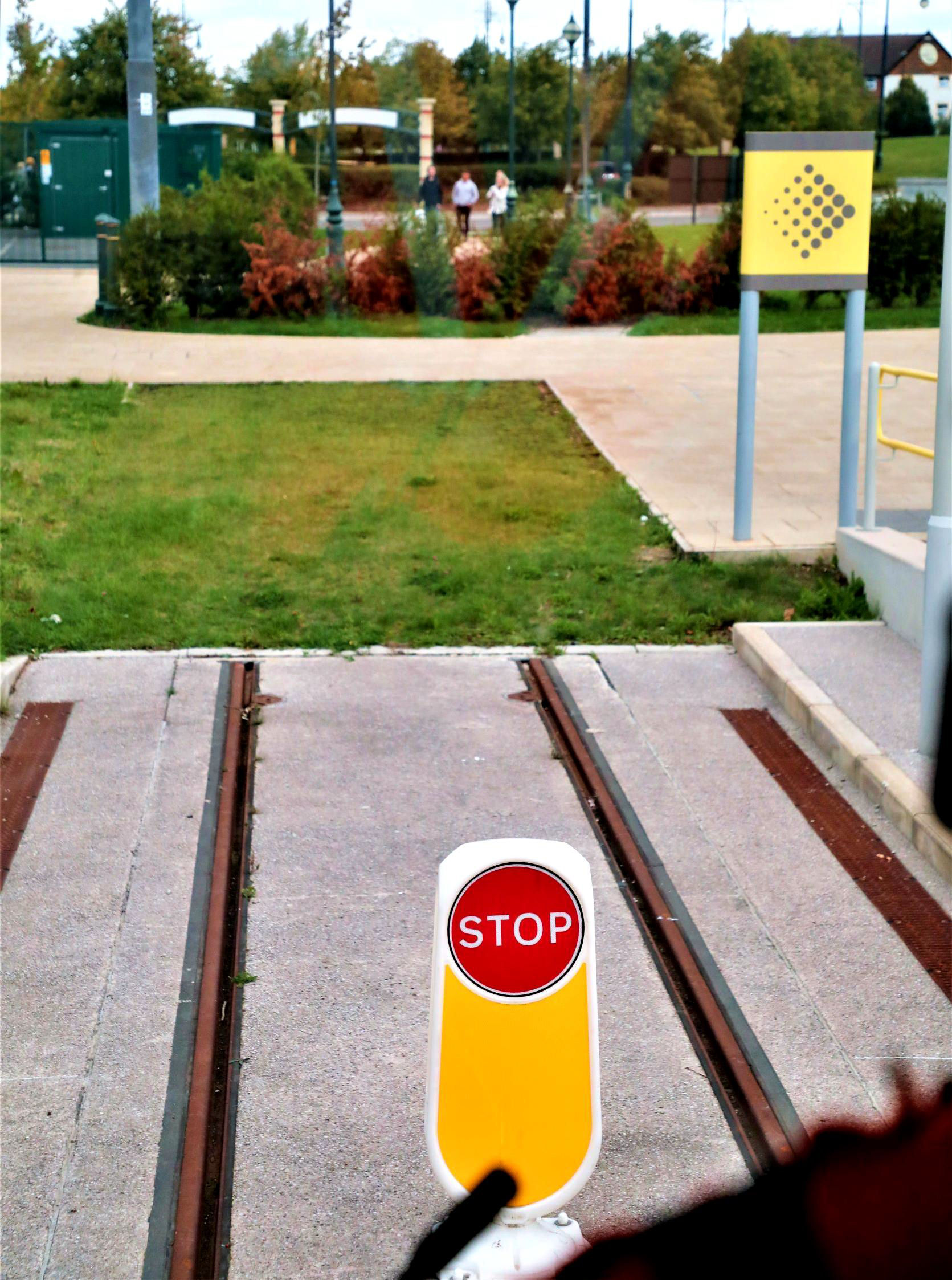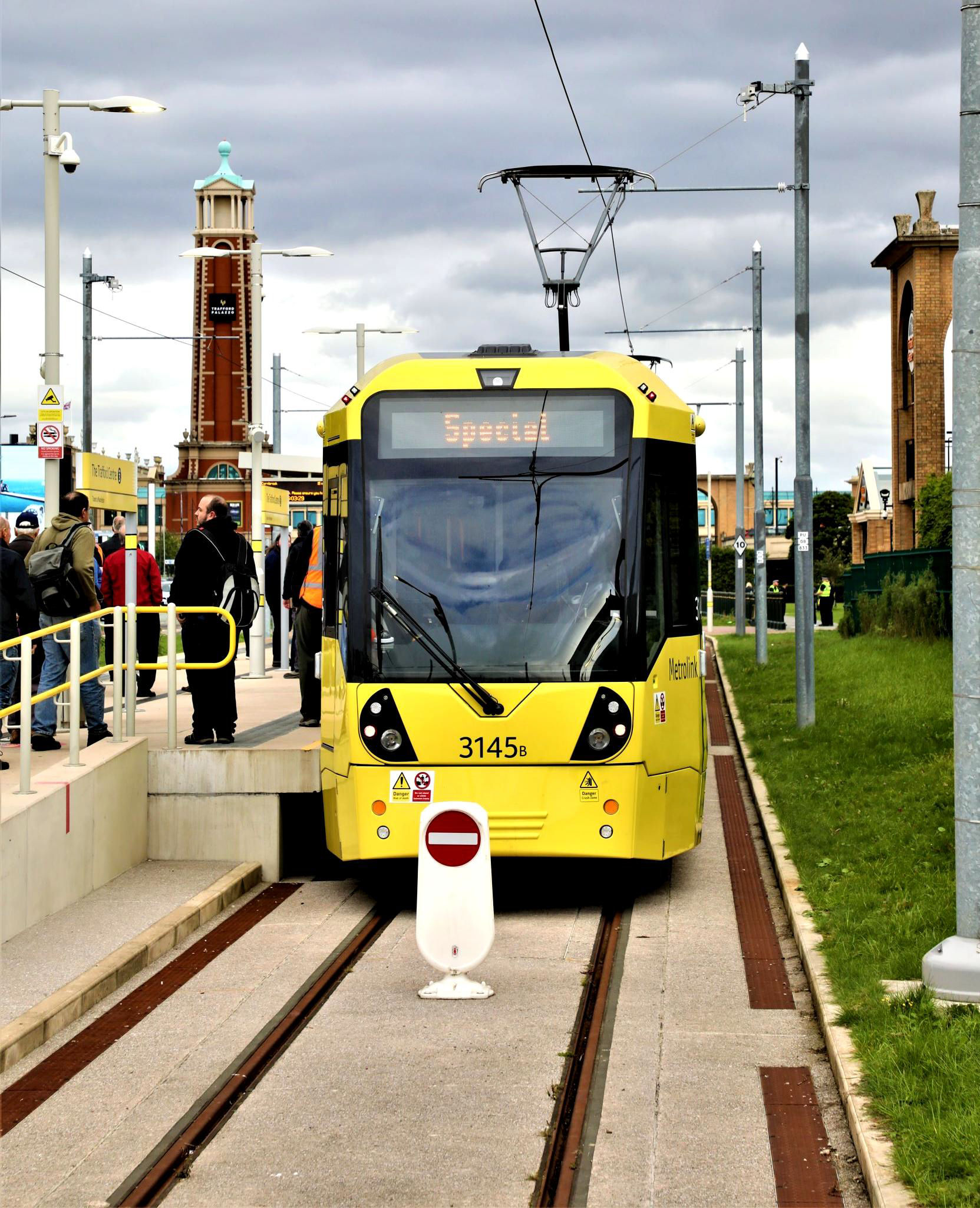 Everyone on, we set off, leaving the retail emporium, threading our way back to the City, sometimes sharing the way with roads. Near Barton Dock Road stop we crossed the Bridgewater Canal. Our tour curved right past the ITV studios opened in 2013; ITV was concerned about 'noisy trams' passing as they were trying to record Coronation Street, so insulation and lubrication was installed to reduce the track noise. Just past Wharfside stop our tram paused, reversed, crossed over and then returned to Village. Of note at Wharfside are the series of (cattle pens) football fan corrals with a card 'tap in' required to escape to the trams on match days. Another interesting piece of rare track was soon to be covered, Imperial War Museum Turnback from the Outbound to Inbound line - a long 'middle line' to stable up to three double ECS trams on match days. Trafford Park line completed!