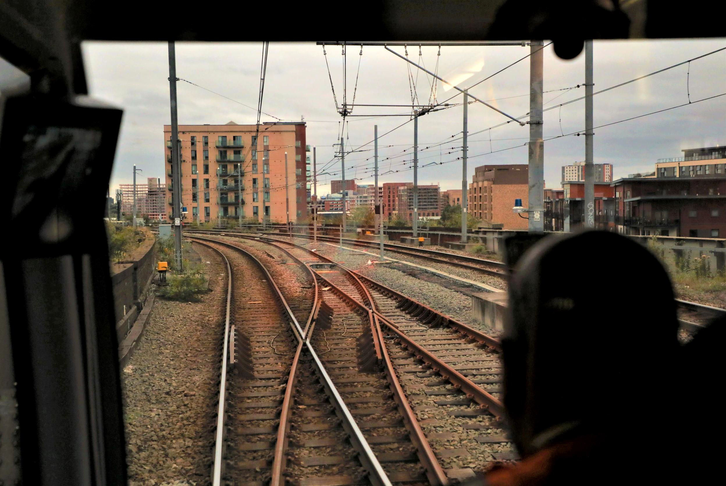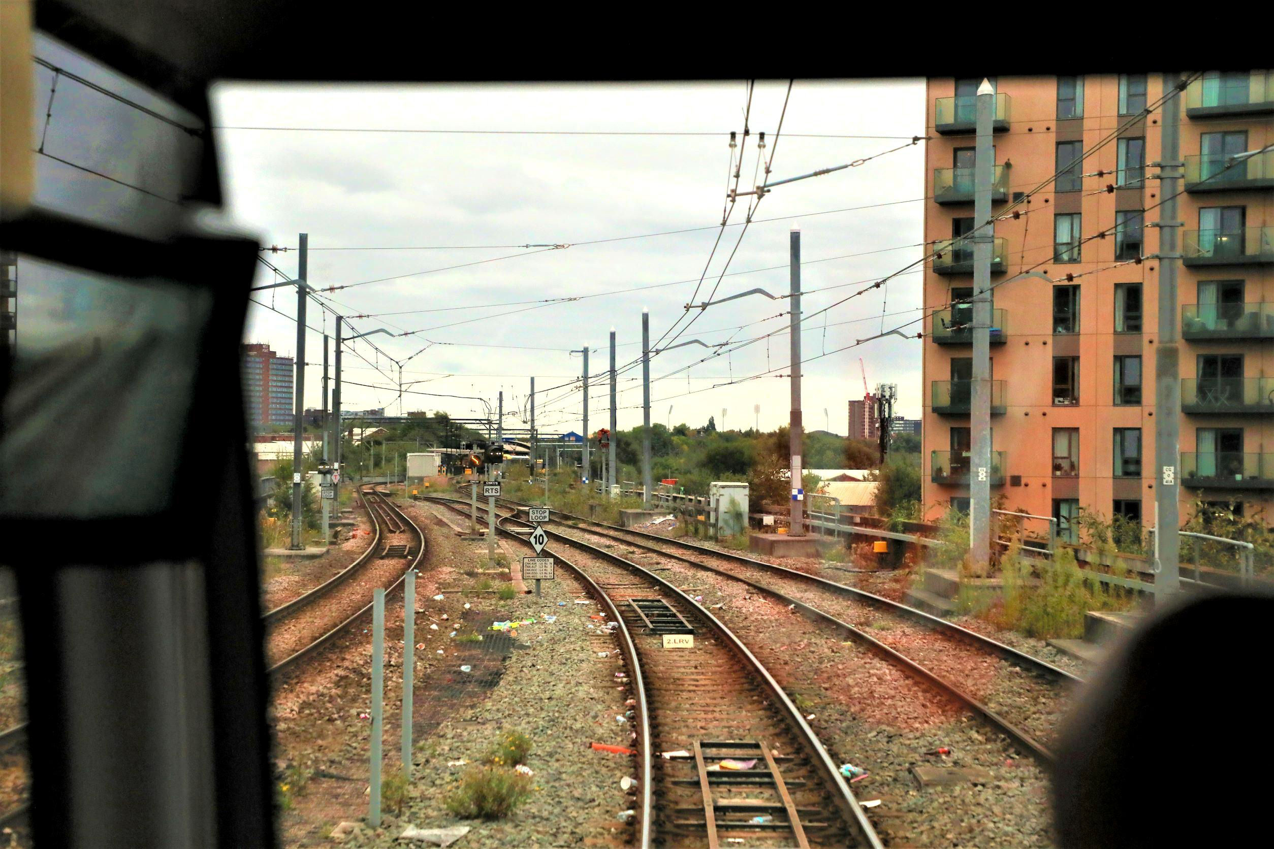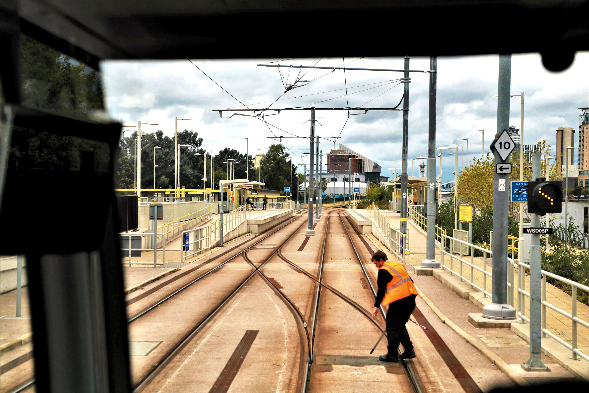 Approaching Old Trafford Depot (again!), Kev announced that there was a problem with the leading cab blade (again!) and we had to make a detour into the depot via Gate 1. The fitters attended to fix the wiper (ahem) and we exited via Gate 2 (more crossovers and track scored). We continued in and out of the much sought after Cornbrook Pocket line and on through Deansgate-Castlefield left hand loop platform. The slender 169m Beetham Tower loomed large over us, completed in 2006. It is no longer the tallest building in the City, as the more recent South Tower in Deansgate is 201m high.