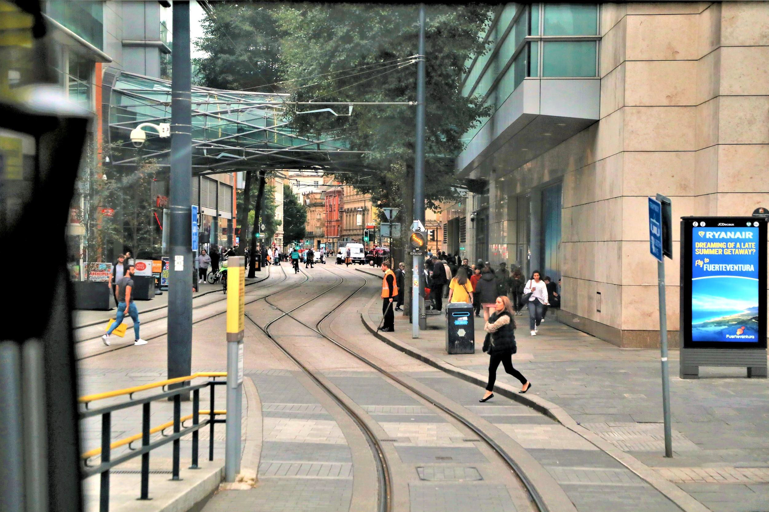 The tour is about to depart from Exchange Square over the crossover towards St Peter's Square.