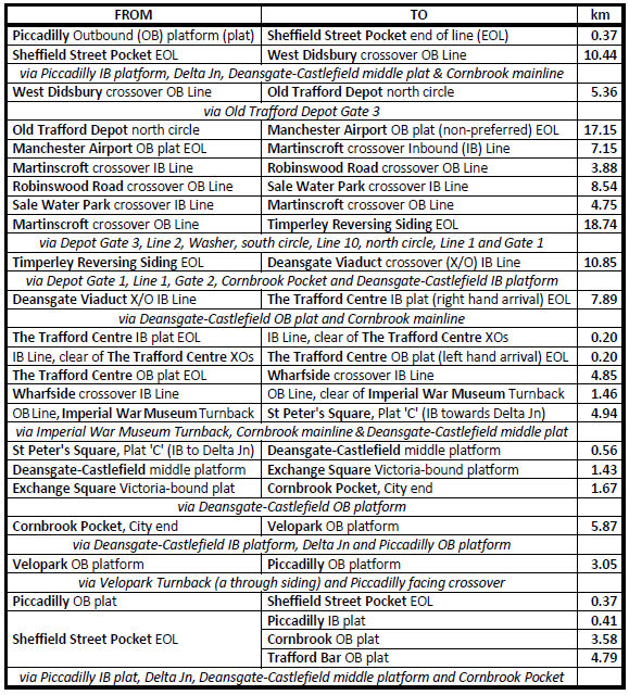 This was the end of the tour but participants were kindly allowed to stay on for the return ECS working and most did. We reversed in Sheffield Street Pocket again, particularly pleasing two participants who had missed it first thing due to their late arrival. From here we ran through Piccadilly, past The Delta and via Deansgate-Castlefield middle line (again!) to Cornbrook Pocket where our tram paused. The route indicator showed we were set to cover the final Pocket connection to terminate at Trafford Bar. Incredibly our tram had travelled 124.51km (77m 32ch), similar to King's Cross to Peterborough.