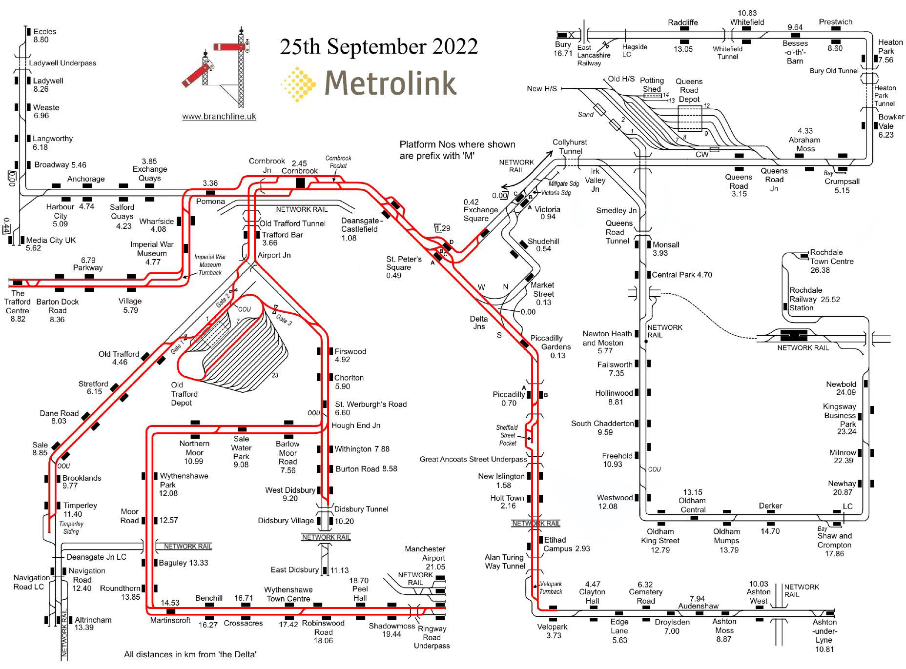 Manchester Metrolink plan with track covered on our tour. There have been quite a few changes since TRACKmaps 4 p48 2018, including some names.
