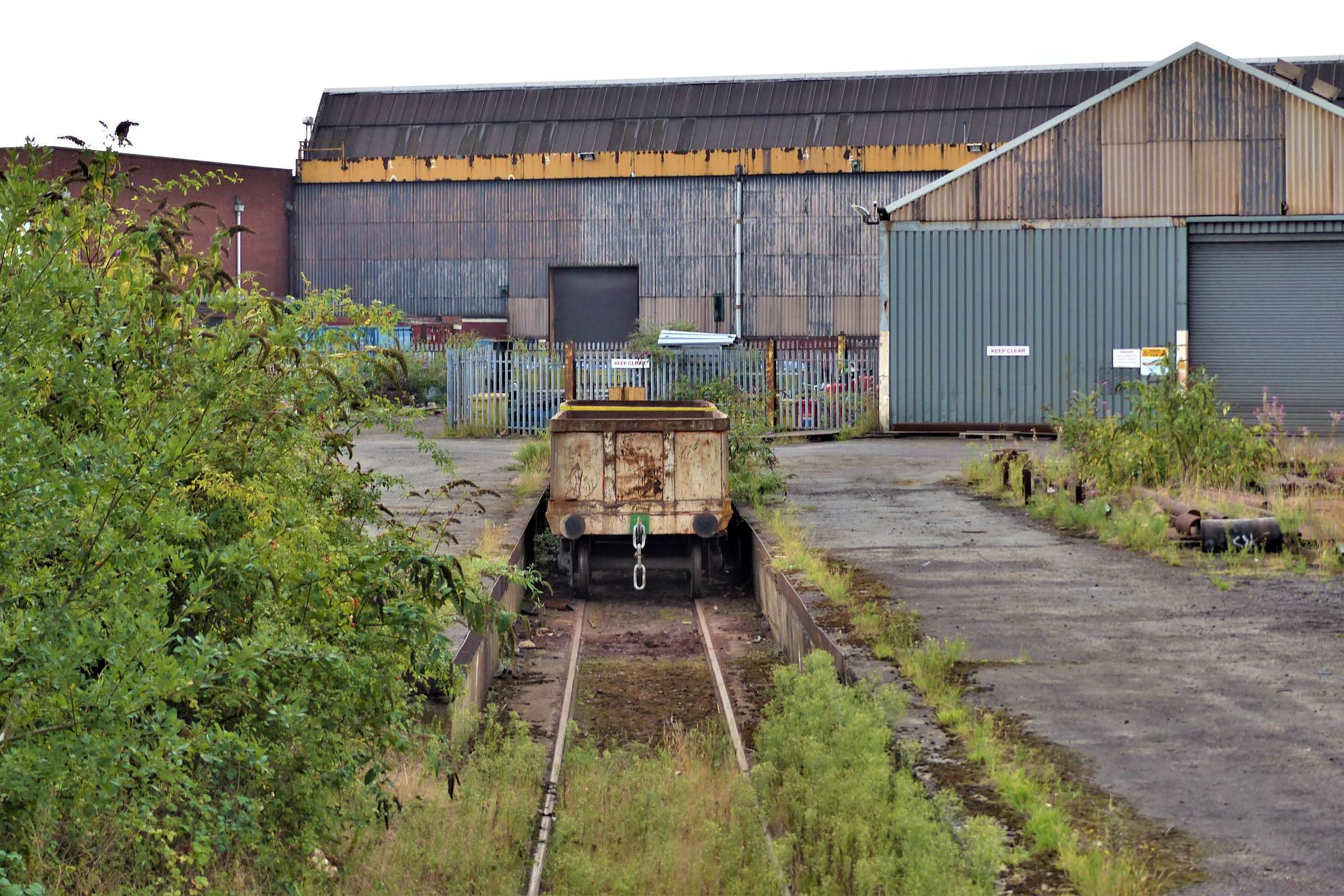 We made our way back out to ... Dawes Lane bridge and, after reversing, propelled around the north side of the demolished Plate Mill site, the northern part now been repurposed as a container terminal. Three former plate mill 57xx bogie wagons were still in the siding labelled 'Pig Caster Stay Road'.