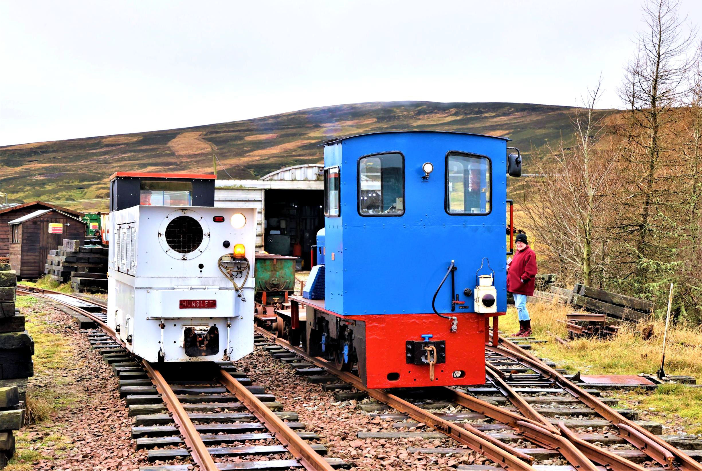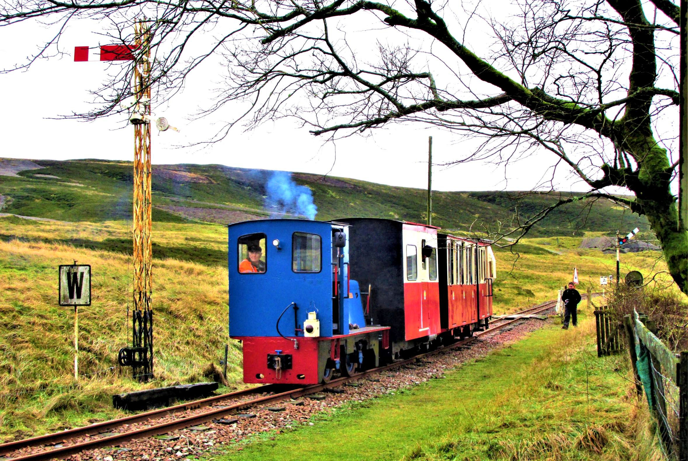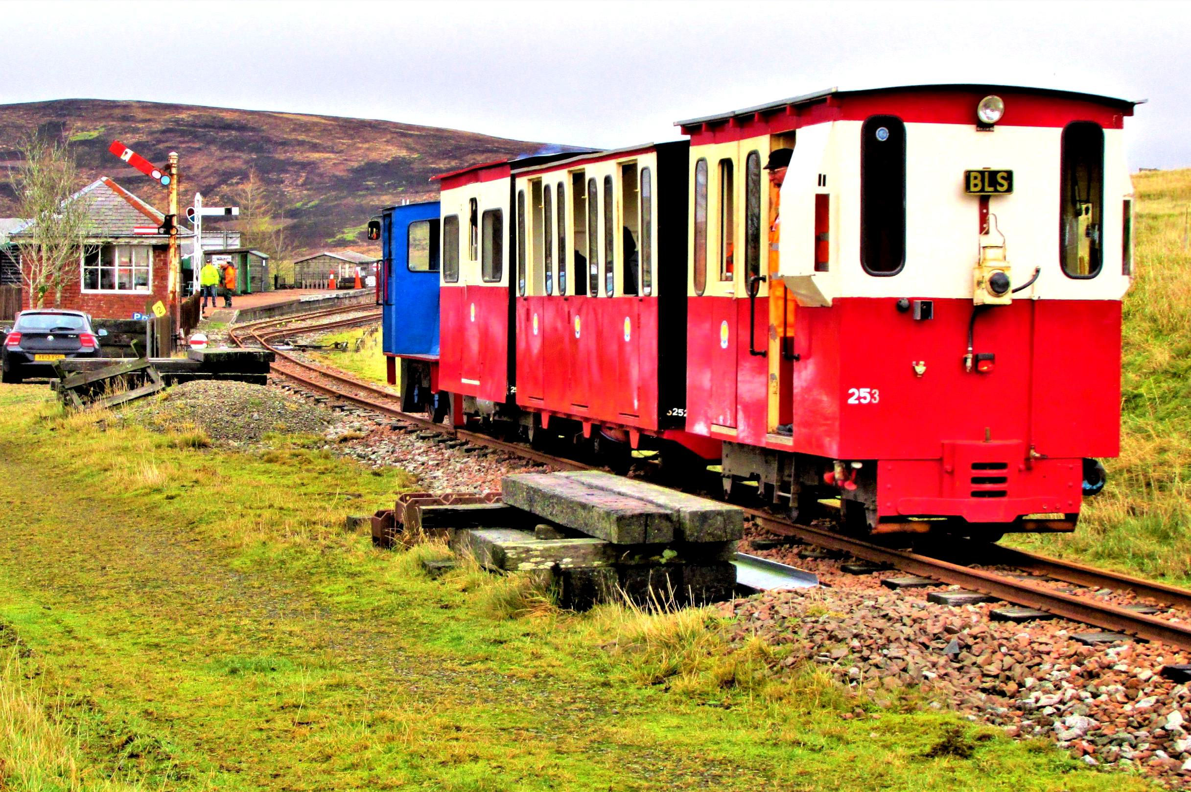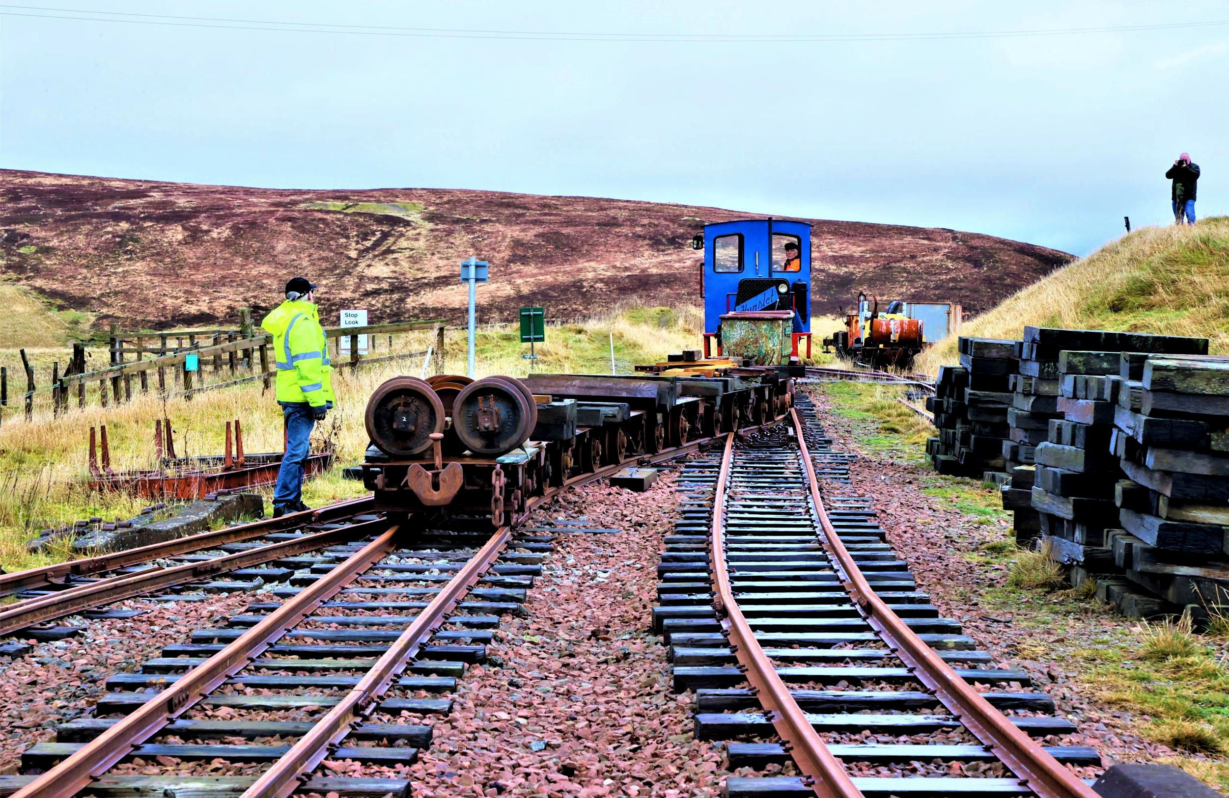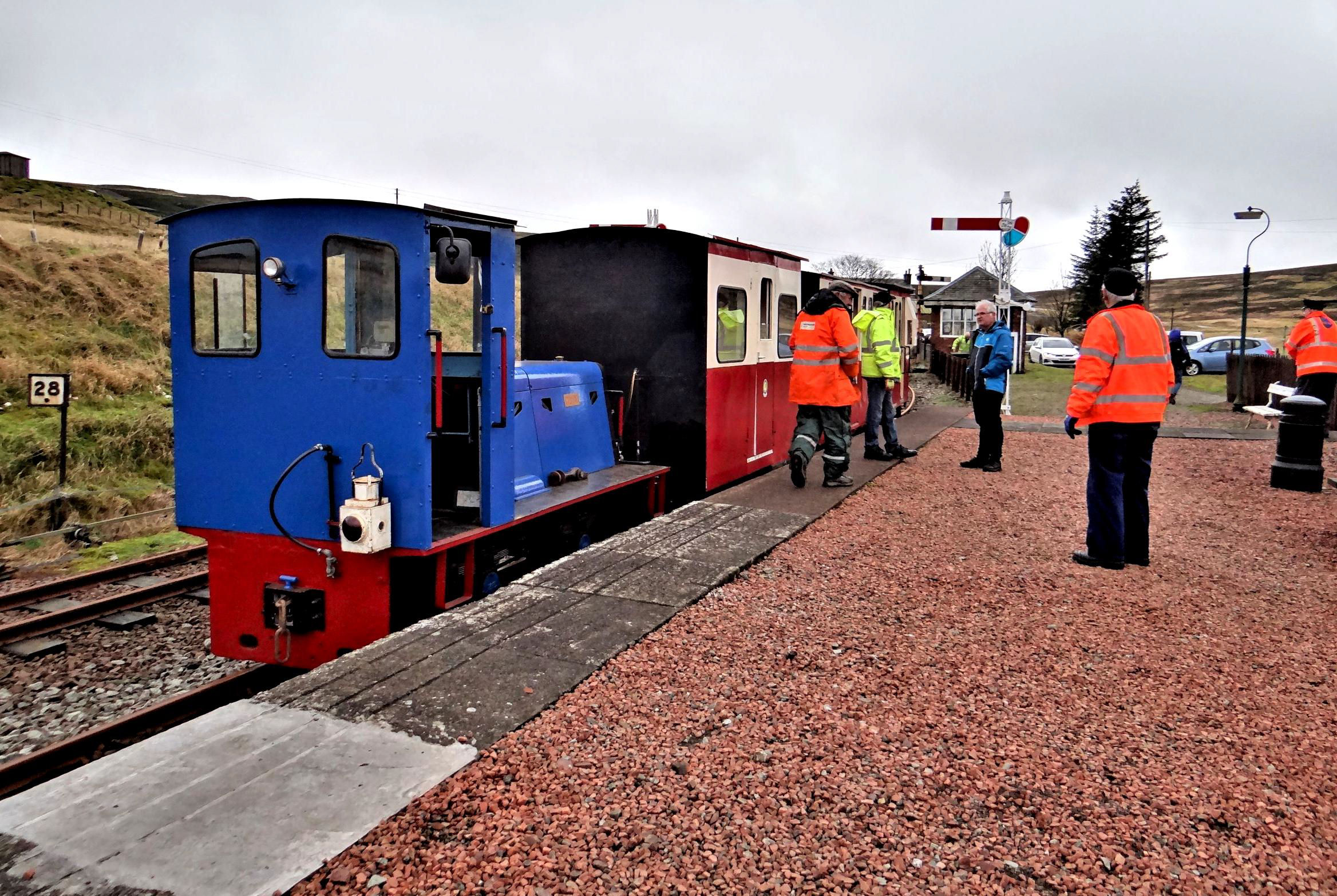 Some of our fully booked group of 36 seemed reluctant to board with 'non preferred' traction Hunslet No10 Mennock (1994) for the first run of 1,200yd up - literally - to Glengonnar, but were encouraged away from their cameras to join. The absence of glazing in the door windows created what even a hardy soul might describe as a fresh atmosphere as we climbed through a barren post-industrial landscape to the current highest altitude (1,498 feet) on an adhesion railway in the UK. The train had drawn up short of the stop board, so after the photos had been taken and an initial elimination round for the Silly Hat award had taken place, we drew up to the buffers and then set off back downhill.