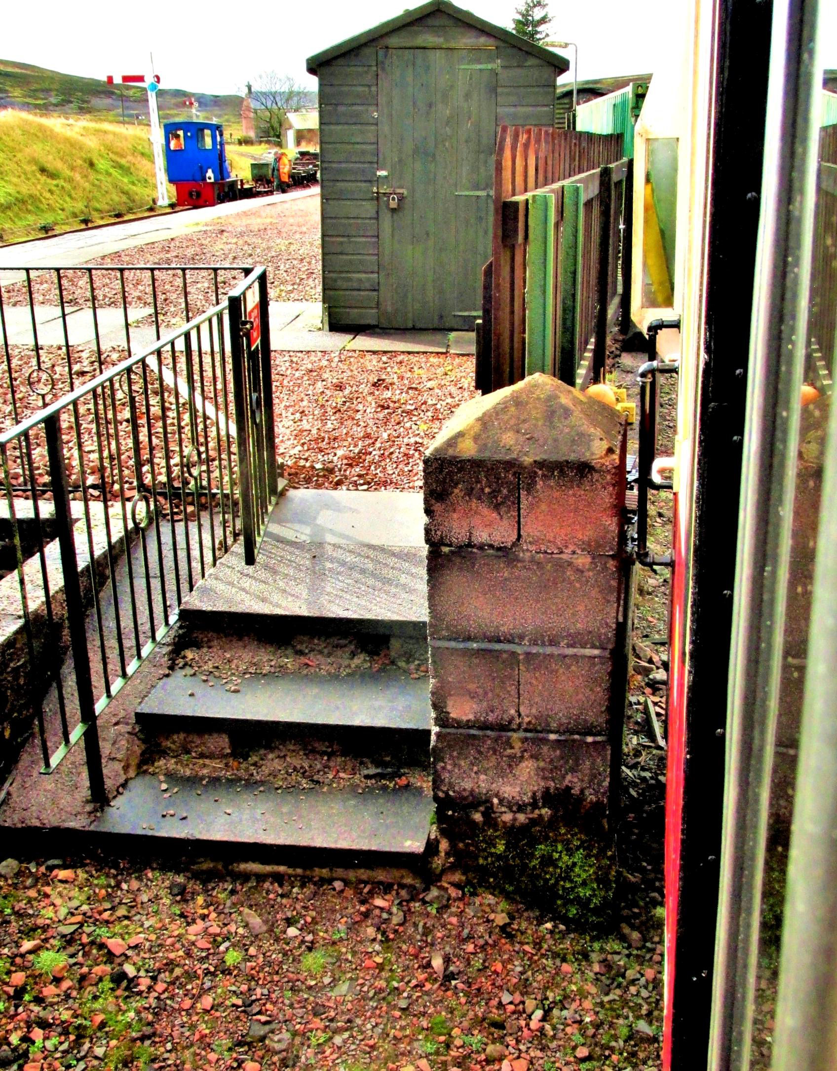 Leadhills platform is left, that loco is in the run round loop, looking towards Glengonnar. The coach on our railtour (right) just squeezed past that brick pillar into the siding ahead.