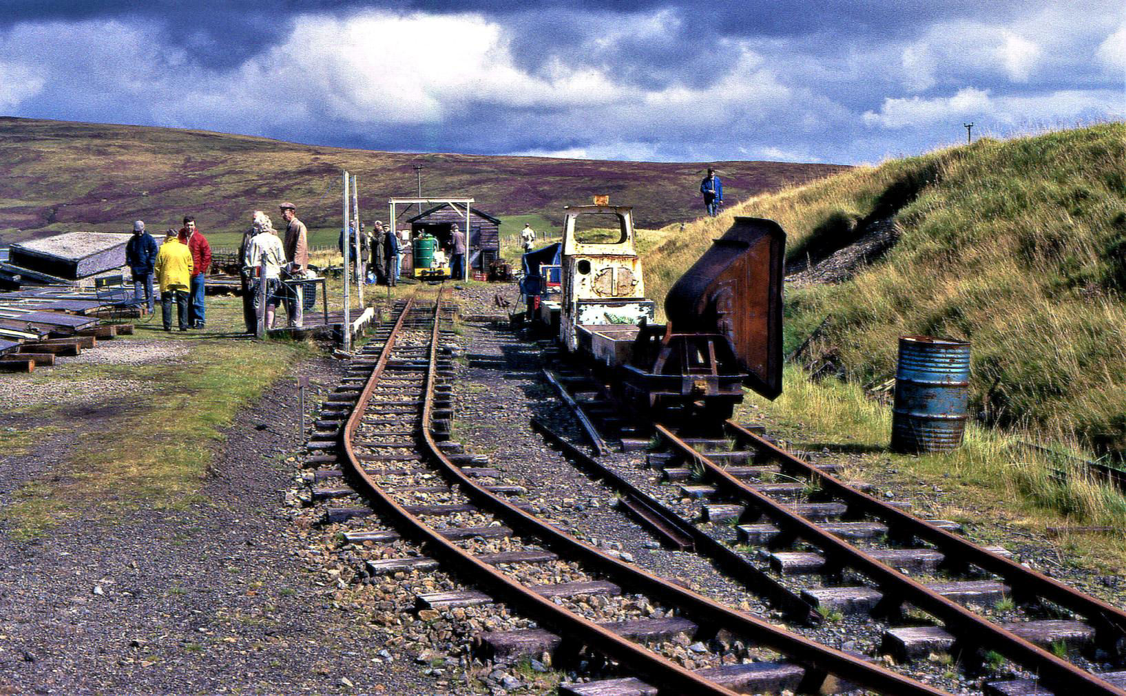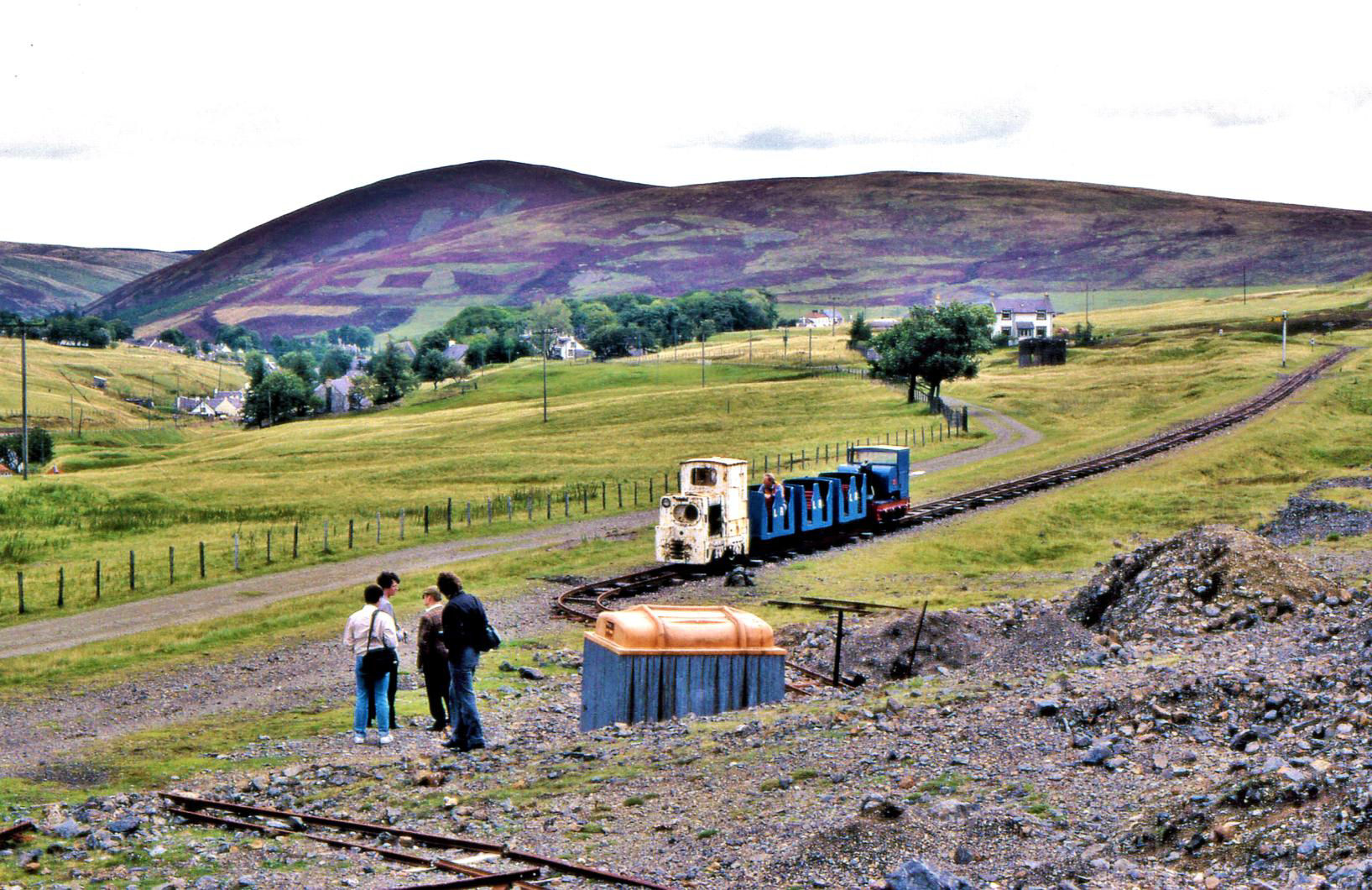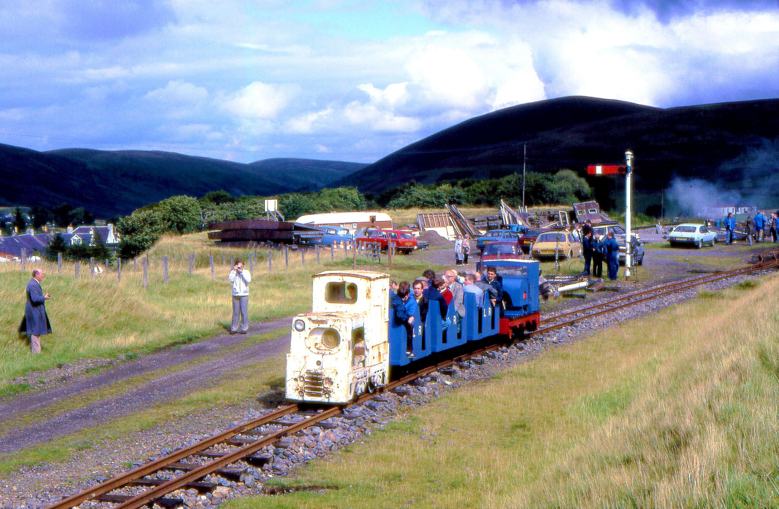 Rewind 34+ years, our Sun 28 Aug 1988 visit to Leadhills ('station' off the right). In those days known as the Lowthers Railway (still its legal title), it only went to an old quarry; the loco shed was a simple wooden affair at the end of line. Some may recognise a few faces!