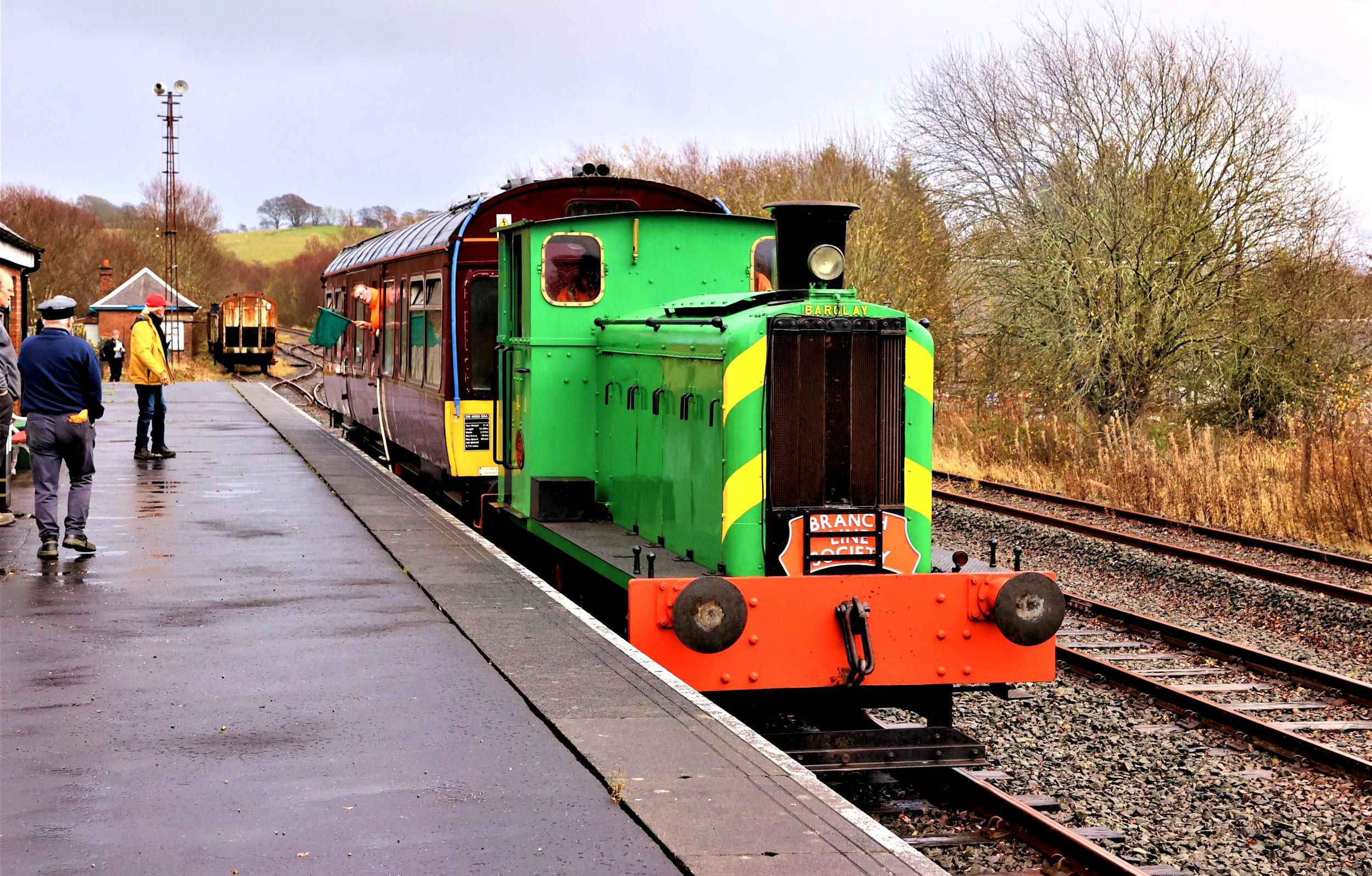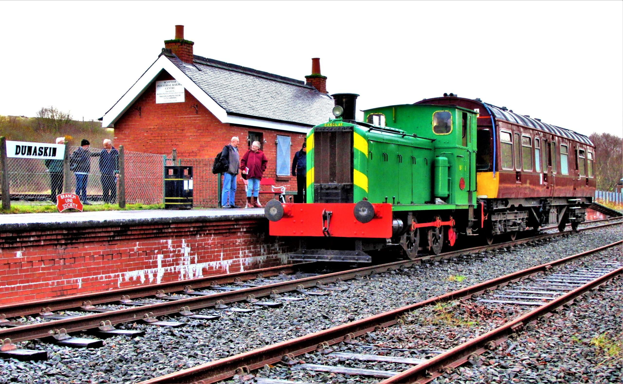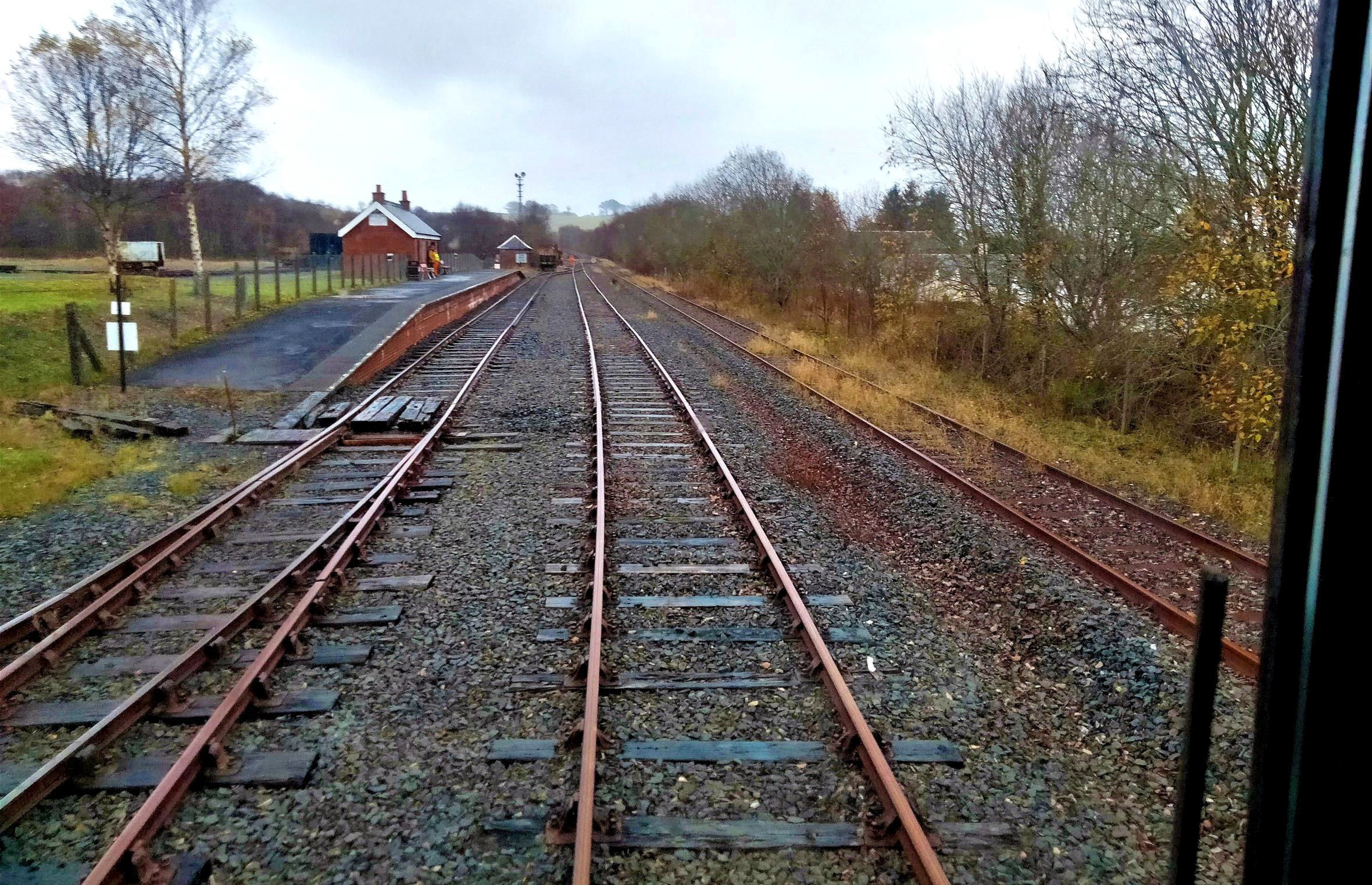 We were split into two groups, one to travel while the other visited the Museum and Loco Shed on this massive site. Worryingly, all the Committee seemed to hold back for the second run - did they know something we didn't? No, they were just being polite! I was delighted to find 1941 Barclay Powfoot No1 waiting in Dunaskin platform (52m 65ch) and the LMS Saloon 45020 still with EWS logo on the side. We set off towards Laight Level Crossing in damp conditions, reaching the extent of the current line (53m 63ch) (TRACKmaps 1 p2C Dec 2021). There are 'medium term' plans to bring the ex-National Coal Board track beyond the crossing to Minnivey (55m 00ch) back into use.