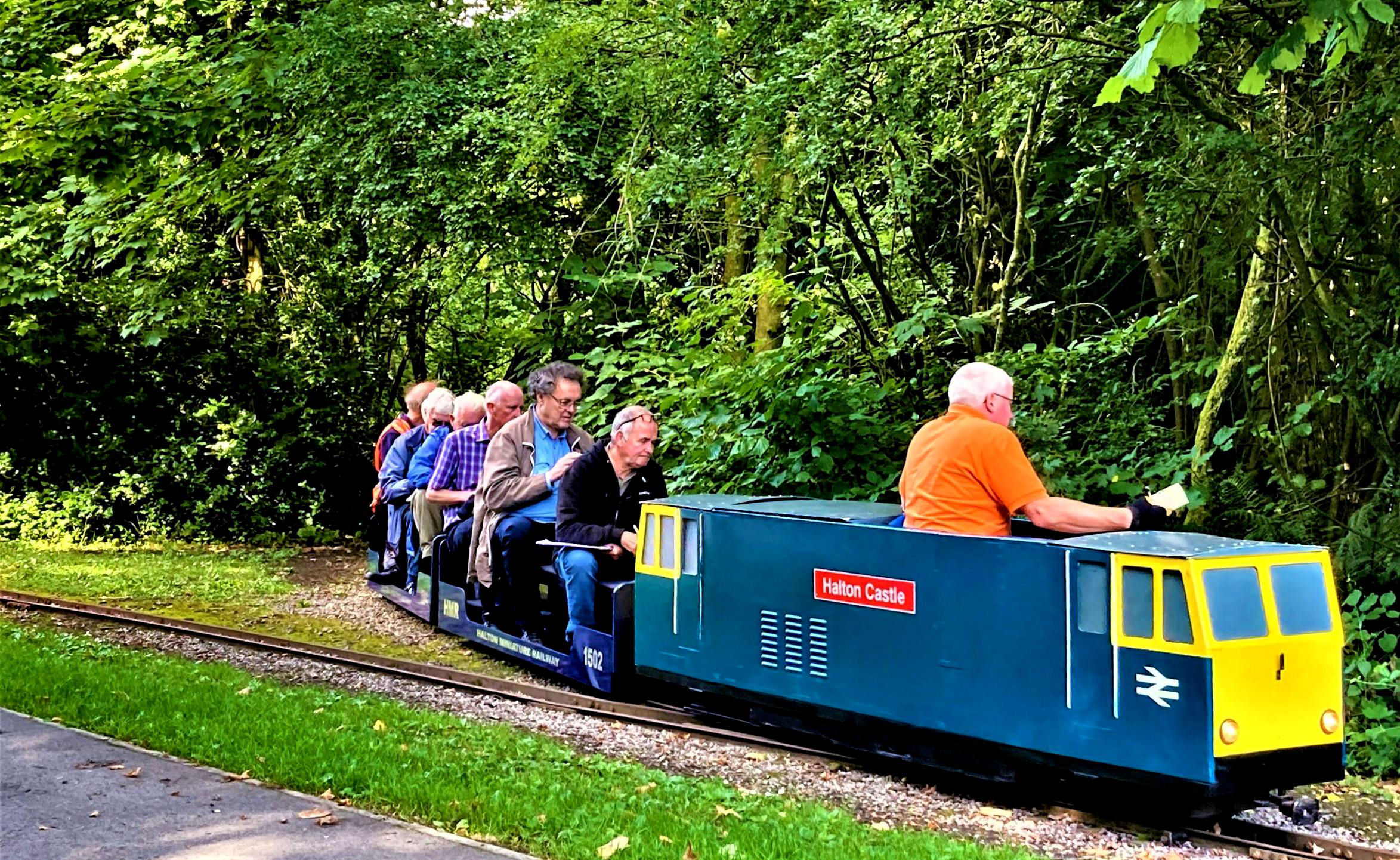 What better way to spend a lovely summer evening than in this lovely park? Battery Electric loco 'Halton Castle' takes half of the party round the north side of the main circuit. The train had been to the buffer stops in Norton Siding and was about to propel around Anstey's Curve at Tower View Jn (bottom right). Our convivial host John Doyle is driving.