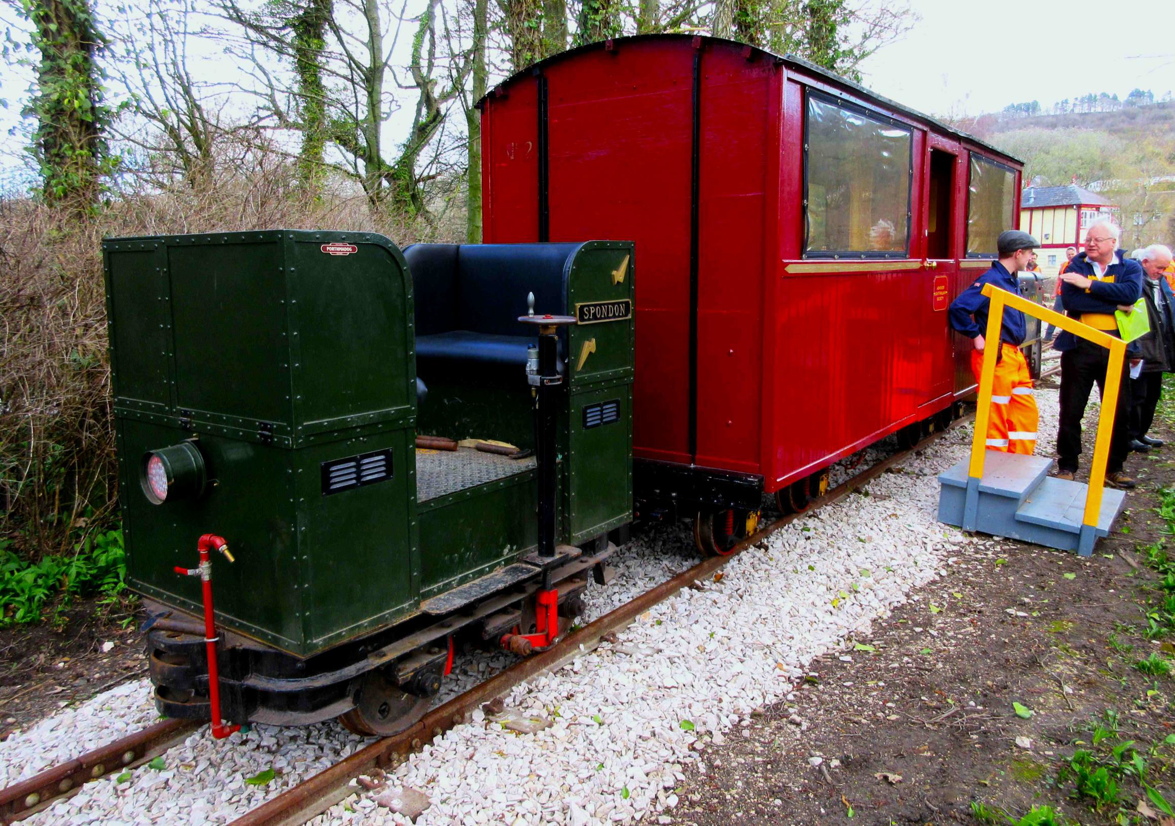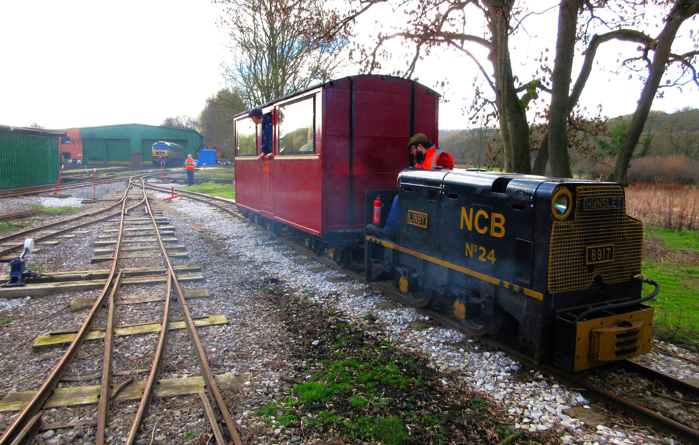 Continuing onward up the 1:28 (occasionally 1:14) incline, one train at a time did the section beyond Lawson's Loop to Middleton by Wirksworth, to use its full name, terminus. They passed each other in the loop and movements were made to ensure that everyone did both sides and had directionality here! After Sandy Lane Level Crossing (flagmen operated), passing through woods on a slope, the simple terminus at Middleton is reached. Traversal of the short Shed Road there wasn't possible. Those interested in doing the extremity without a loco in the way should do a normal passenger run as the coach is propelled right to the end of line (where there is no run round loop) and hauled back.