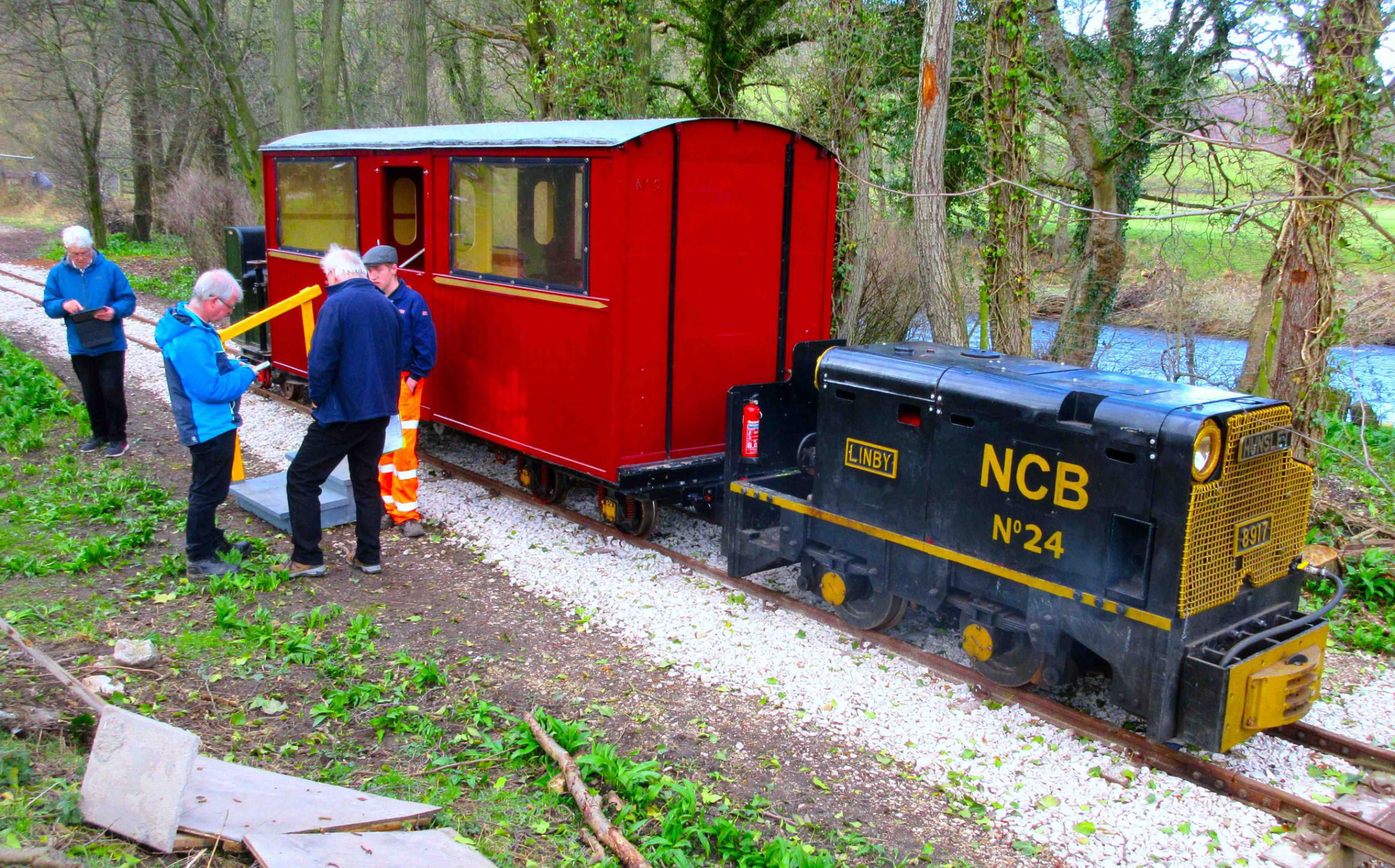 'Linby' on our special at the other end of the running line where it is intended to lay a triangle. The River Derwent is behind.