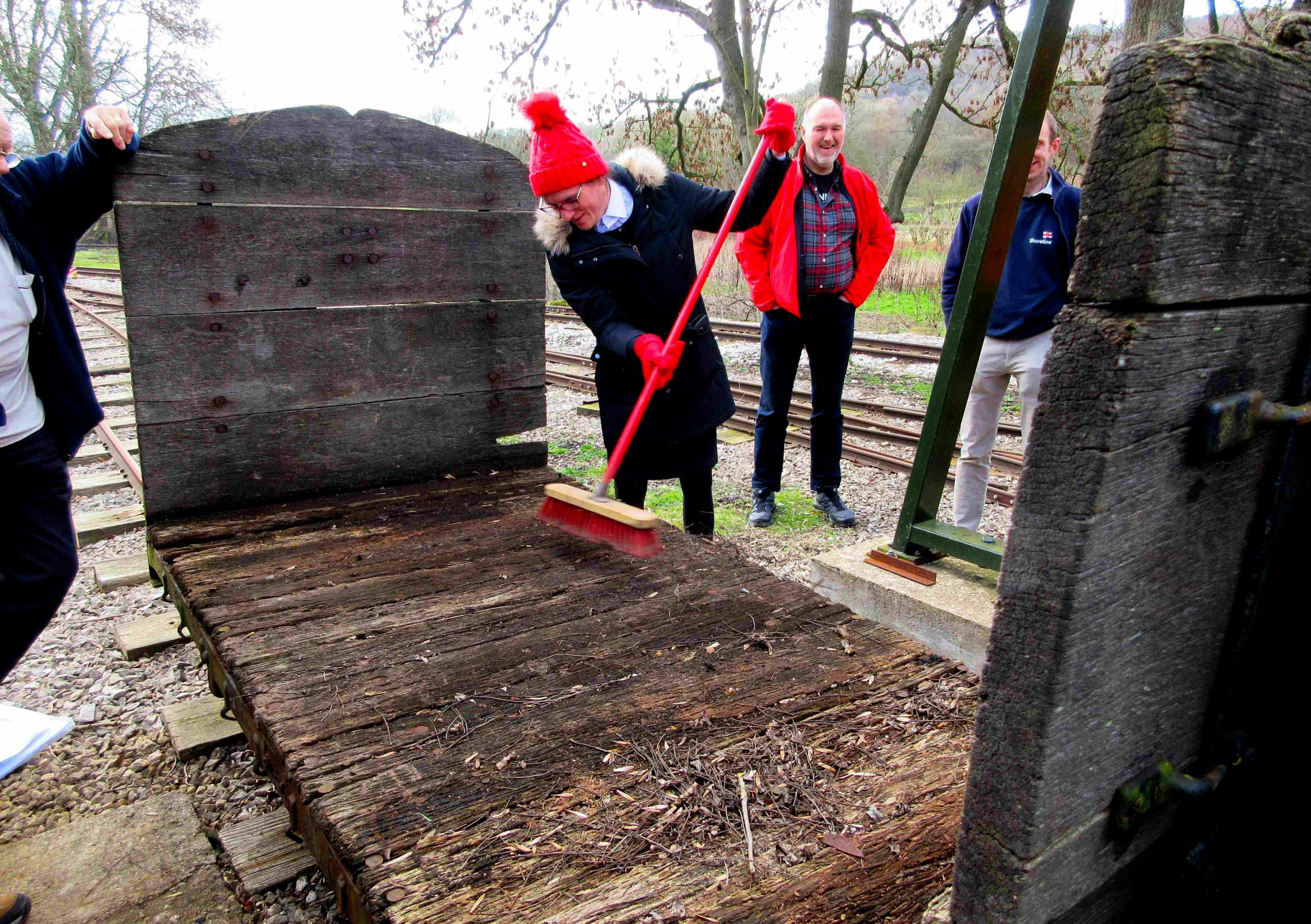 The ever-helpful Martha Haggas sweeps an ex-MoD wagon to allow our members (in two groups) to cover all available track here.