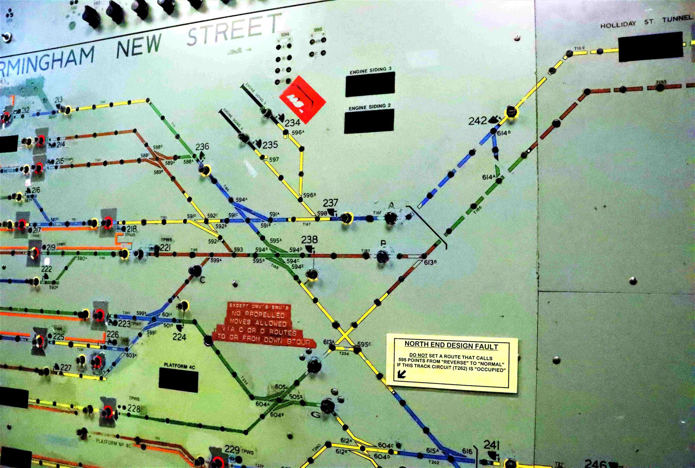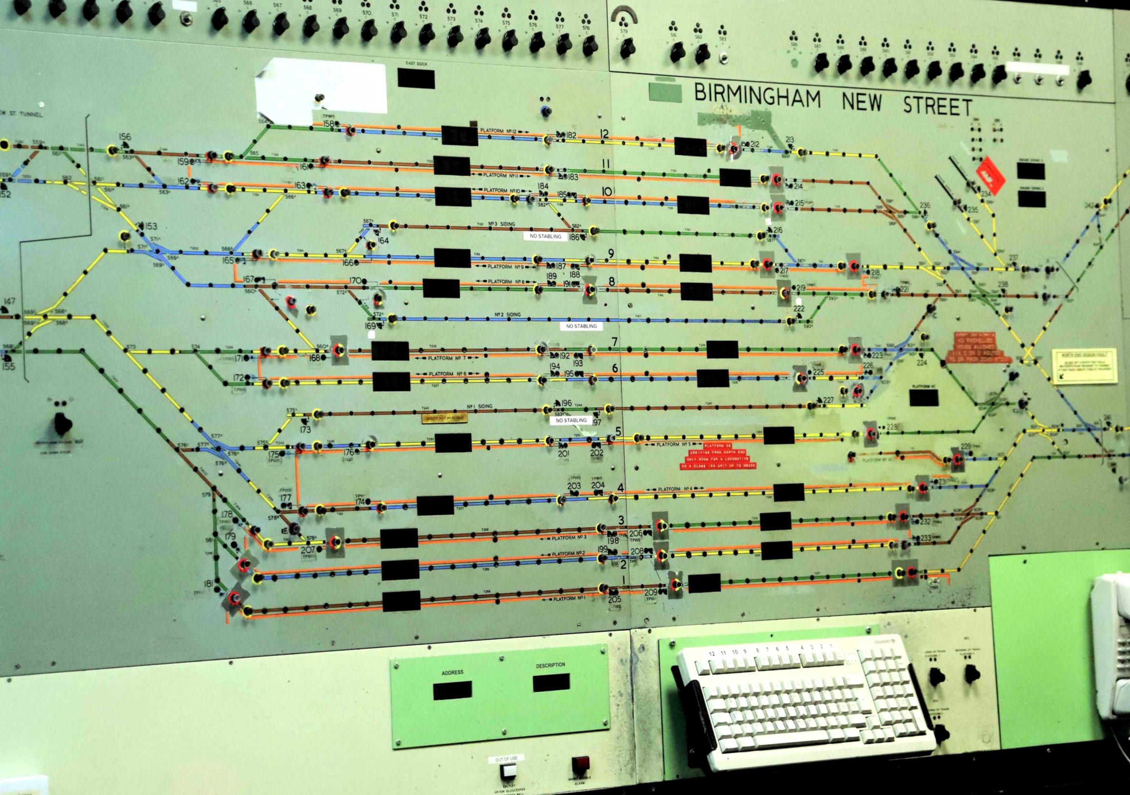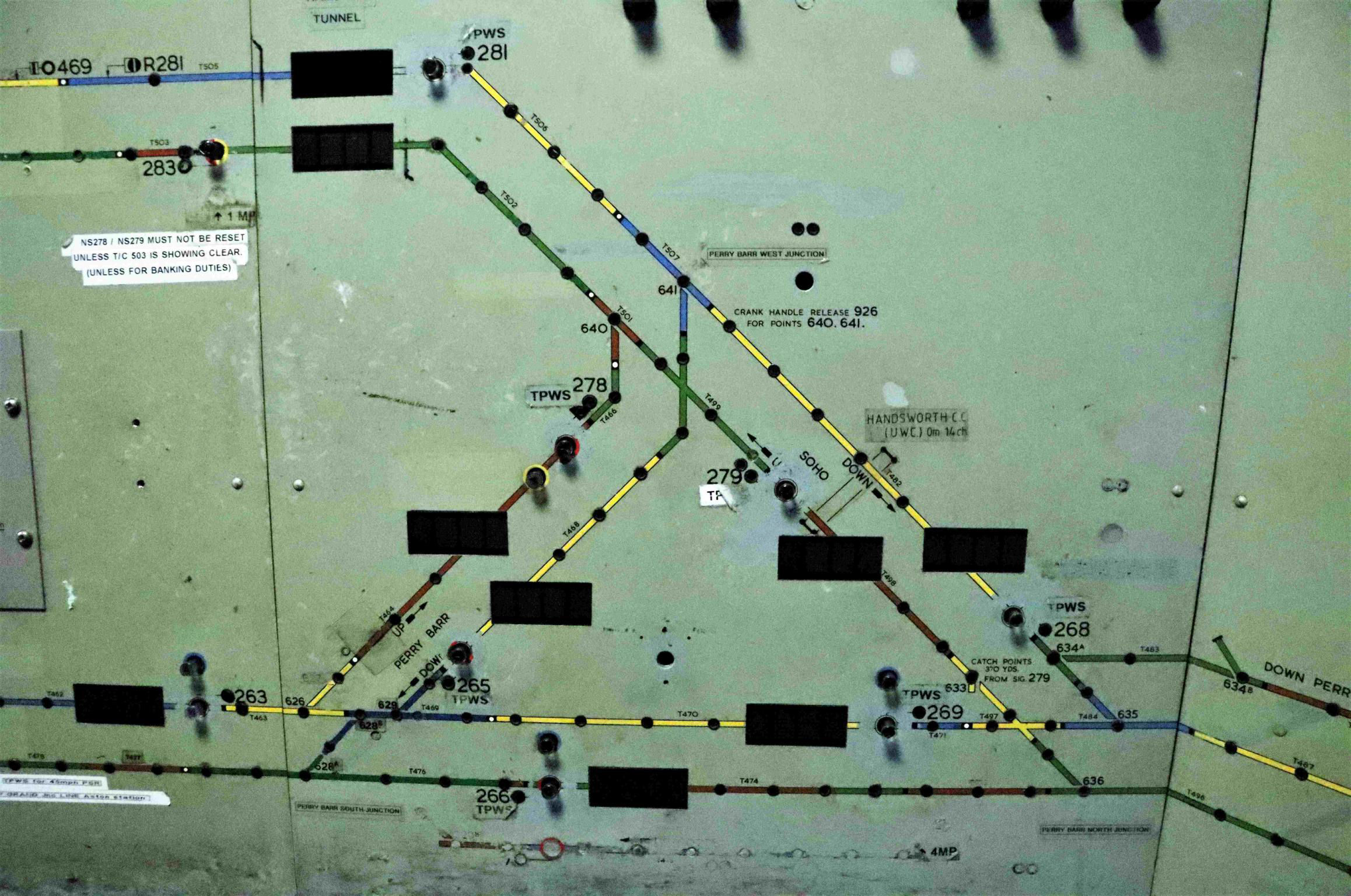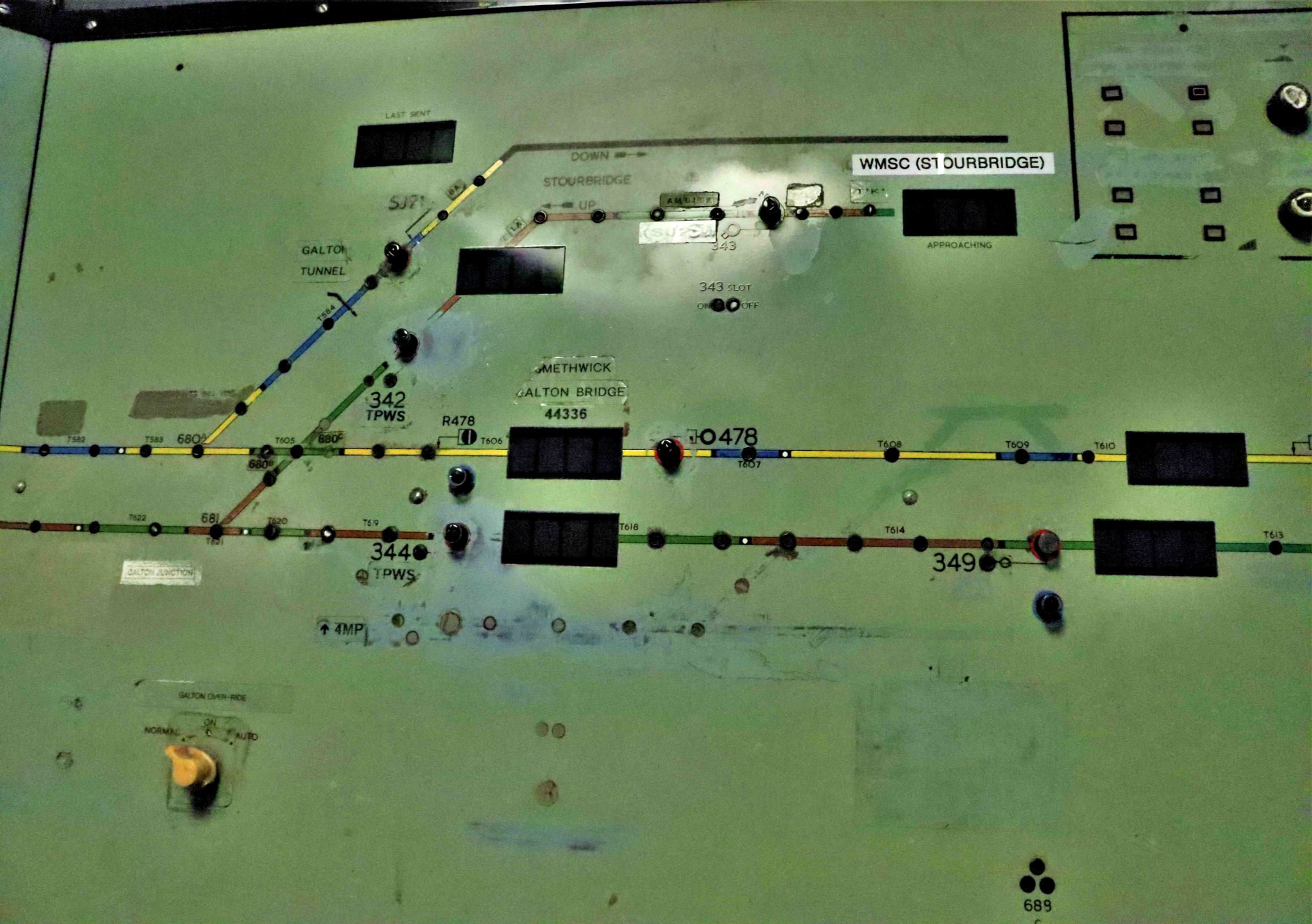 Greeted by our hosts for the Society visit on a very wet Birmingham day, the way the box operated was explained and we first passed the classroom. Several new uses for the box had been suggested, including fitness centre and Airbnb but the hosts were very proud to show the classroom in use for a signalling school, training tomorrow's signallers. Continuing up the narrow stairs, the machine room with its rows of heritage/Museum equipment was next. The 'Westpac' units were explained, labelled to show which area they controlled. The modular system enabled units and other components to be exchanged when faulty ones had been identified which wasn't always simple. The Operating Floor above, with its bird's eye view of train movements at the west end of the station and the surrounding roads, is surprisingly small. The compact panel was worked by a shift supervisor and just a handful of signallers. Like any box of this age, lines added to and removed from the panel over the years were evident. Various local operational constraints were marked on the panel. Our hosts tirelessly described their time operating the panel and explained the finer 'points' of the operation, for example how to avoid conflicting moves. We could try setting routes on the redundant panel and noted the nowadays 'rare' connection from the lower numbered platforms (P5 is the lowest) to/from Holliday Street Tunnel on the Bristol line. It was once used regularly by the Glasgow/Edinburgh - Bristol sleeper trains.