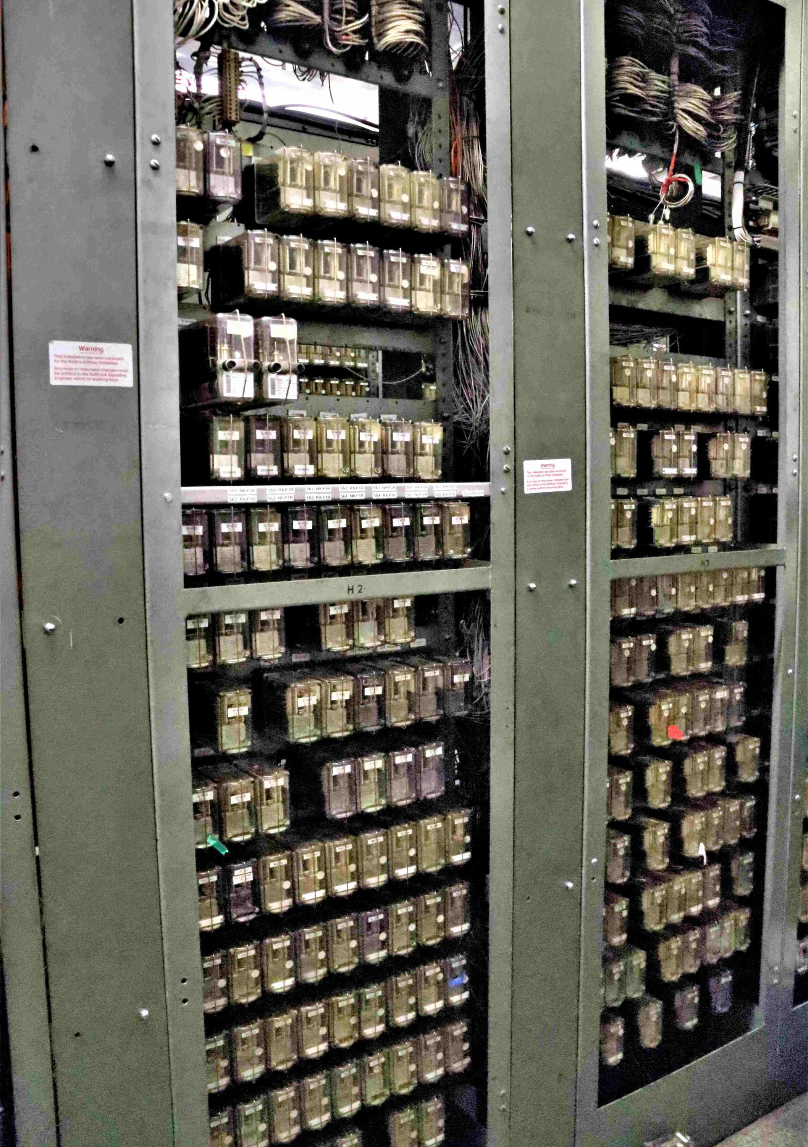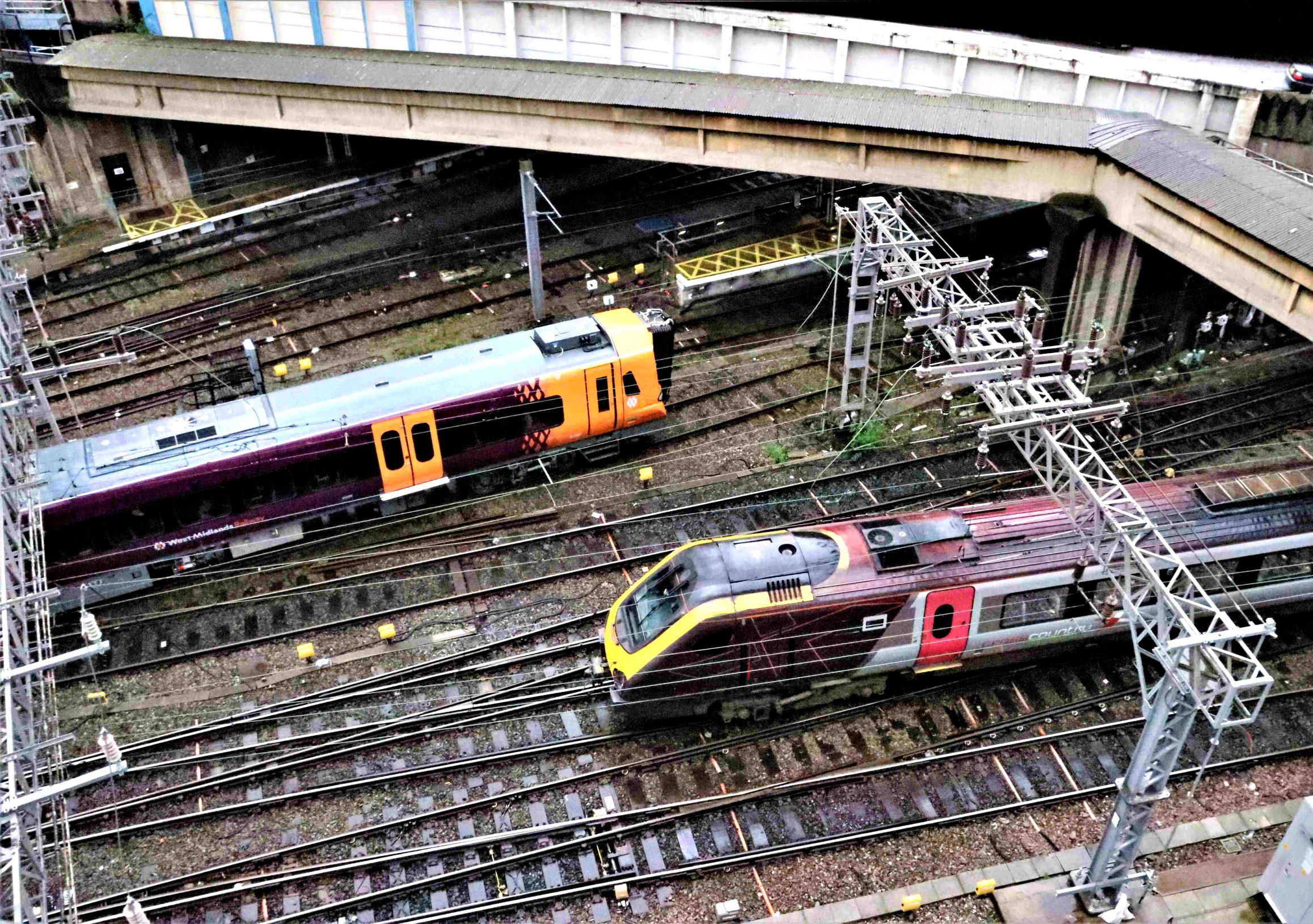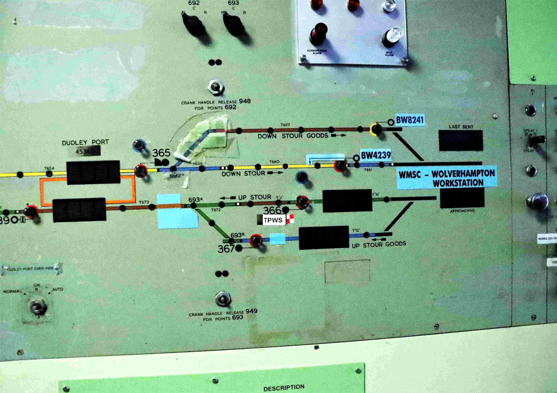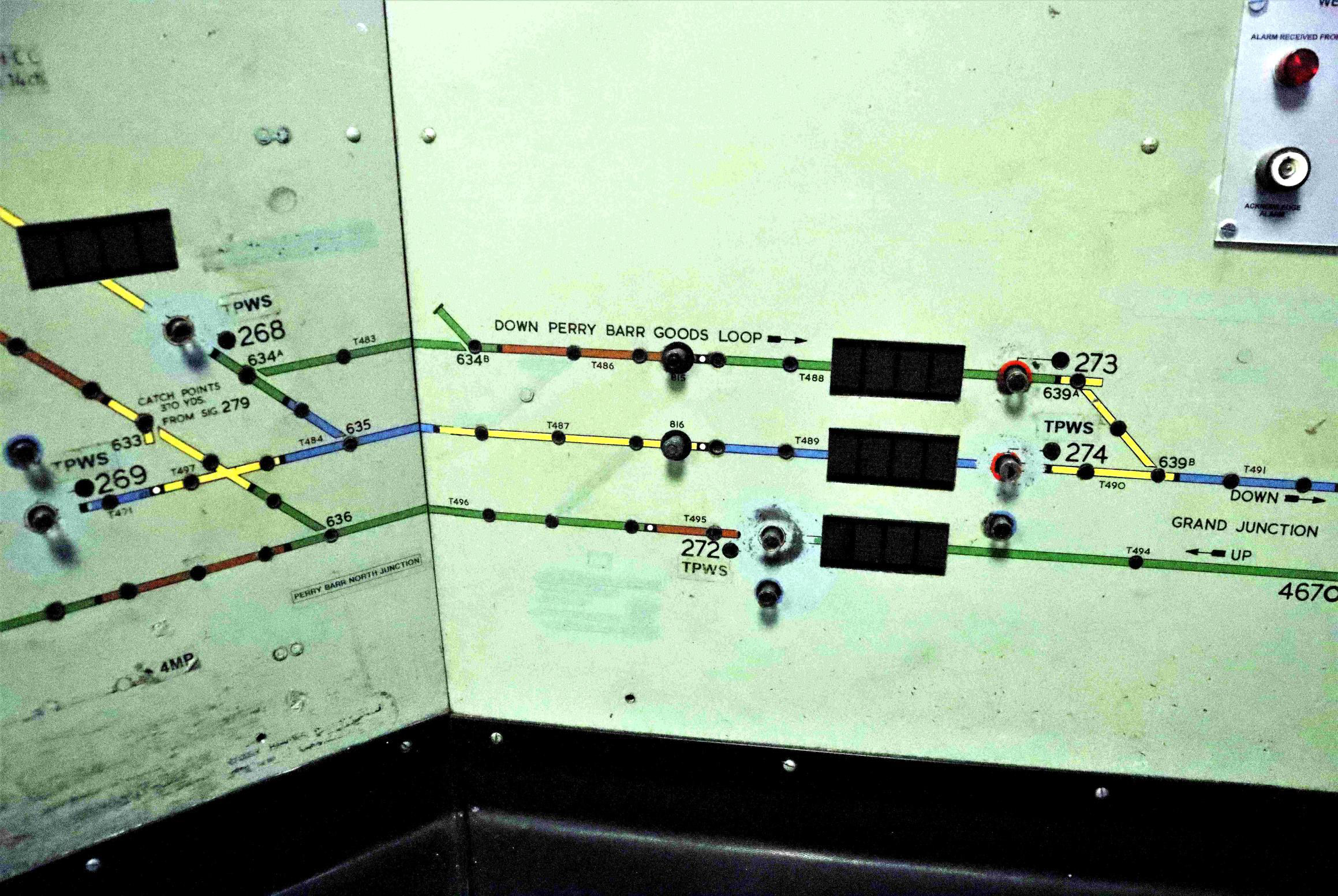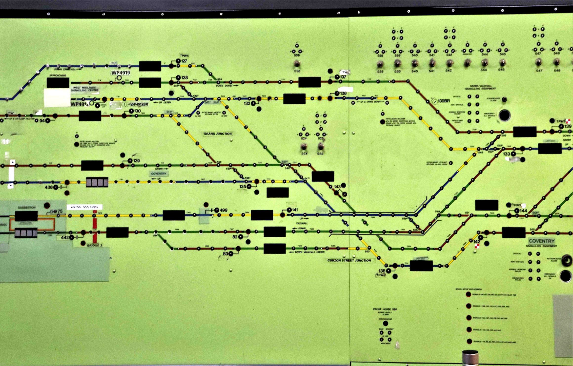 Greeted by our hosts for the Society visit on a very wet Birmingham day, the way the box operated was explained and we first passed the classroom. Several new uses for the box had been suggested, including fitness centre and Airbnb but the hosts were very proud to show the classroom in use for a signalling school, training tomorrow's signallers. Continuing up the narrow stairs, the machine room with its rows of heritage/Museum equipment was next. The 'Westpac' units were explained, labelled to show which area they controlled. The modular system enabled units and other components to be exchanged when faulty ones had been identified which wasn't always simple. The Operating Floor above, with its bird's eye view of train movements at the west end of the station and the surrounding roads, is surprisingly small. The compact panel was worked by a shift supervisor and just a handful of signallers. Like any box of this age, lines added to and removed from the panel over the years were evident. Various local operational constraints were marked on the panel. Our hosts tirelessly described their time operating the panel and explained the finer 'points' of the operation, for example how to avoid conflicting moves. We could try setting routes on the redundant panel and noted the nowadays 'rare' connection from the lower numbered platforms (P5 is the lowest) to/from Holliday Street Tunnel on the Bristol line. It was once used regularly by the Glasgow/Edinburgh - Bristol sleeper trains.