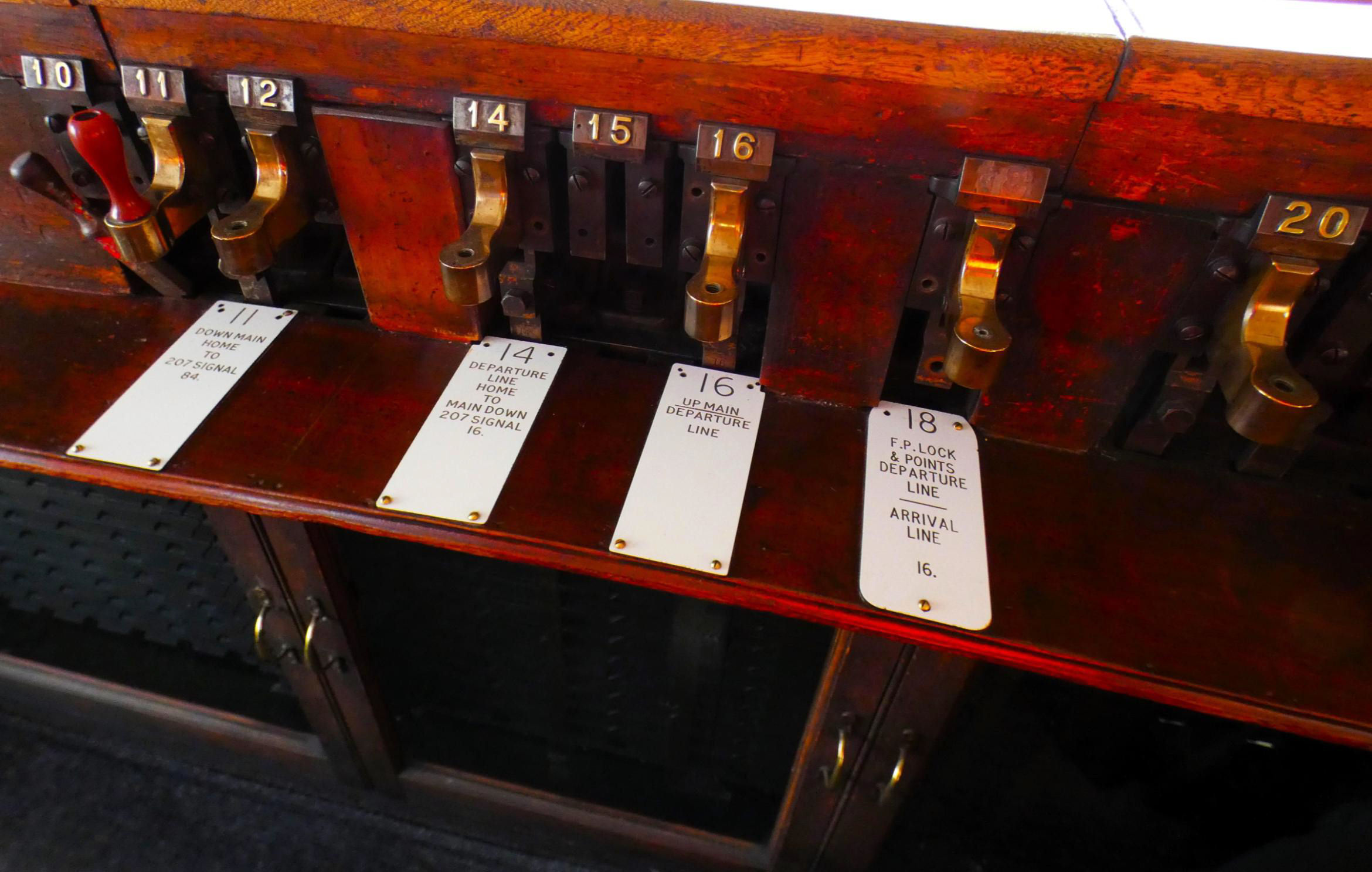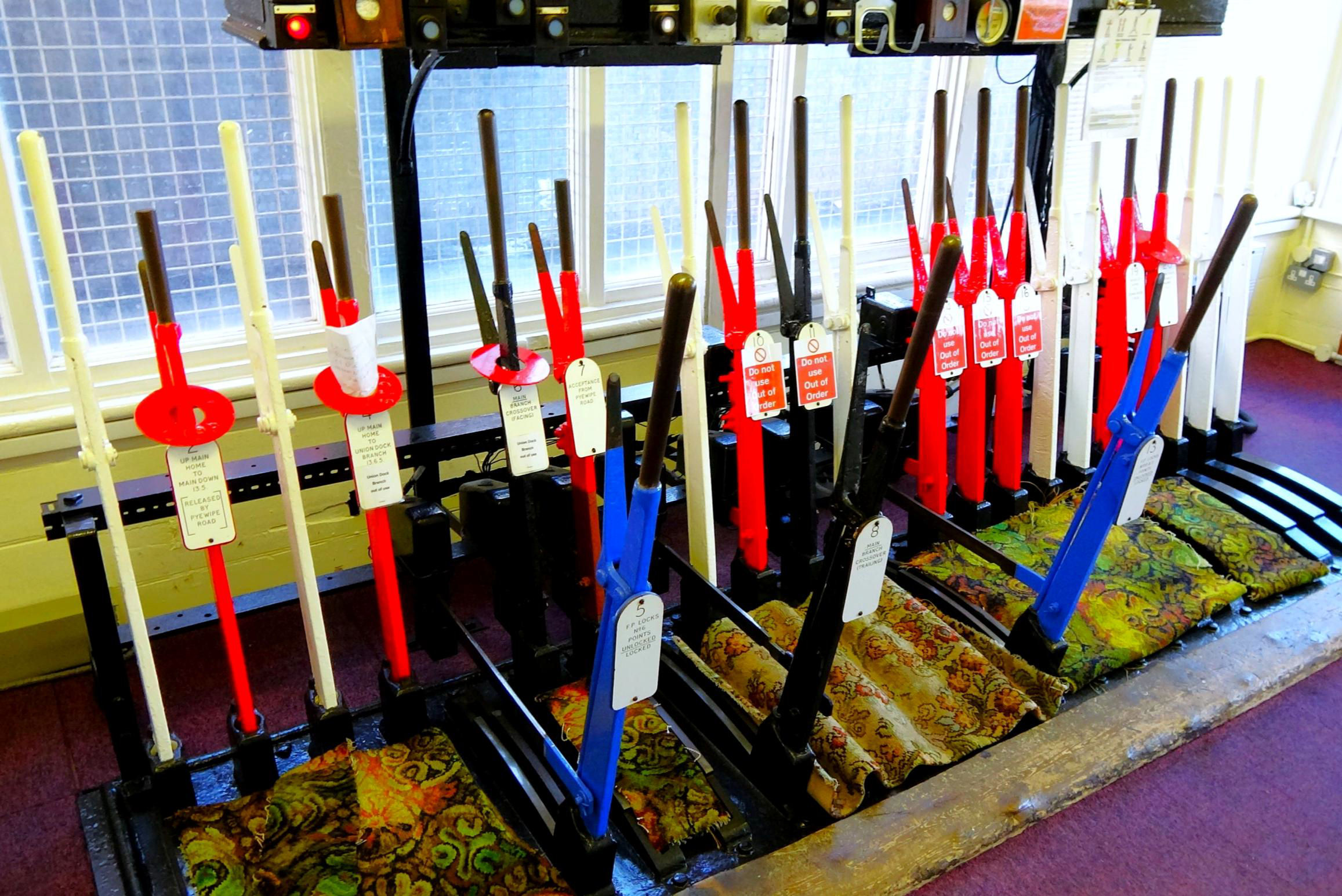 Great Coates No1 (Sidings) frame with no sidings these days and many levers now out of order or spare (painted white).