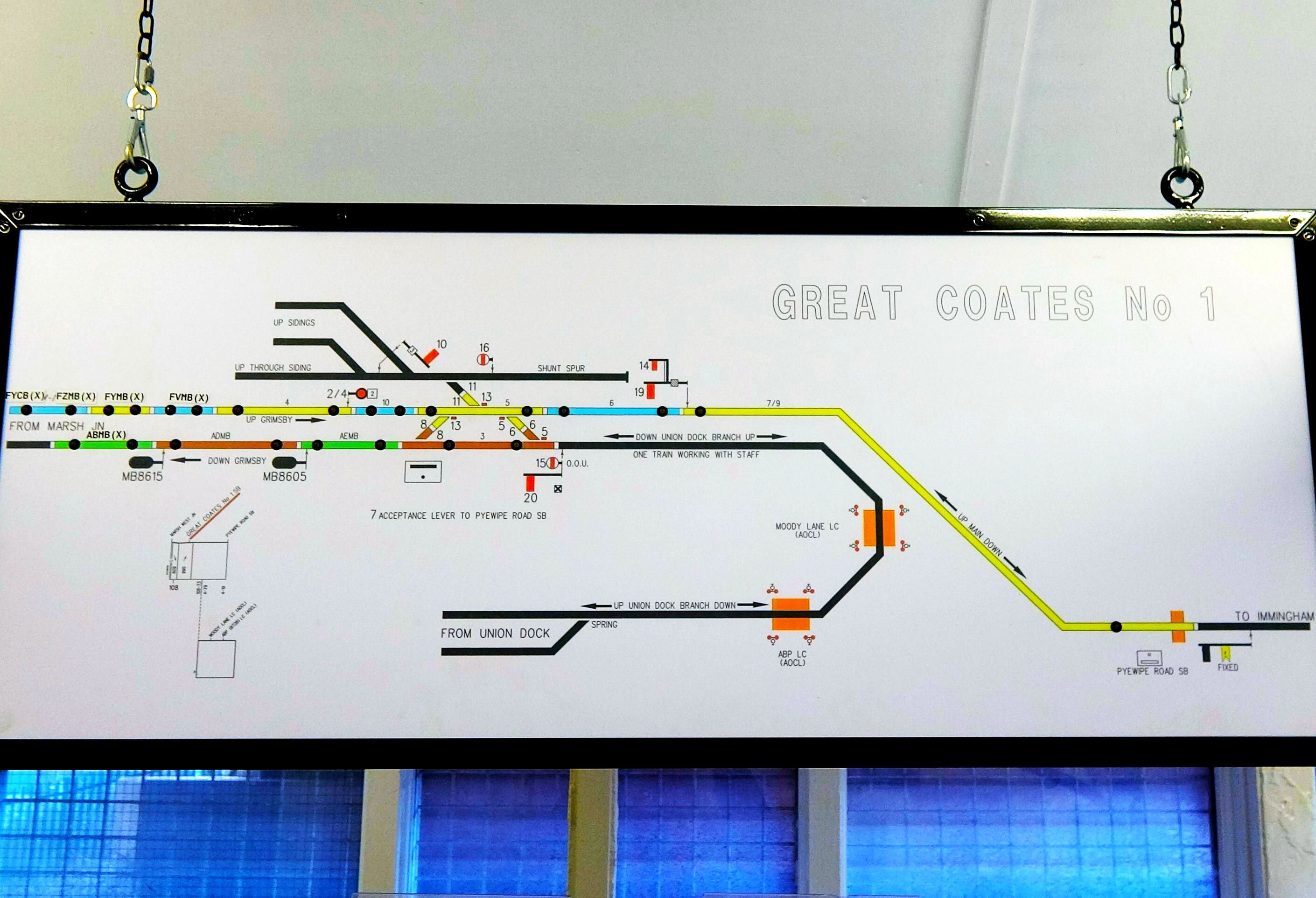 The name board on the surviving box is still Great Coates Sidings No1 but the Sectional Appendix and box diagram refer to it as simply Great Coates No1. The final remnants of West Marsh Sidings were lifted in 2021 but the exit signal GC10 retains its semaphore arm! The branch to Grimsby Docks is still theoretically available for traffic but hasn't seen any for many years. The last working appears to have been a Class 60 light engine on Sat 10 Jan 2016 during a North Lincolnshire 'railtour' to test the new signalling. The most recent public railtour, on 11 Apr 2015, was the 'Humber Sceptre' (UK Railtours).