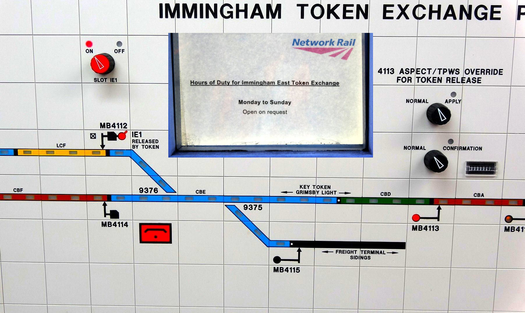 This system is referred to as Normal Contact and Home Normal Contact (NC/HNC). For westbound movements from Pyewipe Road, this means that York ROC MB4111 and MB4113 signals must be showing yellow and red respectively before Immingham TEP can accept a train from Pyewipe Road. In case of a lamp or TPWS failure on either signal, Immingham TEP panel includes overrides to allow a token to be released. Finally, Immingham TEP also supervises three automatic crossings (two AHBs and one AOCL). Indicators (but no controls) for the AHB crossings are provided on the panel.