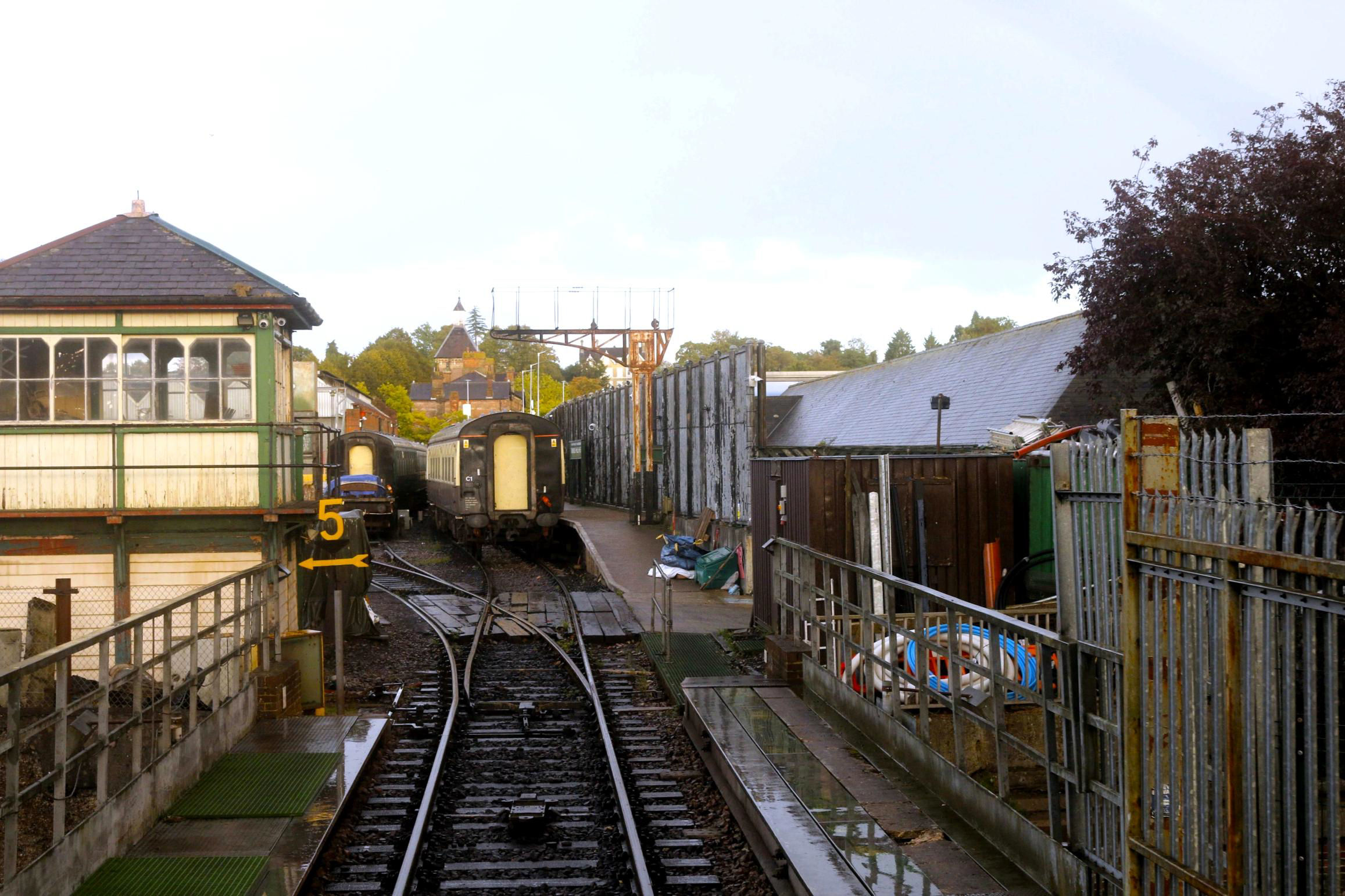 Tunbridge Wells West loco shed and yard; from the brakevan which is on the Coal Line; points are being changed and secured for our tour.