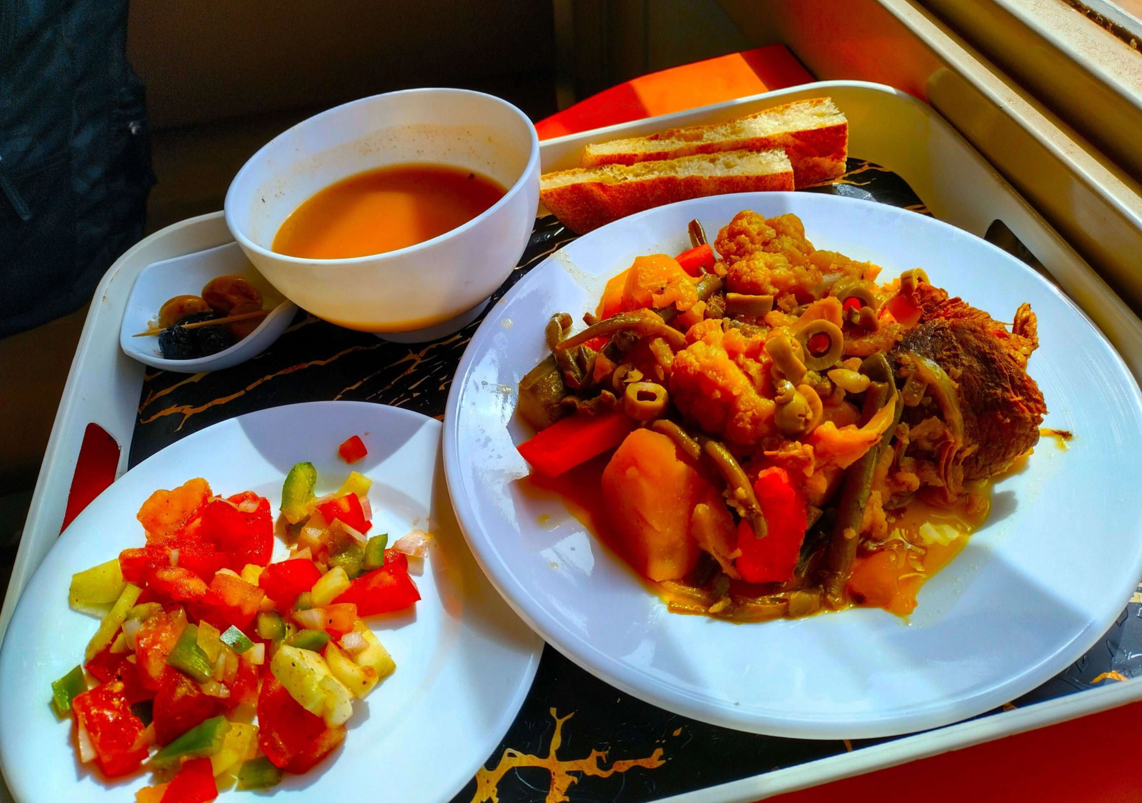 The restaurant served us soup, then a traditional Moroccan dish called Mechoui, which is (very) slow cooked lamb with rice and vegetables. Edi claimed this was the peak of Moroccan cuisine. Certainly there was plenty of it, followed by a dessert (well deserved after all that desert) and fruit. We had arrived at Bouárfa at 18.28, almost two hours late, so the original departure time of 19.00 was never going to happen. In the event we were driven back to the train, departing at 21.07, with DH367 now powering it assisted by DH411 up the bank out of Bouárfa. Most participants used the four berth couchette compartments but a surprising number of passengers opted for seats in the B10 coach where the lights were turned off, affording an opportunity to gaze at the Milky Way in the night sky, completely devoid of any light pollution. They also noticed that we stopped at one station until the police car showed up, then set off again. We were awoken shortly after 05.00 to tell us we had arrived back at Oujda and over the next hour set off in dribs and drabs to the Ibis hotel where breakfast had been arranged for all tour participants.