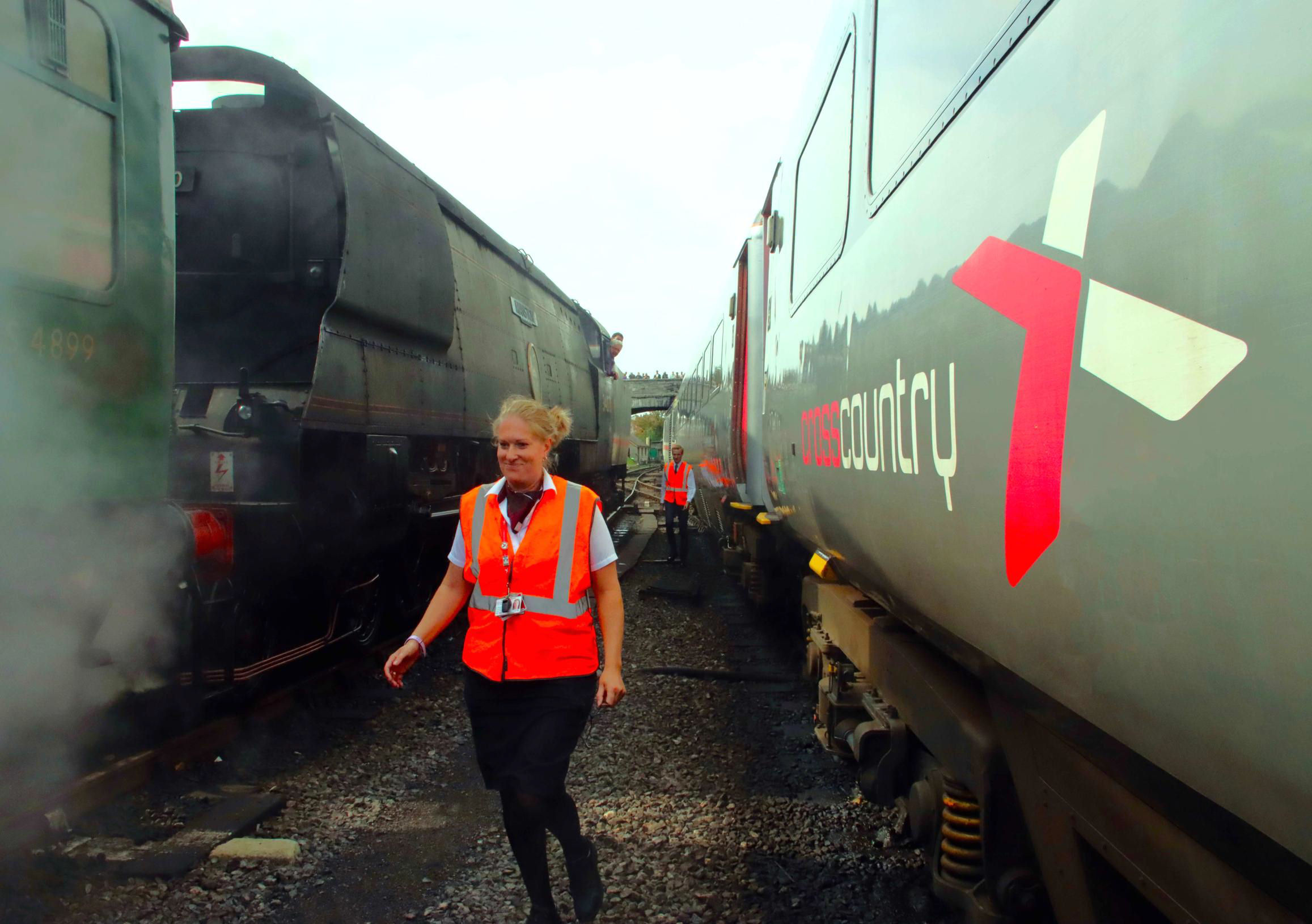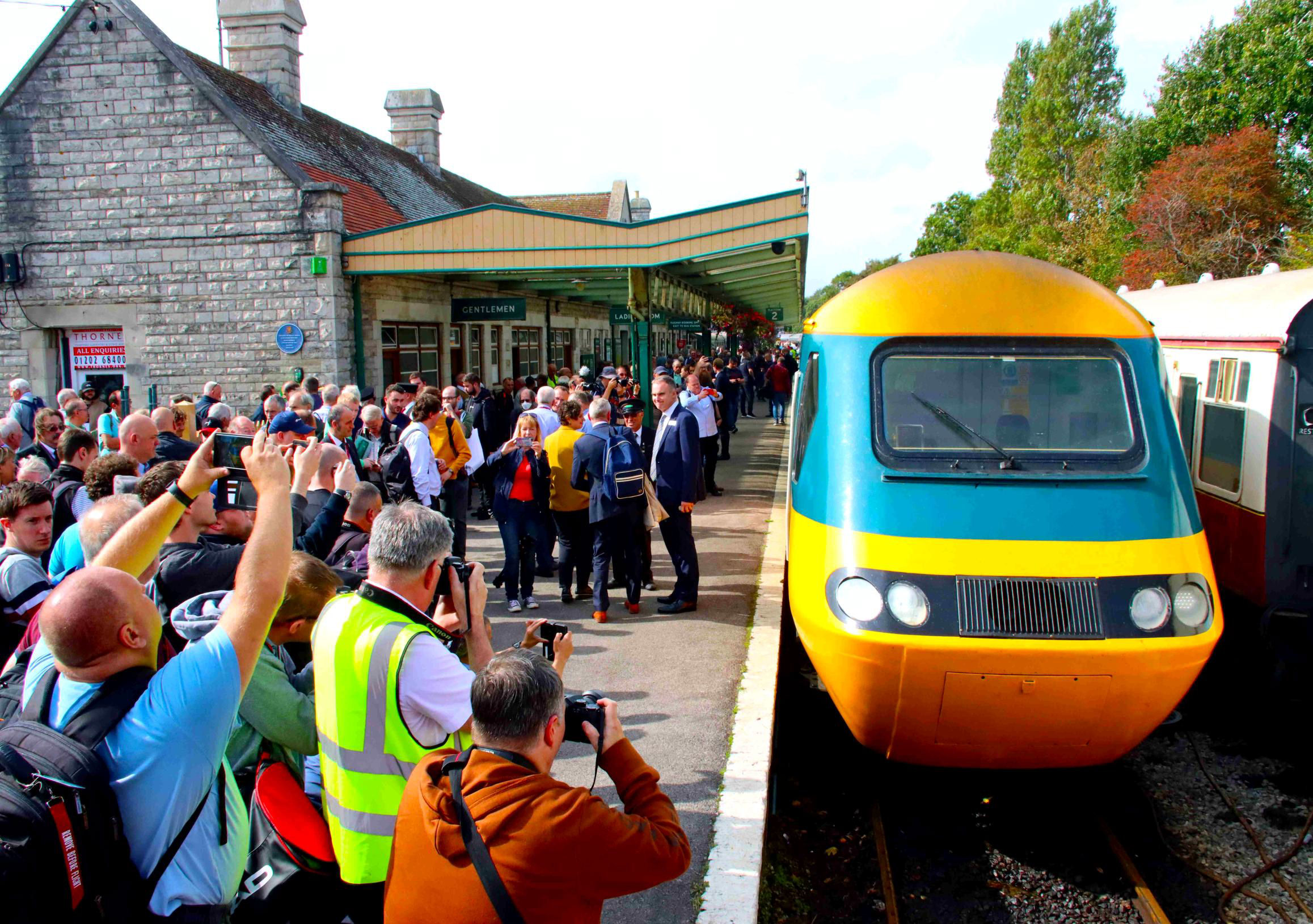 Swanage Railway services were provided by 34070 'Manston' and allowed people to enjoy steam haulage and visit Corfe Castle while the HST made a return trip to Bournemouth during the afternoon. This mini-trip had been heavily advertised in the local press and social media, bringing out a large number of 'Normals' including many couples of all ages. They were thoughtfully seated in coaches with other couples by Martha Haggas, who had her work cut out with over 1,000 bookings to organise.