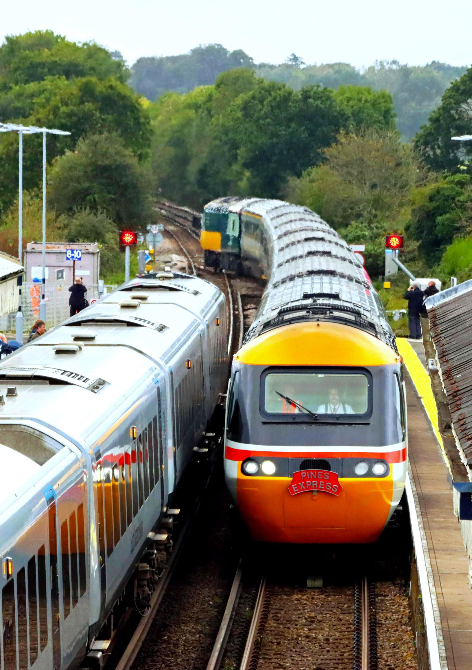 136 participants from the 'Pines Express' did both trips. There were a large number of spectators and photographers out along the Swanage Railway and here the weather was sunny unlike the heavy rain further north. Bournemouth was full of trains because an incident had closed the line at Moreton. This resulted in an interesting move, arriving on the Up Main; after passing P4 and the centre servicing platform, the HST took the connection right over to Down, London end P3, to reverse. There was a unit in P4, so after reversal that connection was done in the other direction, then the trailing crossover was taken at Wimborne Road Cemetery Jn to bypass it and join the Down Main. There was no time for a break at Bournemouth and the turn rounds were tight at Swanage in both directions. At the terminus, with such a long train, some of the coaches were not platformed but this was well managed by the onboard team. Around 380 passengers managed to alight and 380 joined in the limited time available.