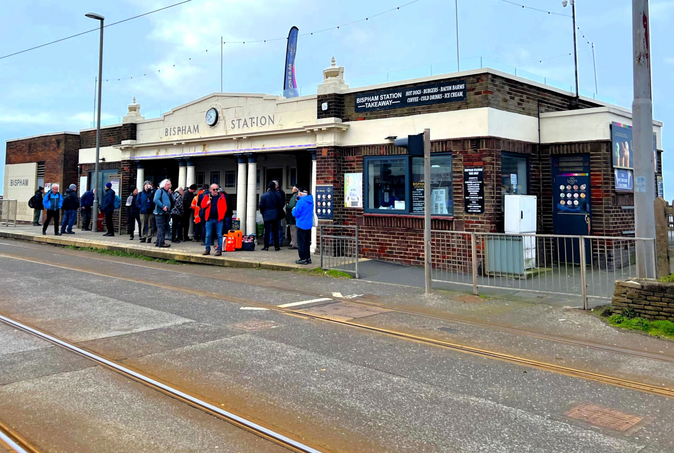 After precisely 8 minutes, a loud bang and flash accompanied by smoke, (with the knowledge that it wasn't November 5th!) was the precursor to a major change of plan. Our driver announced that the 'main roof fuse had blown'. Fortunately, thanks to his skill and knowledge we managed to gravitate to Bispham for a replacement tram (or possibly an engineer to fix 736, by now parked on the normal northbound running line of the three track section). This meant that 'Normals' (plus Kev Adlam) were able to do the very rare centre road on service trams to pass our stricken vessel. An hour passed, with many taking advantage of the small coffee bar (the proprietor was delighted with the extra business) in the building grandly labelled 'Bispham Station'. Others of us enjoyed the fresh air but increasingly perhaps feeling not so much the fun as the cold breeze. Thankfully, no one got wet with this order to 'abandon ship!' - the day's promised rain not in fact arriving until well after the tour was over.