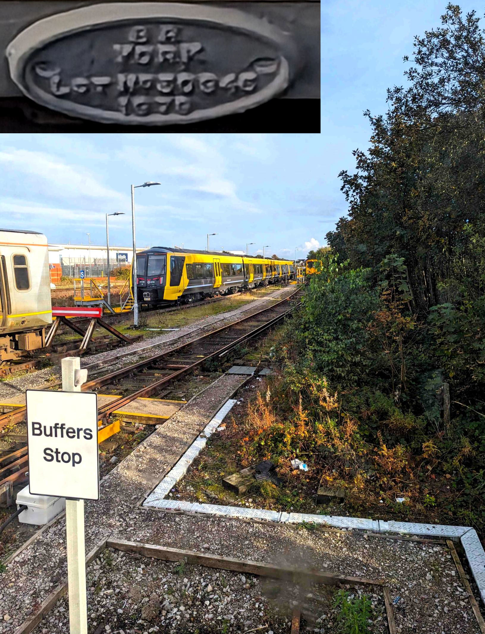 Through a train window, at the end of Birkdale Carriage Siding 4 at Southport. INSET: Manufacturer's plate BR YORK 1978 with the Lot Number.
