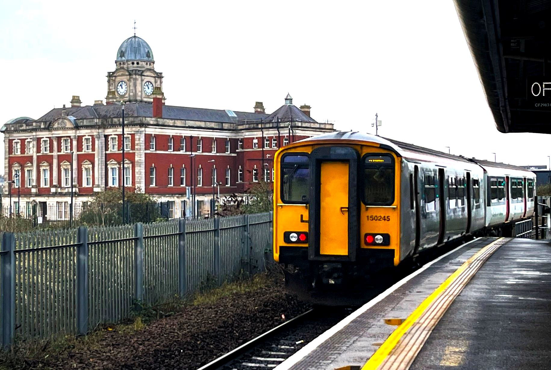 Our group's train departs from Barry Docks towards Barry with the former Barry Docks Office building left (open daily, free admission).