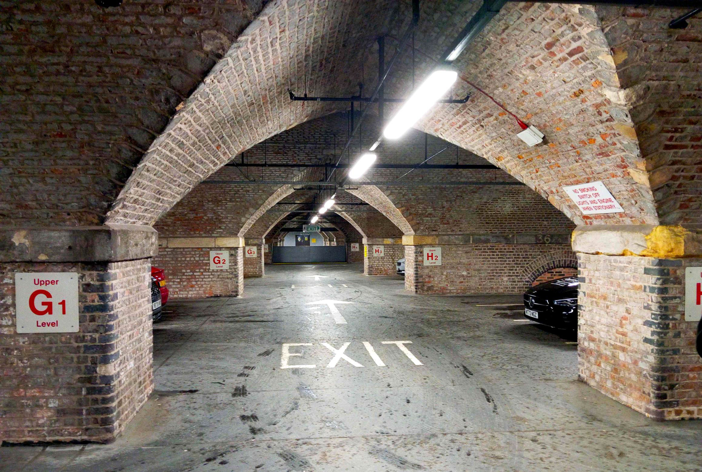 As we had a few minutes in hand, we were able to explore the undercroft at Central, originally used for handling goods. In contrast to the situation at Piccadilly, it is clean, lit and fully accessible, having been restored as a car park, with the installation of a mezzanine concrete parking level. Unlike St Pancras where the platform level is carried on iron girders, Central sits on very neat Gothic brick vaulting.