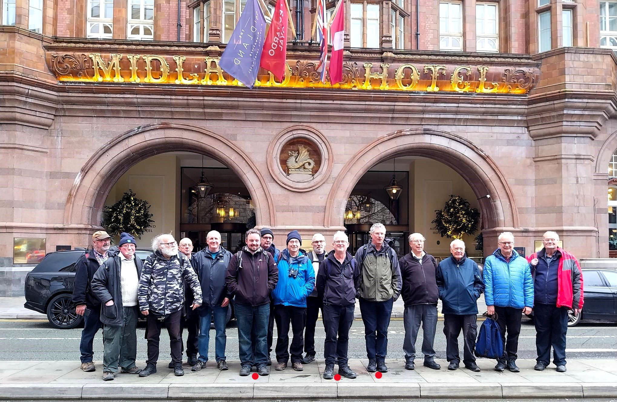 An identity parade outside the Midland Hotel twin arches (see text for relevance), Manchester. 'Spotted' left to right are Adam Turner (guide), John Cameron (NW BLN Editor & Committee Member) & John Hampson (Committee Member).