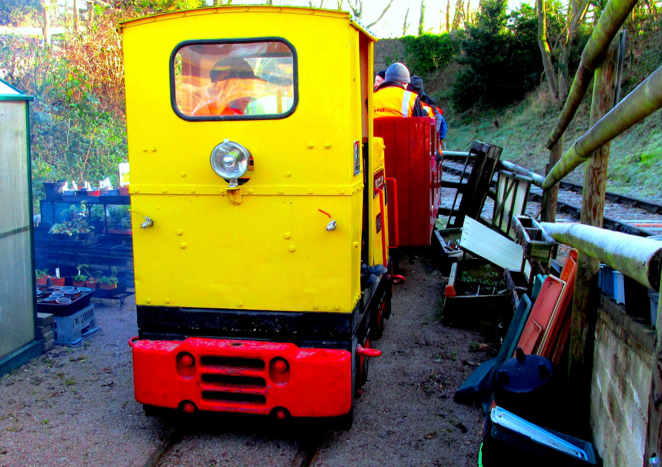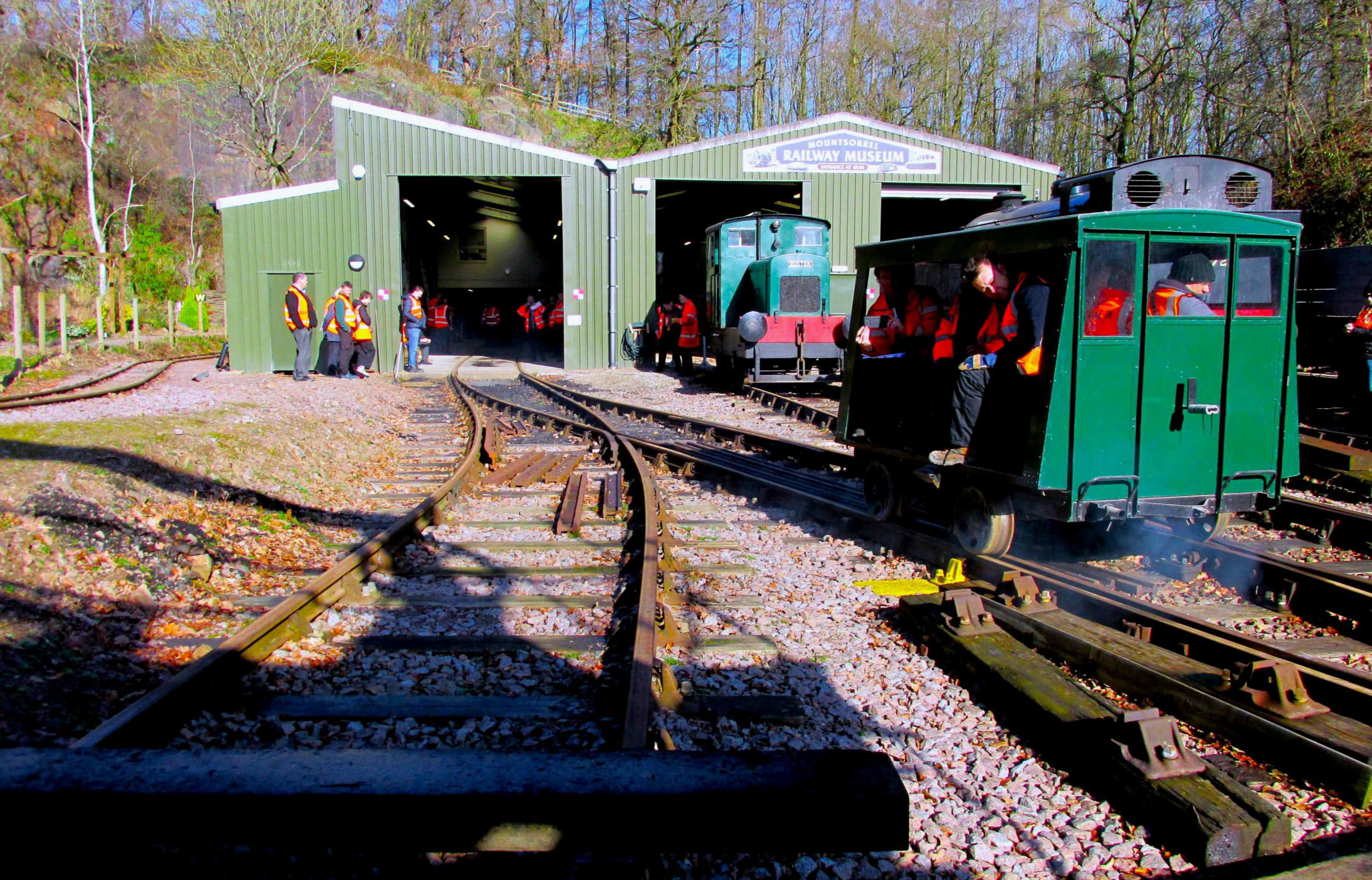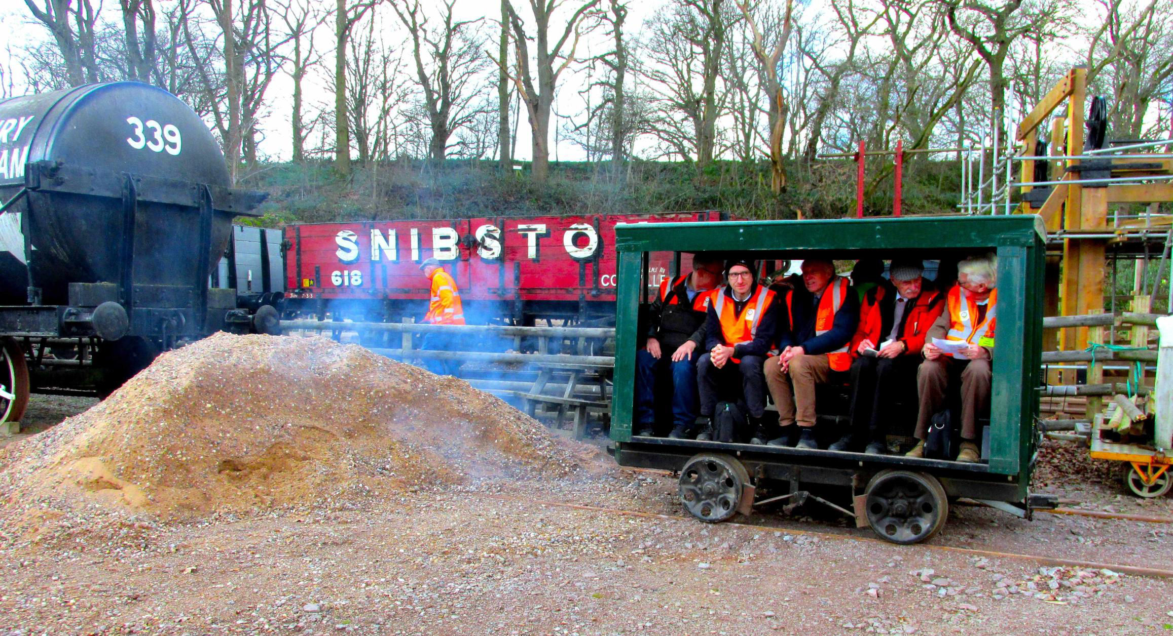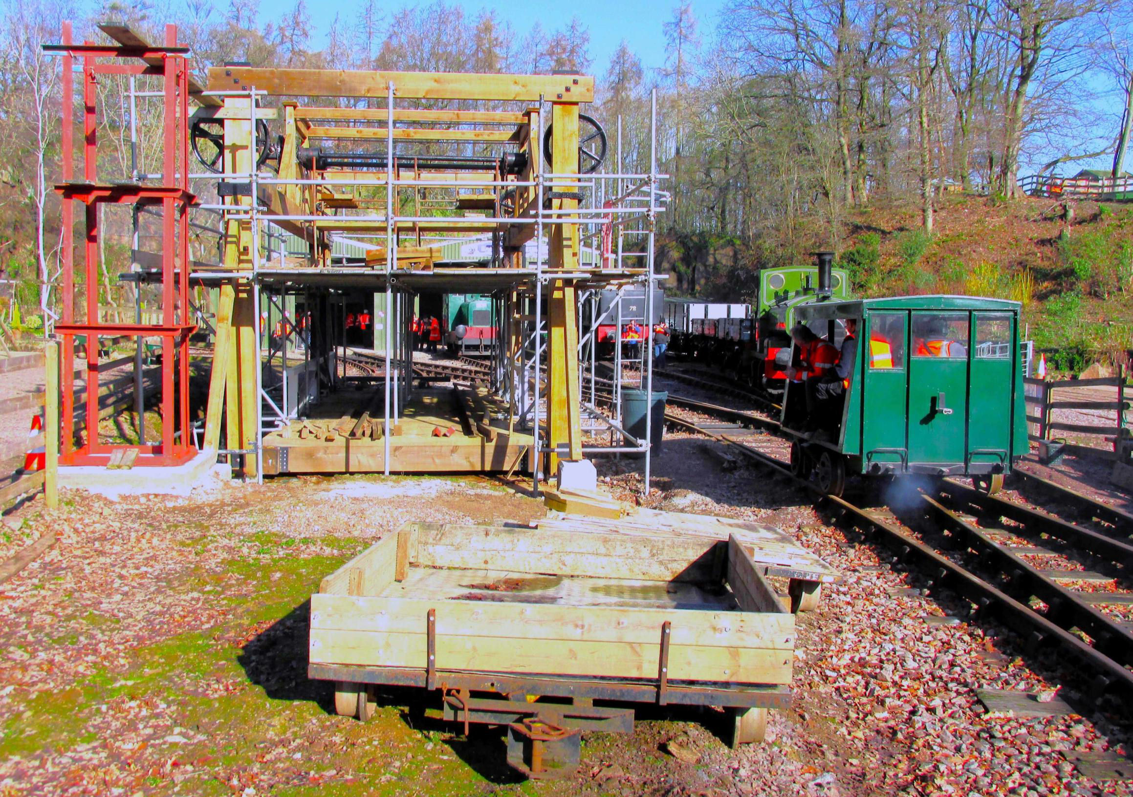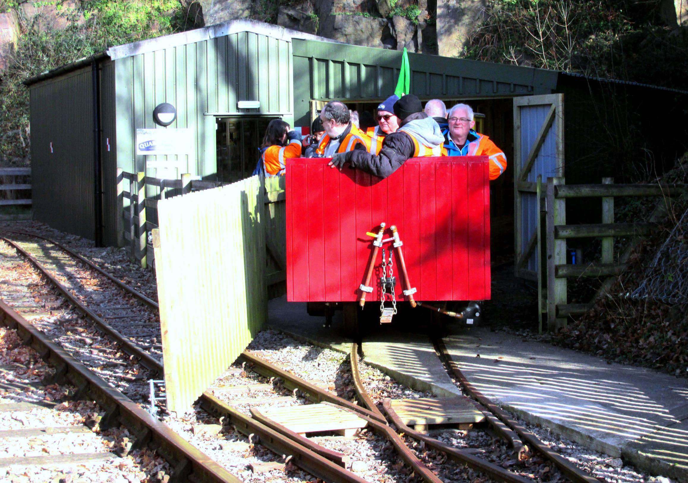 Next was the 'Water Crane Siding' (guess how this was named‽, running behind almost the full length of Nunckley Hill platform, at a lower level. Participants could see isolated semi-buried remnants of an abandoned and mostly lifted NG line from Greenhouse Siding towards the end of Water Crane Siding. On some plans it gave the impression of forming a large triangle but was never connected to Water Crane Siding. On the return run, there was haulage into the end of the single road Carriage Shed, which involved crossing the path round the outside of the former quarry bottom on the level. Cleverly, this section was done before the public was admitted to the site. Returning to the NG station, after a quick turnaround, it was 'rinse and repeat' - four trips in total were needed to accommodate everyone. With practice, it became a slick operation by the enthusiastic Mountsorrel volunteers (a minimum of 10 were required). The 'Full Dress Rehearsal' of the moves the day before (ECS), in the pouring rain, had perfected and timed everything, such was their dedication to making sure we achieved everything.