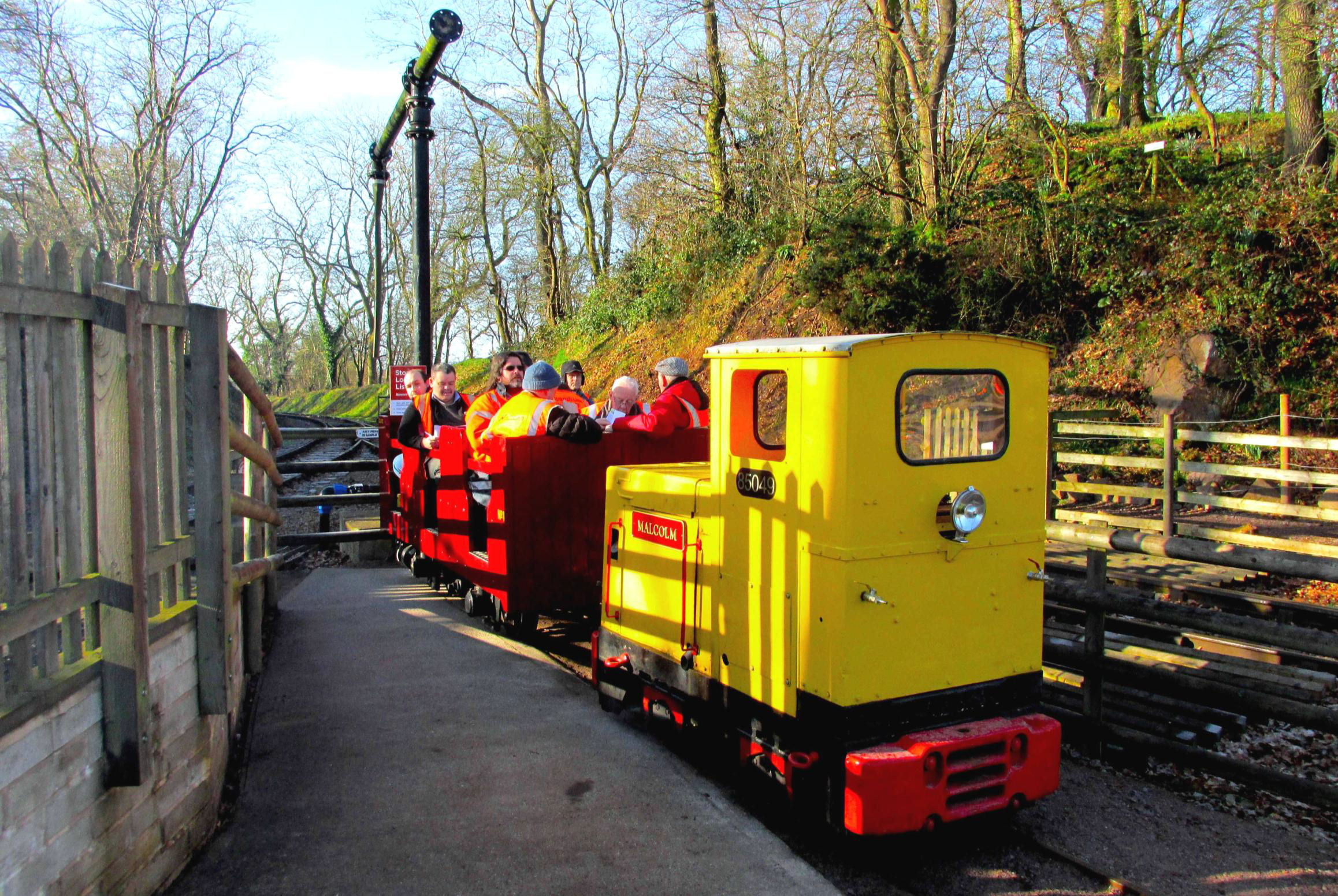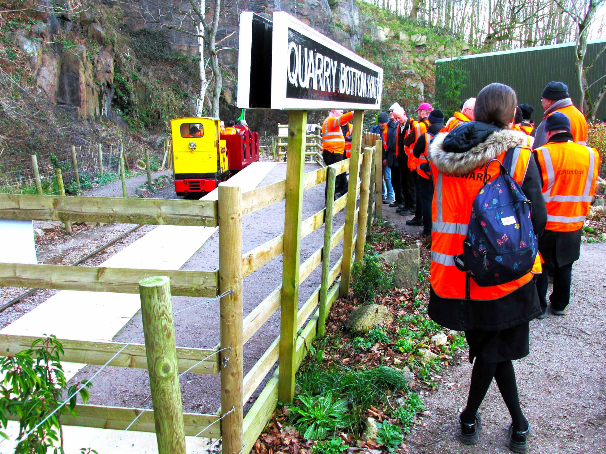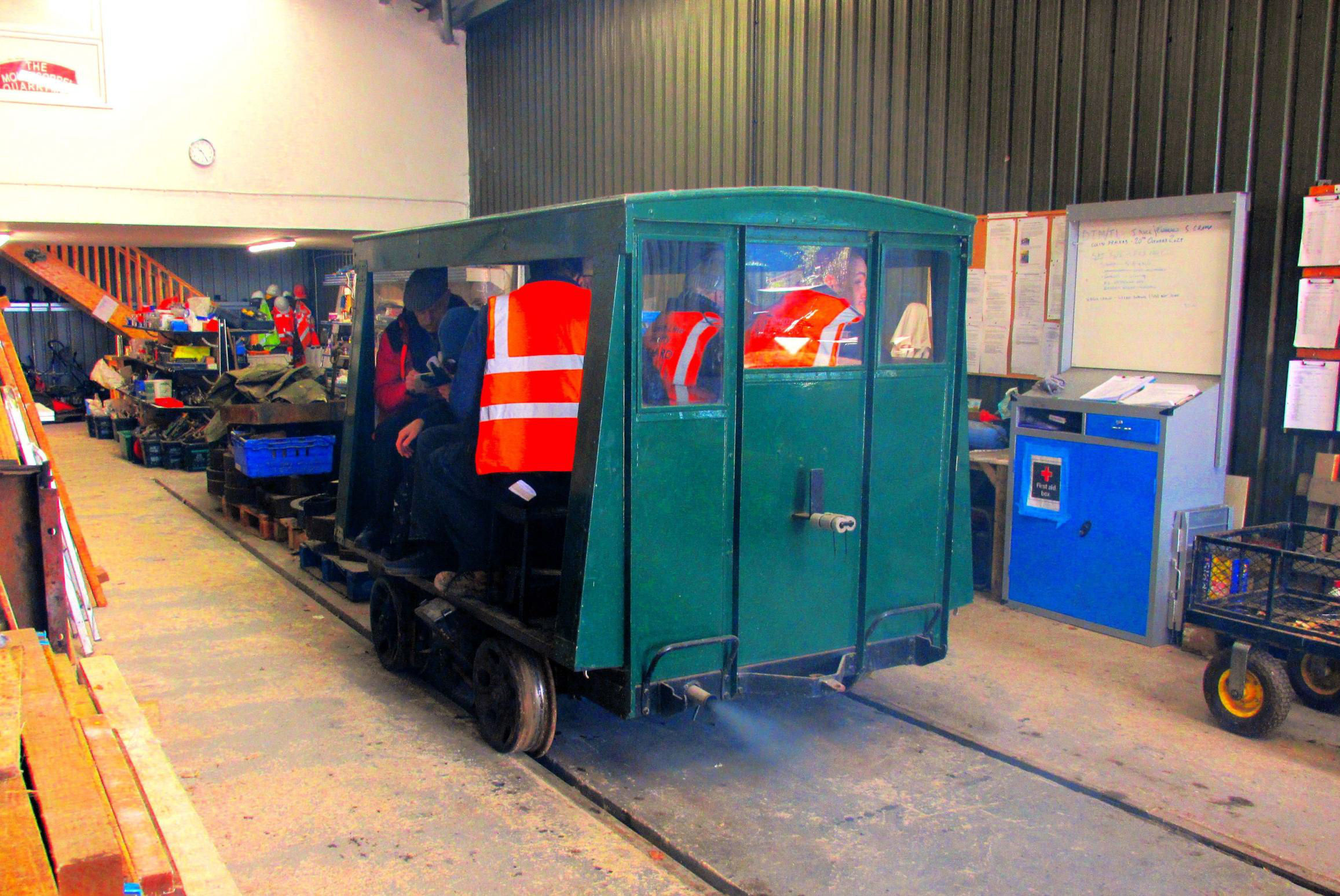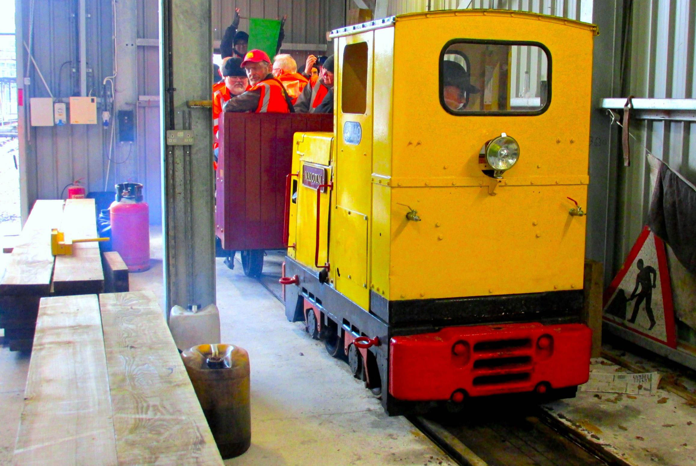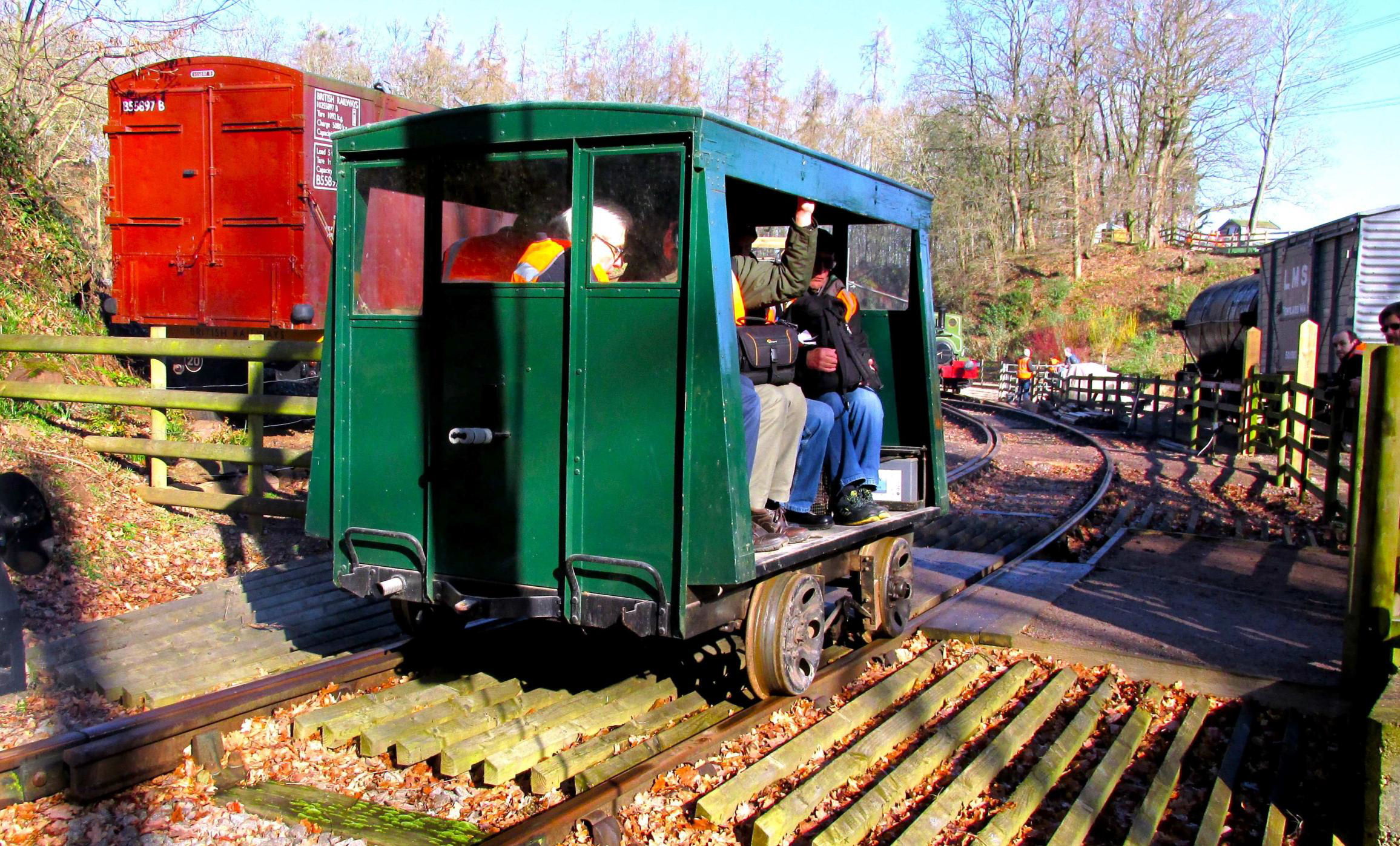Next was the 'Water Crane Siding' (guess how this was named‽, running behind almost the full length of Nunckley Hill platform, at a lower level. Participants could see isolated semi-buried remnants of an abandoned and mostly lifted NG line from Greenhouse Siding towards the end of Water Crane Siding. On some plans it gave the impression of forming a large triangle but was never connected to Water Crane Siding. On the return run, there was haulage into the end of the single road Carriage Shed, which involved crossing the path round the outside of the former quarry bottom on the level. Cleverly, this section was done before the public was admitted to the site. Returning to the NG station, after a quick turnaround, it was 'rinse and repeat' - four trips in total were needed to accommodate everyone. With practice, it became a slick operation by the enthusiastic Mountsorrel volunteers (a minimum of 10 were required). The 'Full Dress Rehearsal' of the moves the day before (ECS), in the pouring rain, had perfected and timed everything, such was their dedication to making sure we achieved everything.