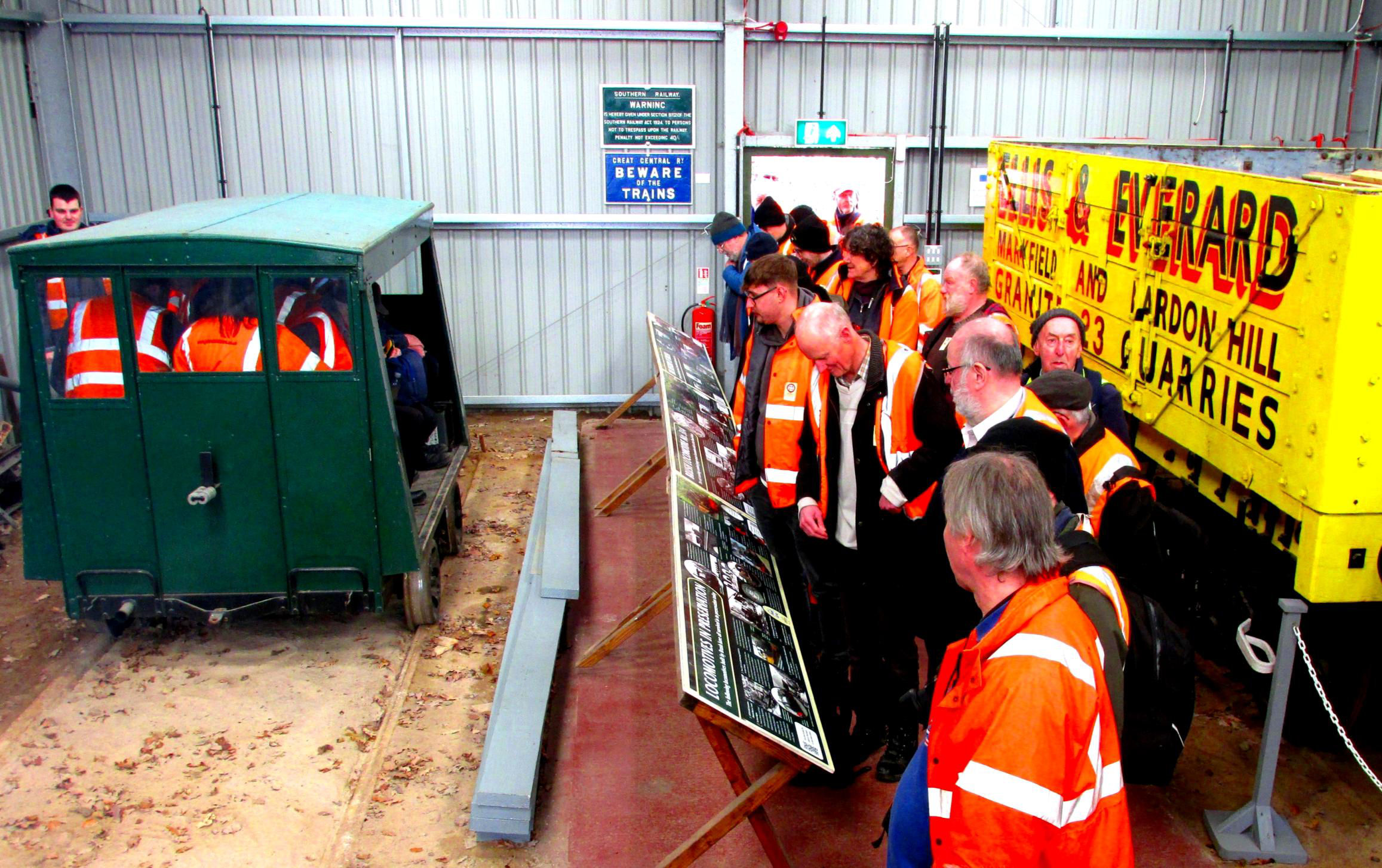 As one who doesn't drive, this fixture, despite being relatively local, needed an overnight stay with a friend in Northampton. An early start involved the 05.10 bus from Northampton Bus Station to Leicester via Market Harborough which took 1hr 20mins. This left time in the City for breakfast in a local Greggs before catching a second bus from St Margarets Bus Station to Mountsorrel. I was there for the 08.04 departure but time came and went and no bus arrived. Not to panic though, as there is a 15 min frequency on this route and my schedule allowed wriggle room. I alighted on Loughborough Road, the main one through Mountsorrel, at 08.49 for a 20 min walk to the Heritage Centre. The sun was out and this set the tone for most of the day. In the car park, we were met by Alan Sheppard, who made sure everyone had an orange hi viz vest (lending them out if needed) and gave everyone stickers allowing admission (included in the fare). We were delighted to even welcome Member 13 from Pevensey, so it must have been interesting!