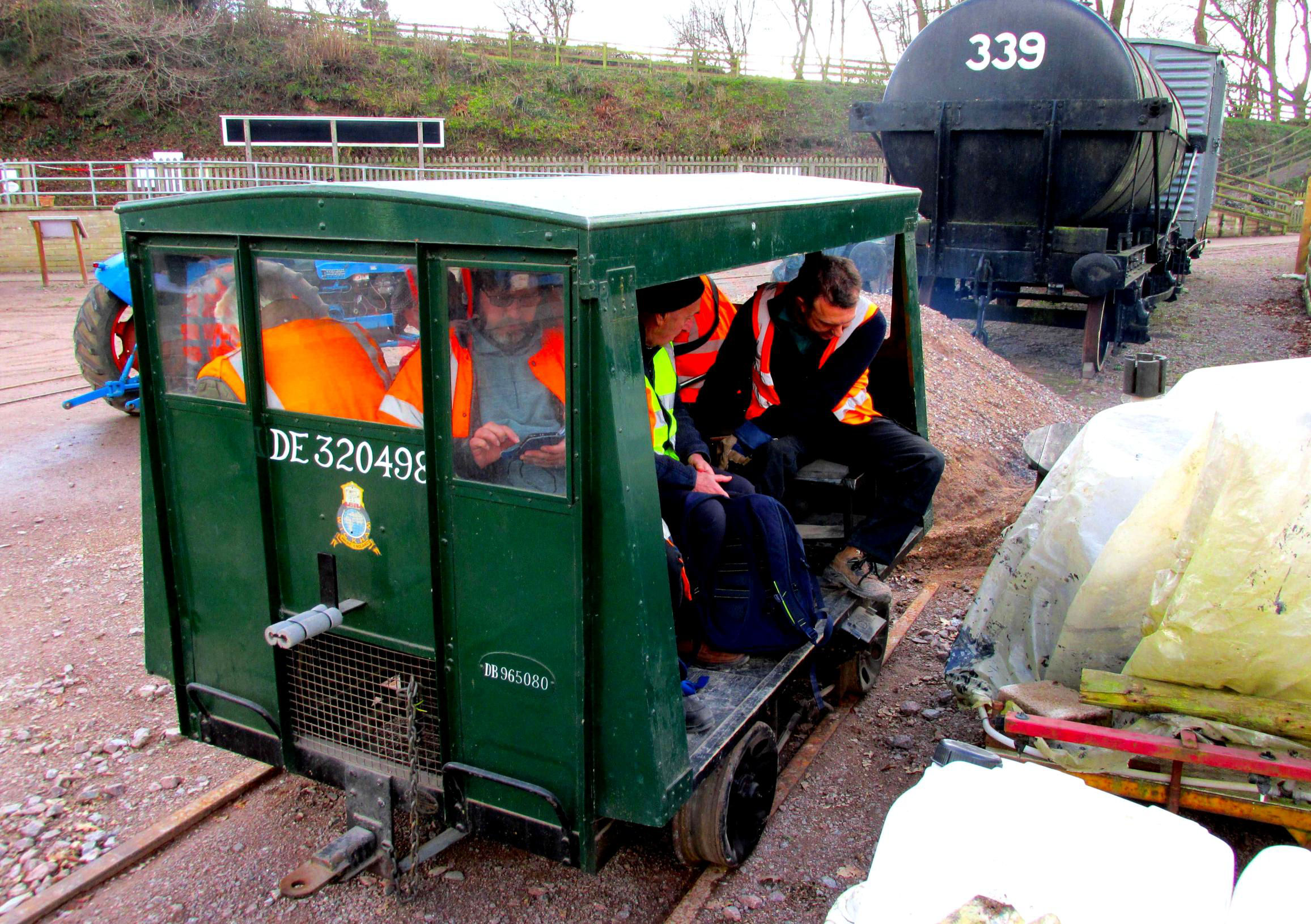 There was then a short break for shunt moves to clear all of the museum items from Road 3, using 'big' Ruston, 48DE 393304; like its little brother, also built in 1956 and delivered to Bardon Hill Quarry. The Wickham then reached the very end of the line here. On Road 4 a brakevan blocked access to the end but we did what we could as well as Road 5 to the end along the outside of the shed, adjacent to the NG branch done first thing. We also ran back along the Loading Siding to a static immovable oil tanker and 20 tons of aggregates piled on the line for the Stephenson lifting bridge reconstruction. It was realised (and forensically analysed by some!) that overlap hadn't quite been achieved due to the stock positioning on the connecting line to clear the Museum. This was rectified after the lunch break...
