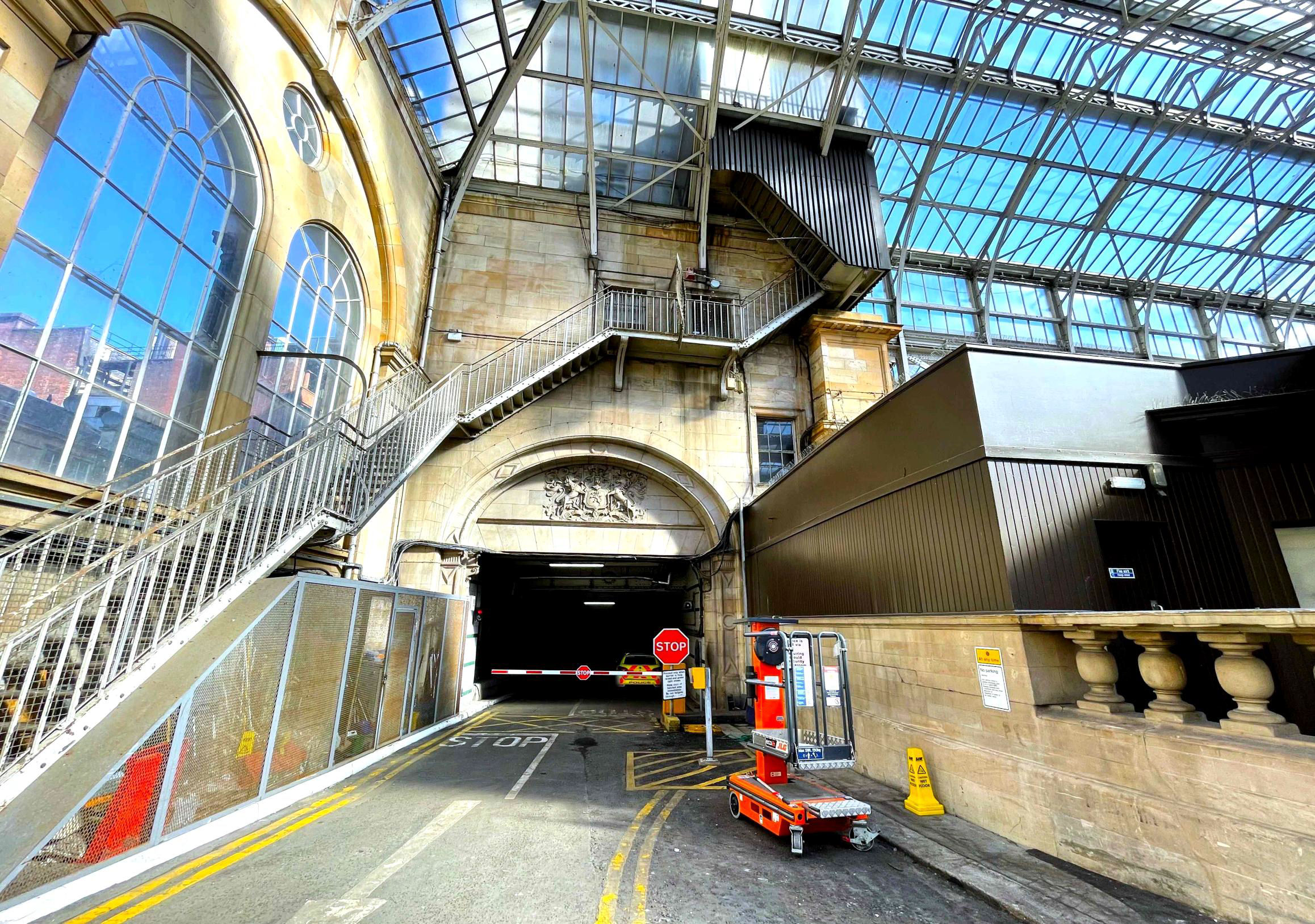 We began with Jackie giving the group a rundown of the station history including details of the huge, glazed roof. We then looked in what is today known as the 'Football Subway', which connects some of the high level platforms and is used to keep football supporters apart on match days. Walking past a set of hydraulic buffer stops, members inspected the former Carriage Road [was it hansom?], latterly used as a pickup and drop off point, with stone coat of arms of the Caledonian Railway high above.