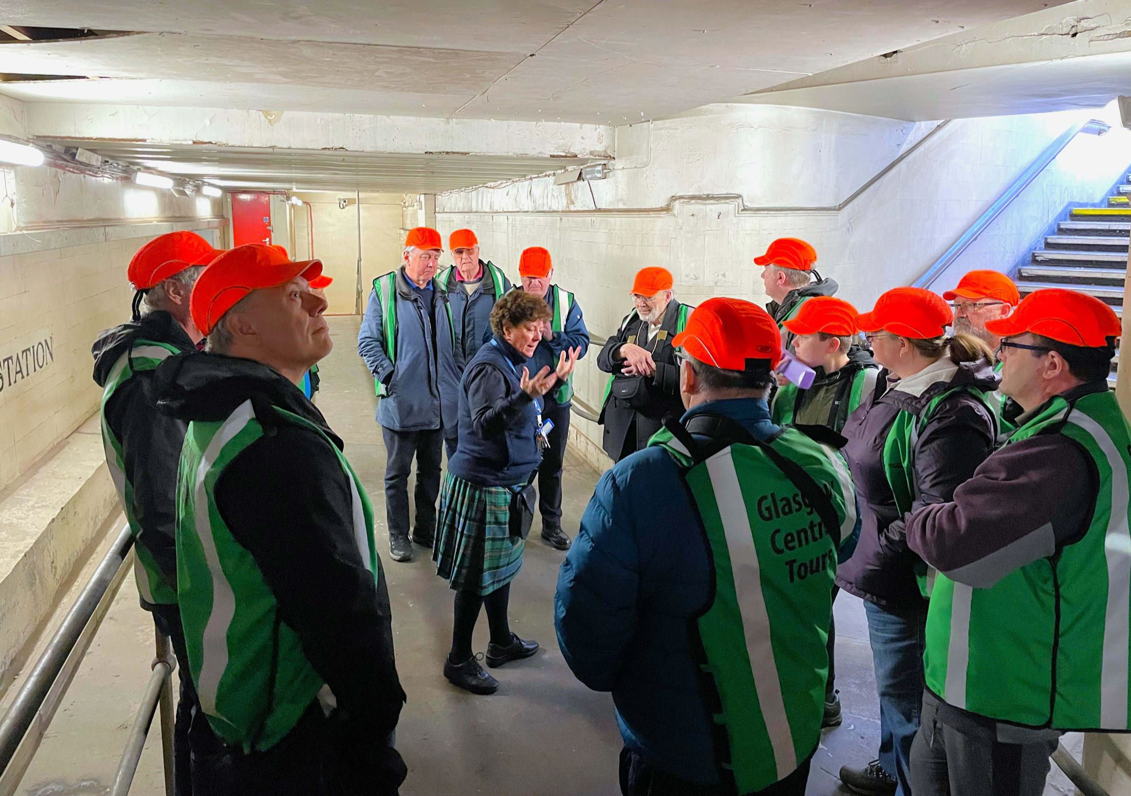 Having completed our tour and bid farewell to Jackie, a slightly smaller group then walked to St Enoch (subway) station to take the 'Clockwork Orange' (will it still have that nickname after the new trains are fully in service?) to Kelvinbridge. At St Enoch we stopped to see the remaining previous subway station building dating from 1896. Adam showed the group some old photos of the former imposing St Enoch 1876 mainline terminal. Closed to regular passengers from 27 Jun 1966, its huge roof and the station hotel were demolished in 1974 to make way for the large St Enoch Shopping Centre of today.
