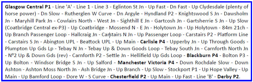 For the record, Glasgow Central to the Carnforth reversal, with 57310, was 180m 30ch (or 63m 08ch from Carlisle). Then, with 57306, it was 77m 08ch on to Manchester Victoria, 129m 69ch to Chesterfield and 154m 03ch to Derby. Calculations are thanks to Jim Sellens, route thanks to Martyn Brailsford.