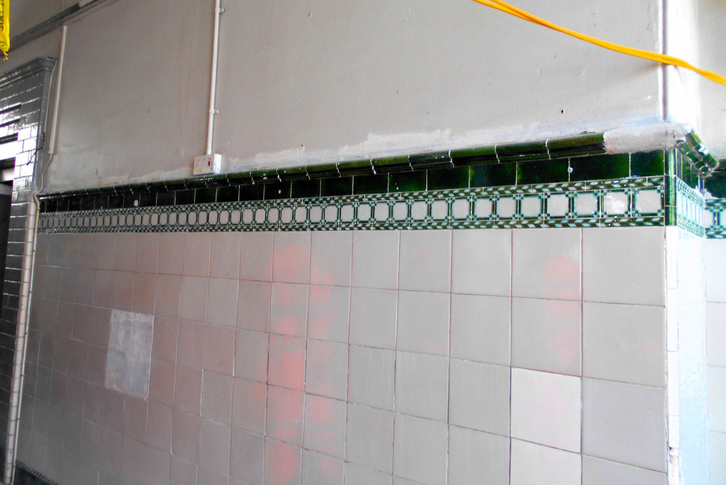 Original tiles by the stairs (as on each floor level), mostly painted over, they are to be restored.