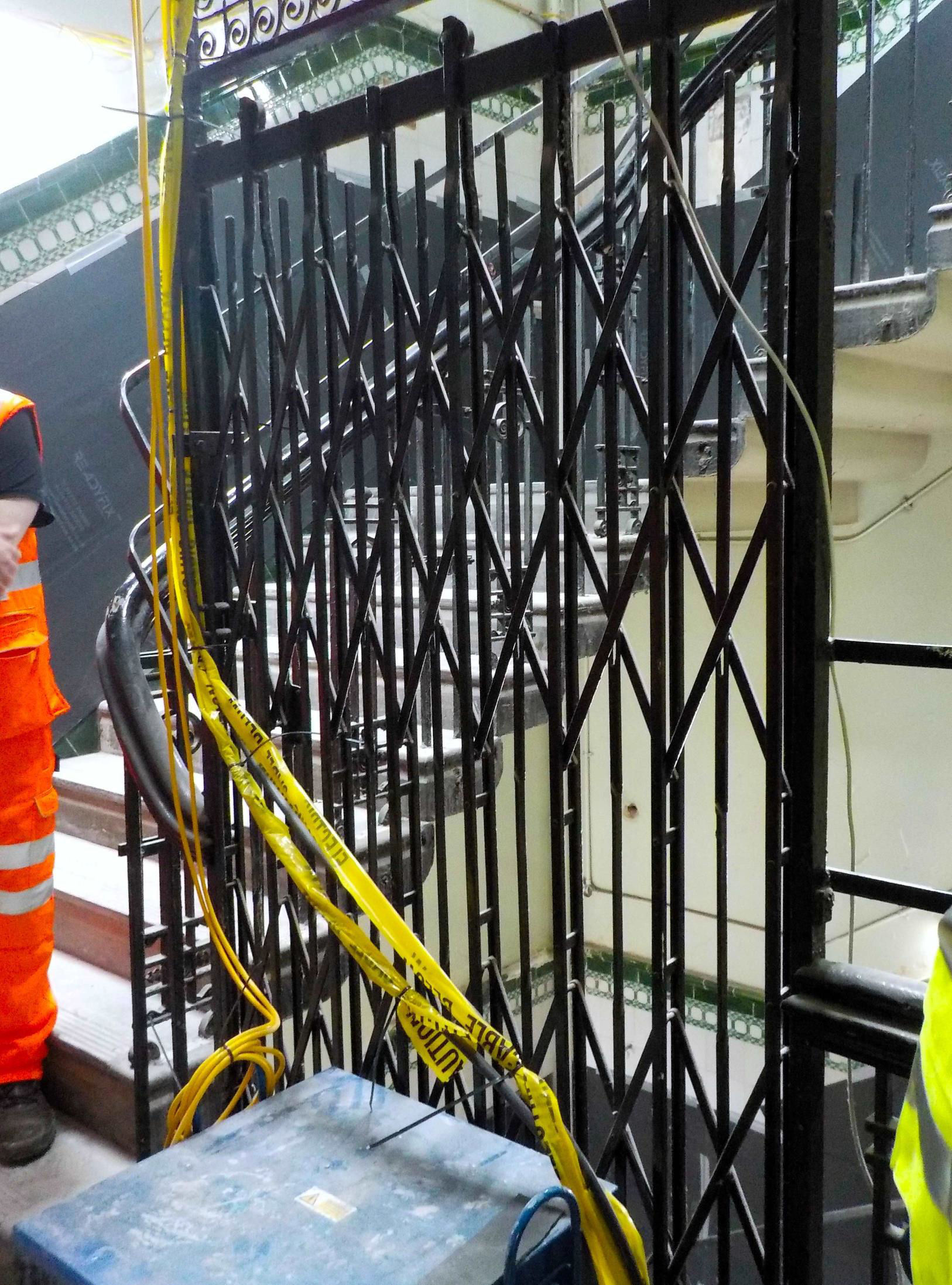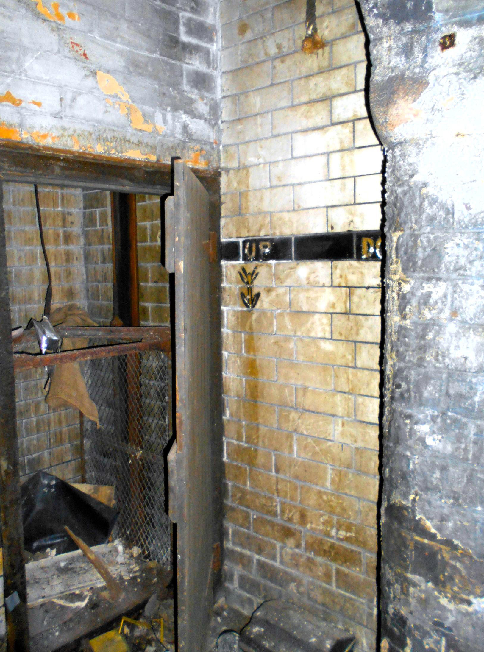 The lift housing on the second floor, note the original tiles in the background, some now protected.